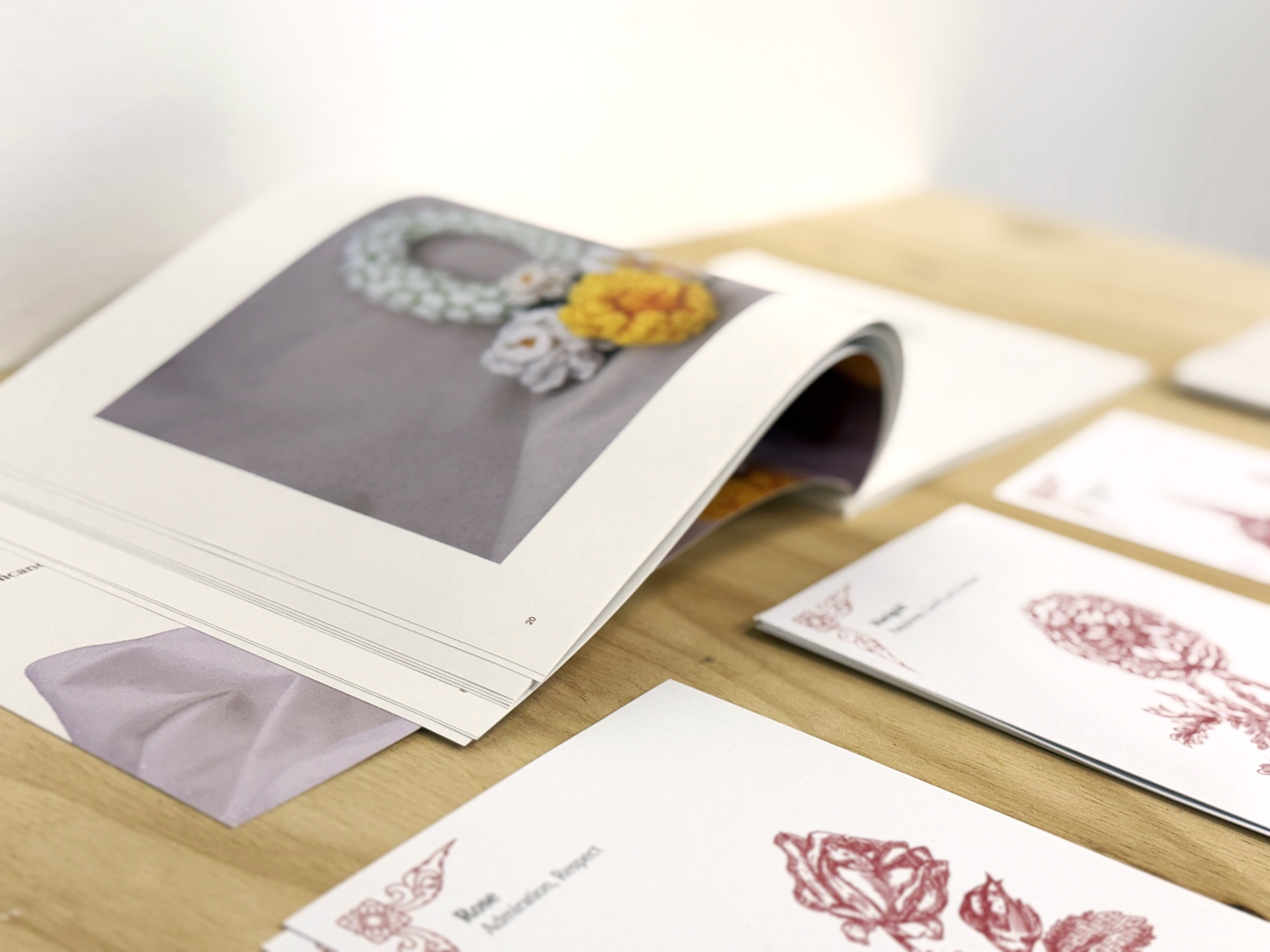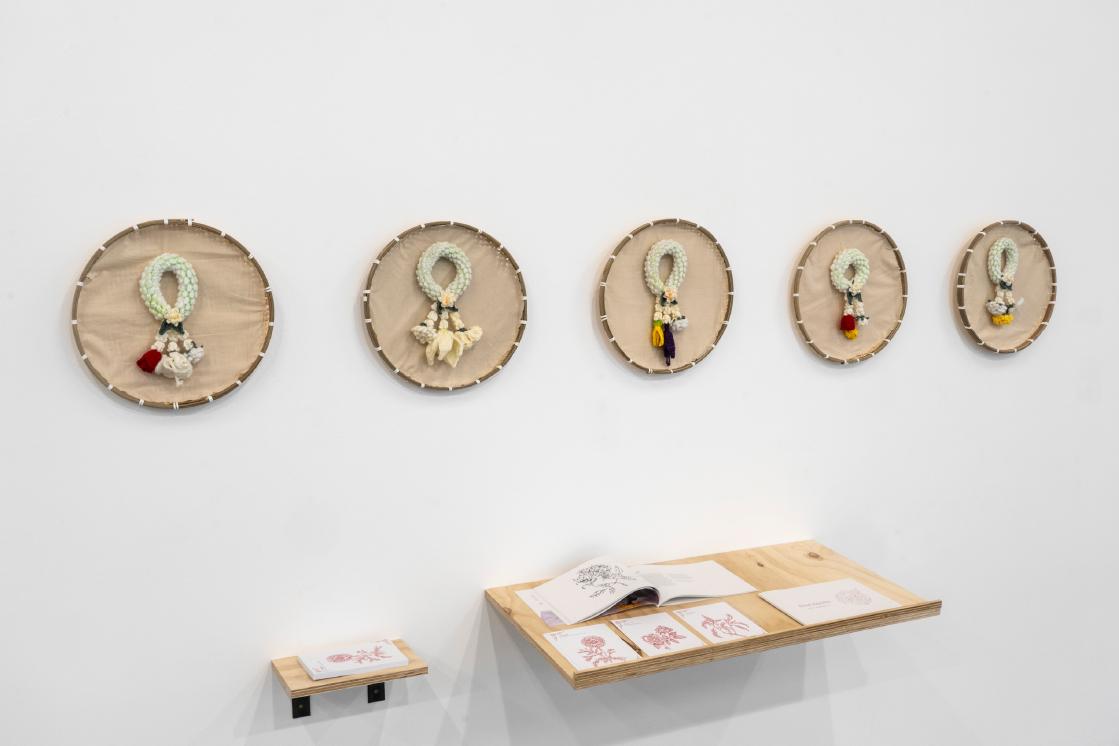 Drawing on the researcher’s personal experience and observation from the past and present, this project investigates the values and qualities of the people in her community. These values and qualities are expressed through พวงมาลัย (Phuang malai), Thai flower garlands, accompanied by a publication that conveys the essence of the entire project. The practice is informed by initiatives like the cultural significance of Thai gift-giving and garlands to create a personal connection to the researcher’s background. Gift-giving is also used as a relational gesture to foster and facilitate meaningful connections through the crocheted garlands. This process is also captured through a visual narrative that showcases the researcher’s navigation between two cultural worlds. The study contributes to the understanding of how crochet can be employed to navigate cultural adaptation.