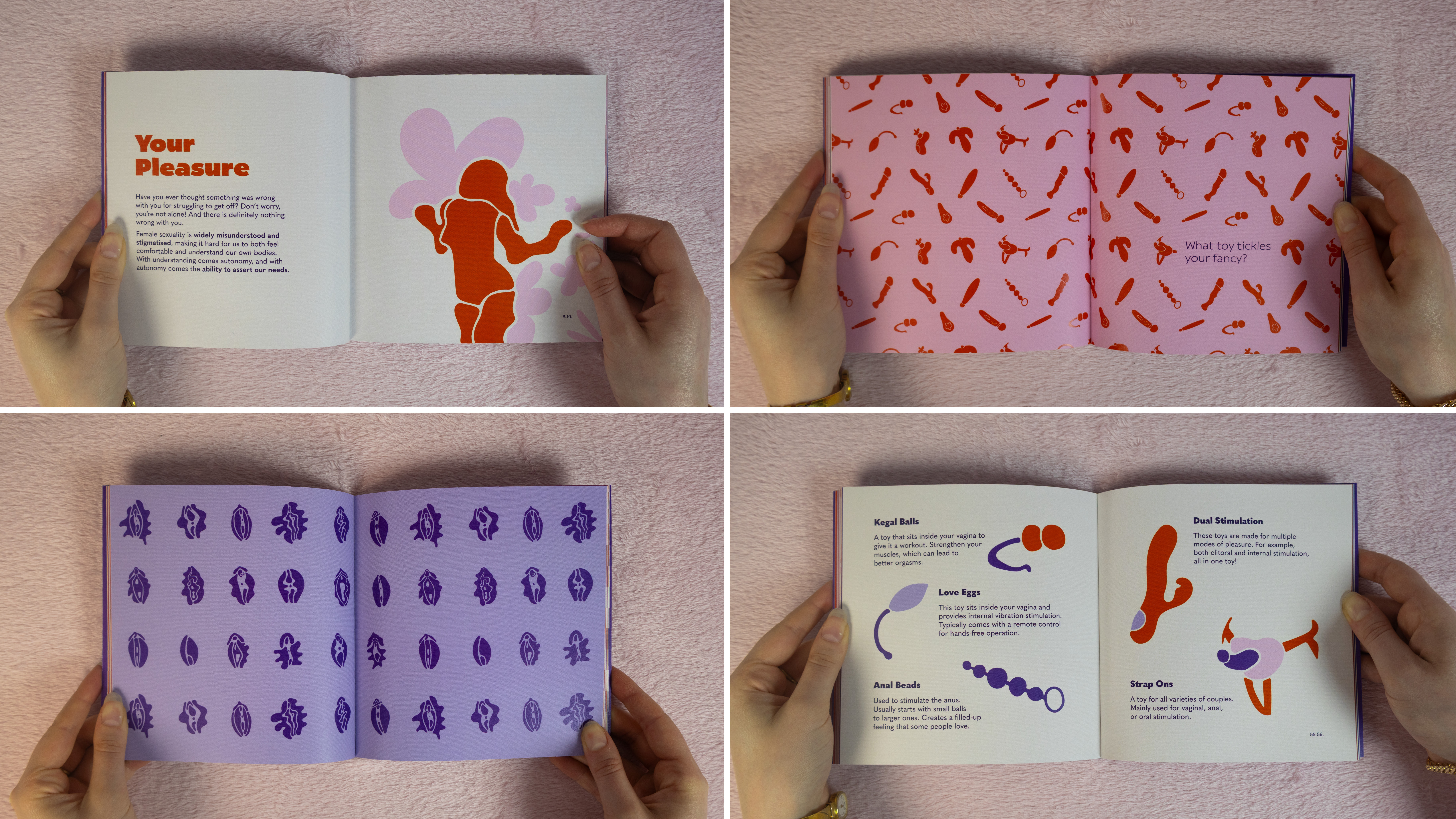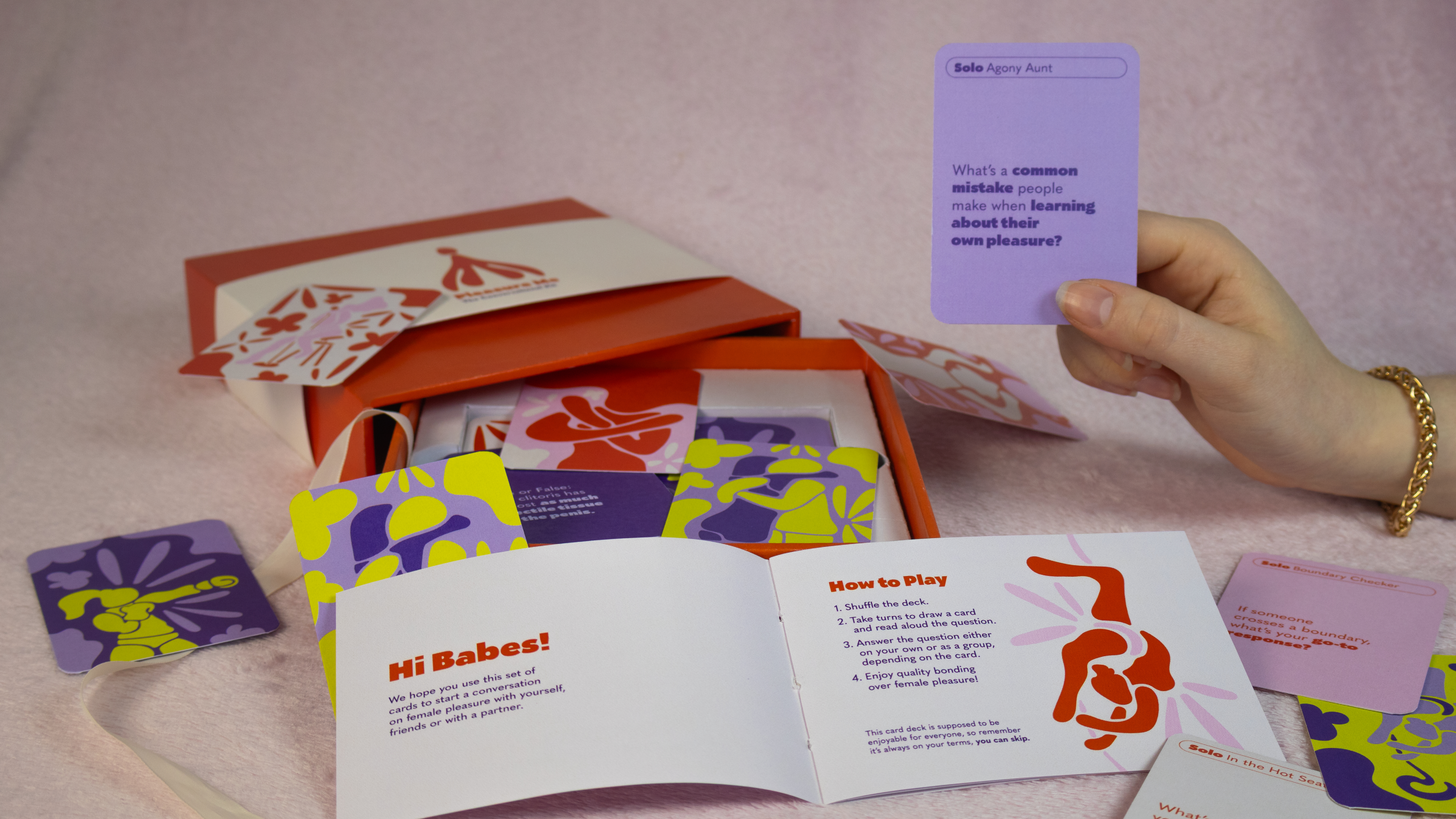 A Pleasurable Conversation imagines a world where a woman's pleasure is truly her own. The project presents a conversational kit aimed at destigmatising female pleasure. From a personal bedside book to inform and spark a conversation with oneself, to a card game designed to start a conversation between friends. The kit's overall goal: to make the uncomfortable comfortable.