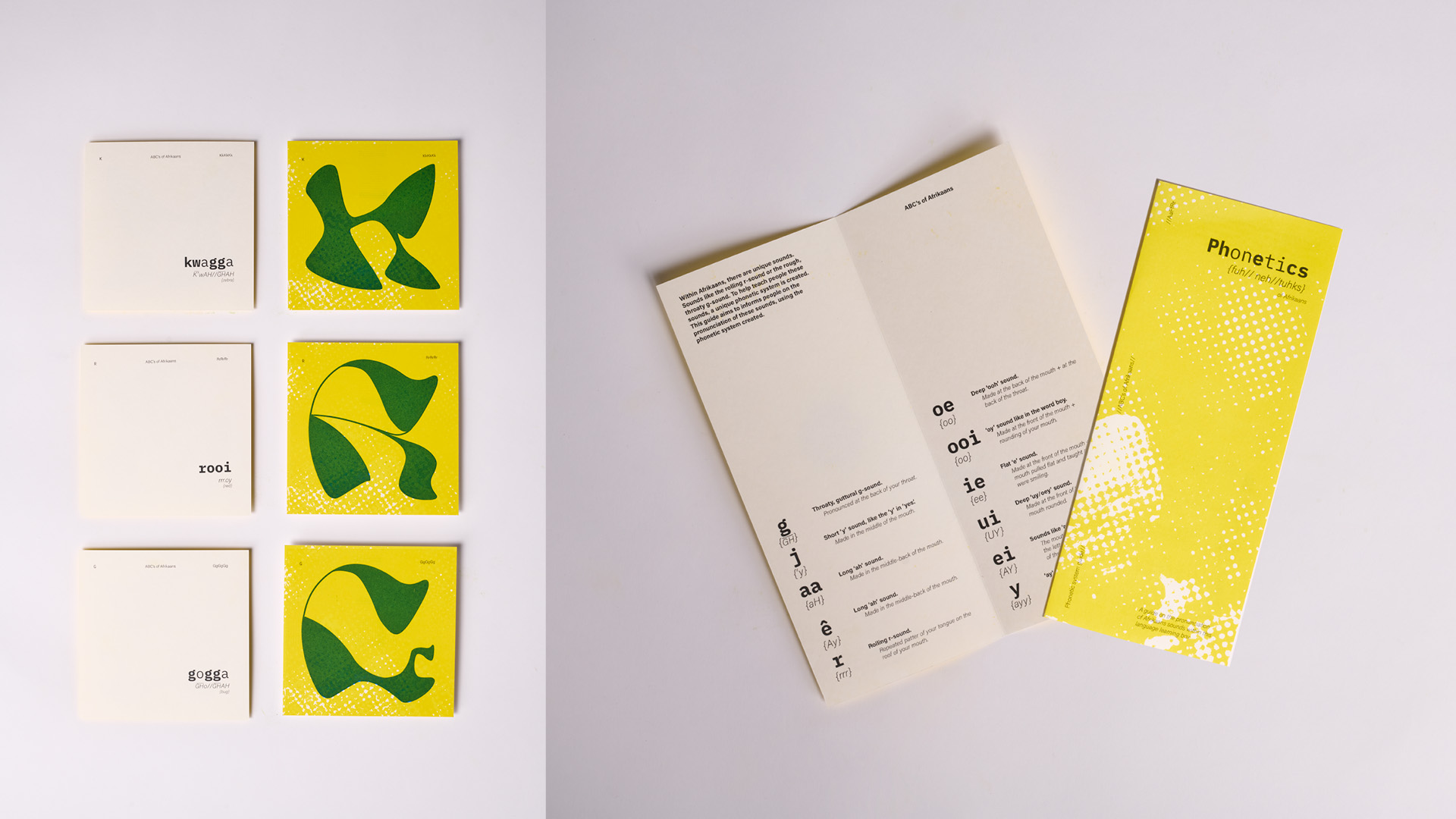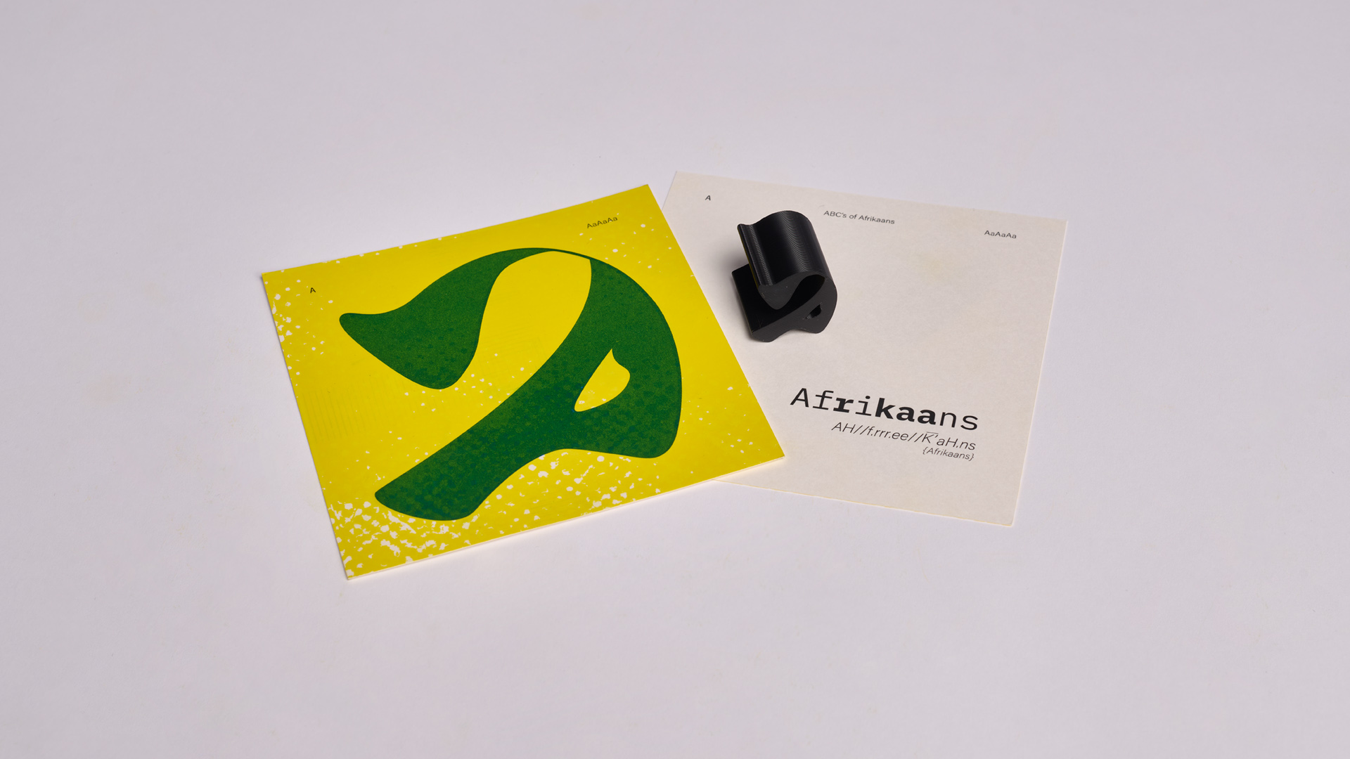 Afrikaans, being a young language and with the large number of South Africans immigrating, raises concern that Afrikaans could become a lost language. Through creating a sensory typographic learning experience, the aim is to teach people Afrikaans, with a focus on word pronunciation and phonics, thereby preserving the language.