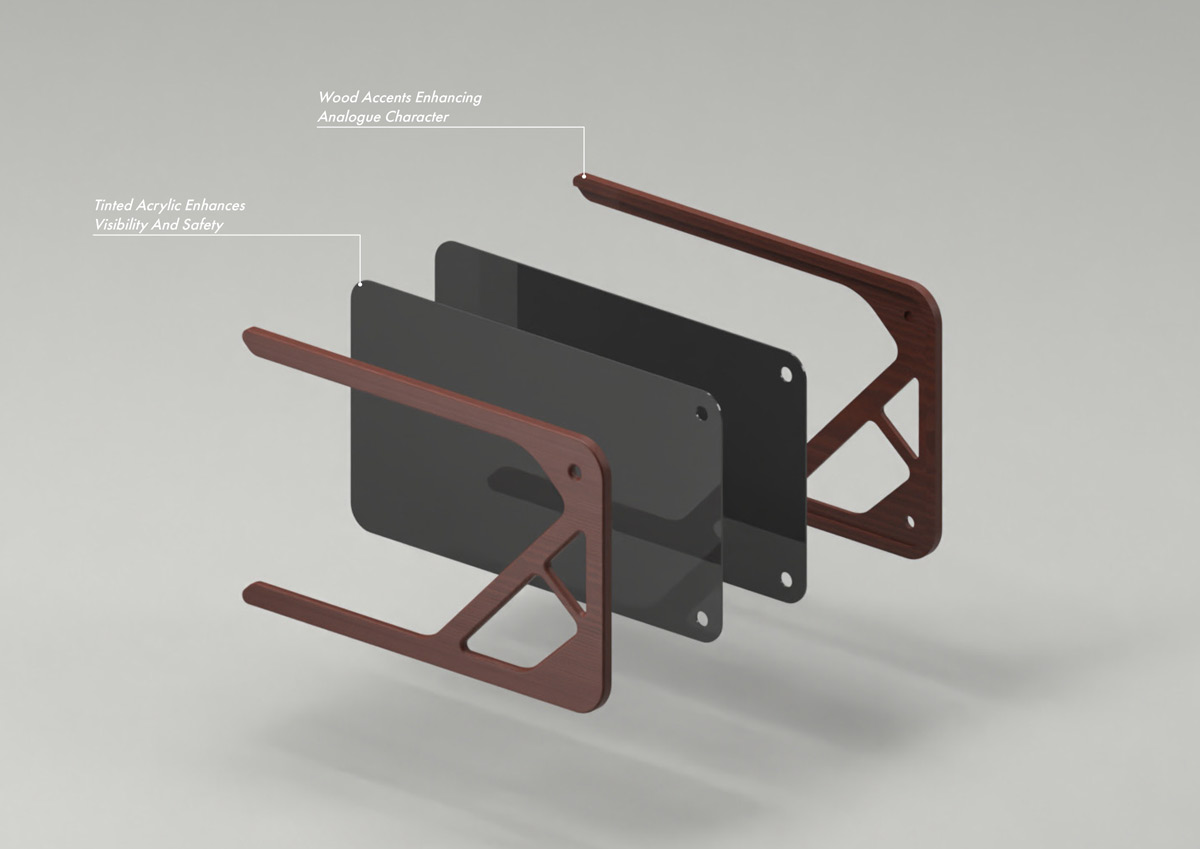Made from tinted acrylic for visibility through protection and finished with warm wood veneer, Apex brings together precision, tactility, and calm. It is a refined response to light, movement, and focus, designed to feel effortless in motion.