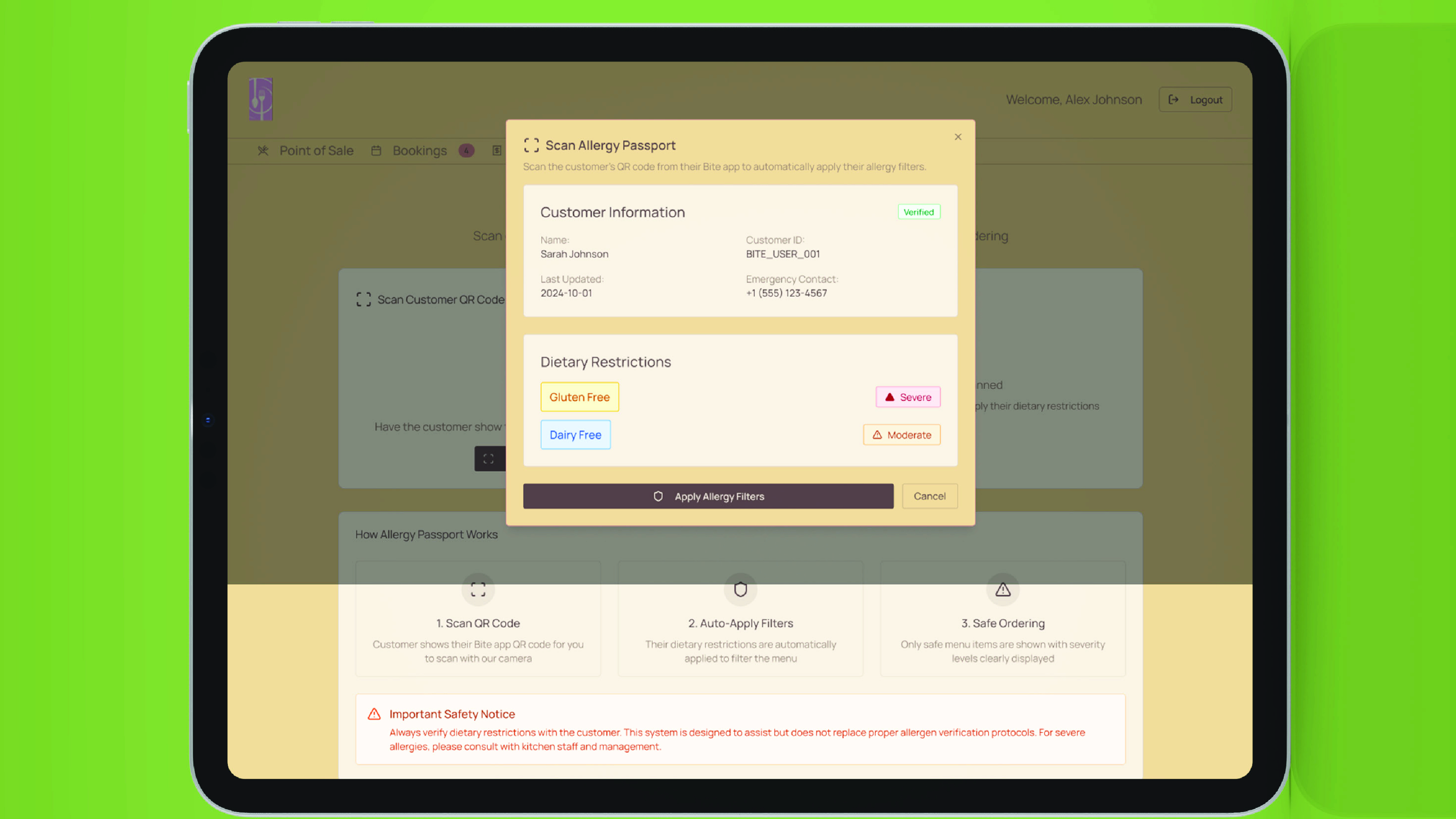 At its heart, Bite connects people and places, pairing a smart, allergy-filtering POS system with a playful, intuitive app. Scan a QR code, and your allergen info is right there, ready to keep you and your meal in sync, no awkward conversations, no crossed fingers, just good food and good times.