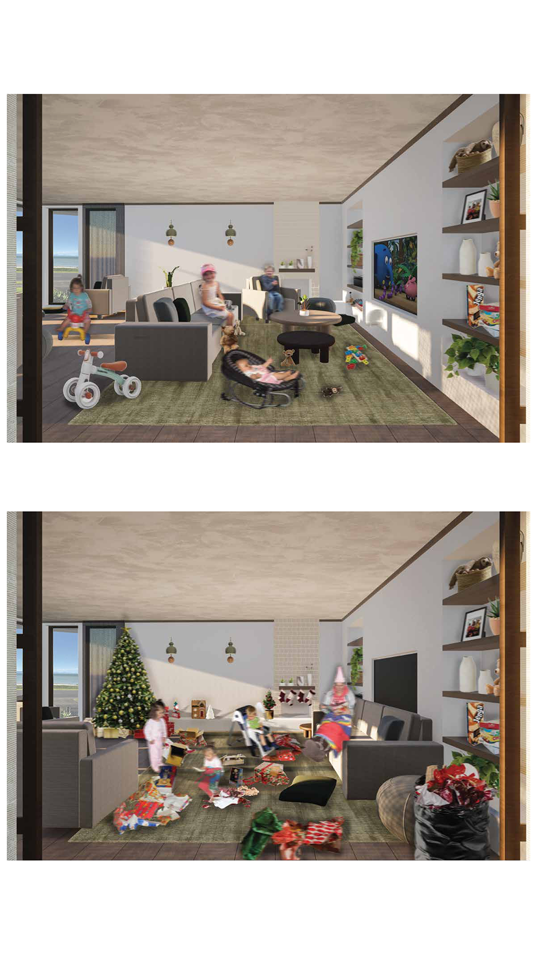 My project explored how architecture can not only hold life, but care for it too. The brief was to reimagine my grandparents' house in Kaiaua, New Zealand, a place built by my great-grandfather that has held generations of our family. I aimed to extend the house’s capacity for togetherness, while making space for growth, privacy, and accessibility, without stripping the traces of what always made it home.