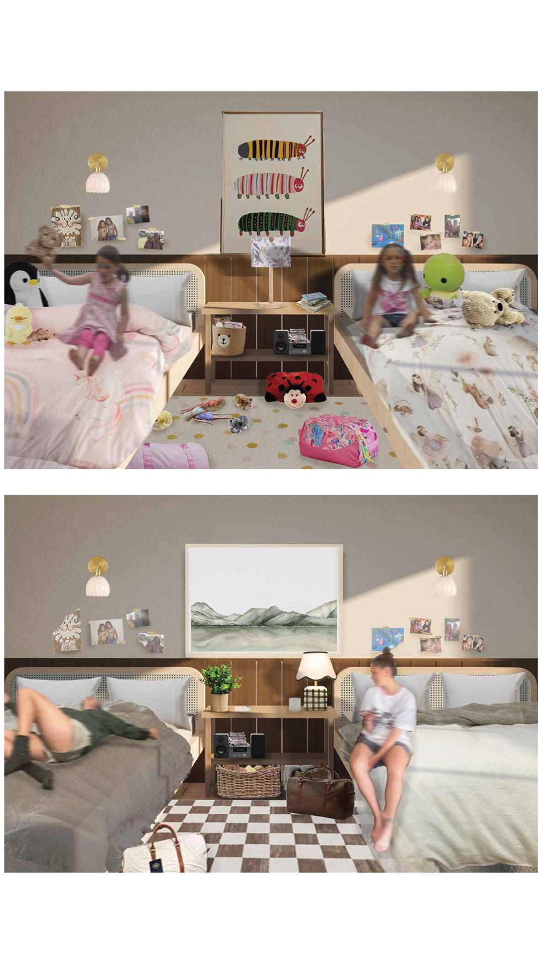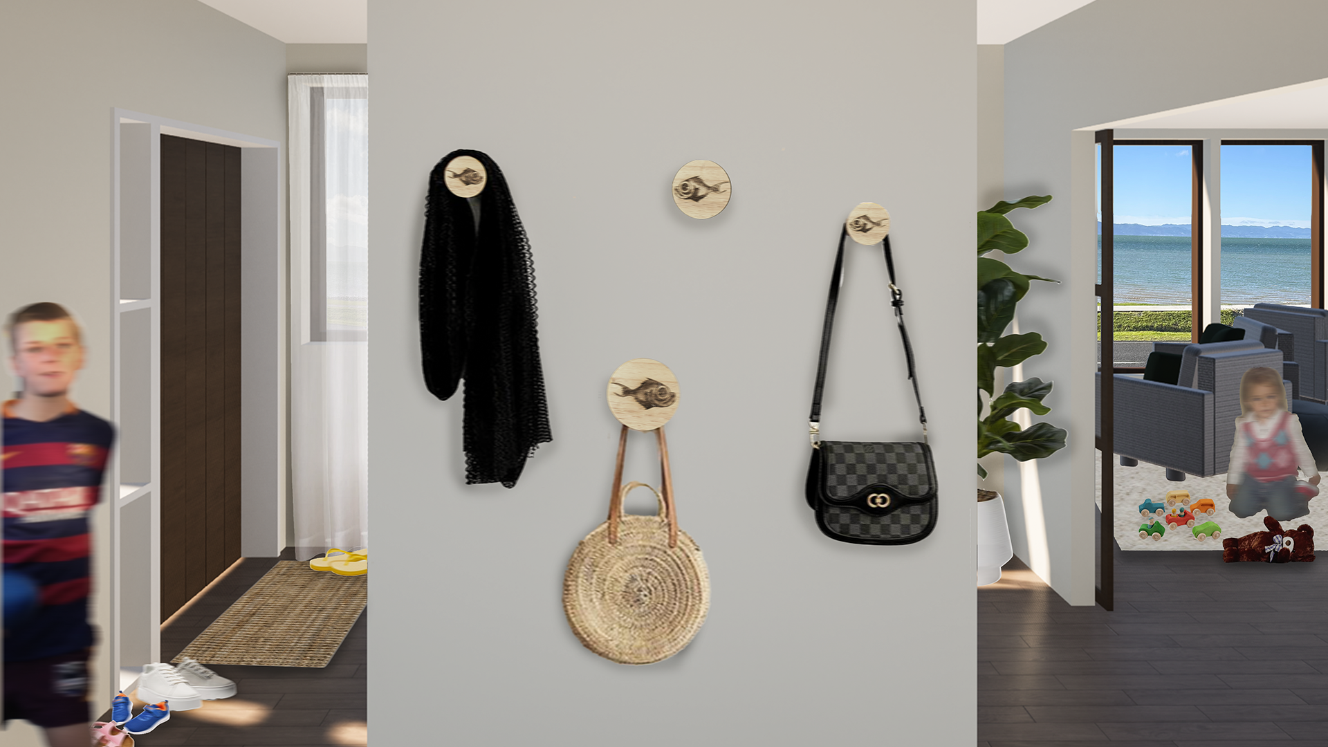 I considered the house as a living document of lineage and care. Each space was designed around a leading memory: the dining room as a place of ritual and conversation, the kitchen for learning and collaboration, and the living room for togetherness. I crafted furniture and artefacts inspired by personal memories, fish hooks recalling our childhood life jacket pins, an orange pendant referencing the big backyard orange tree, and a shoe rack that restores order without erasing the chaos, and the bedside unit to display treasures of our family.
