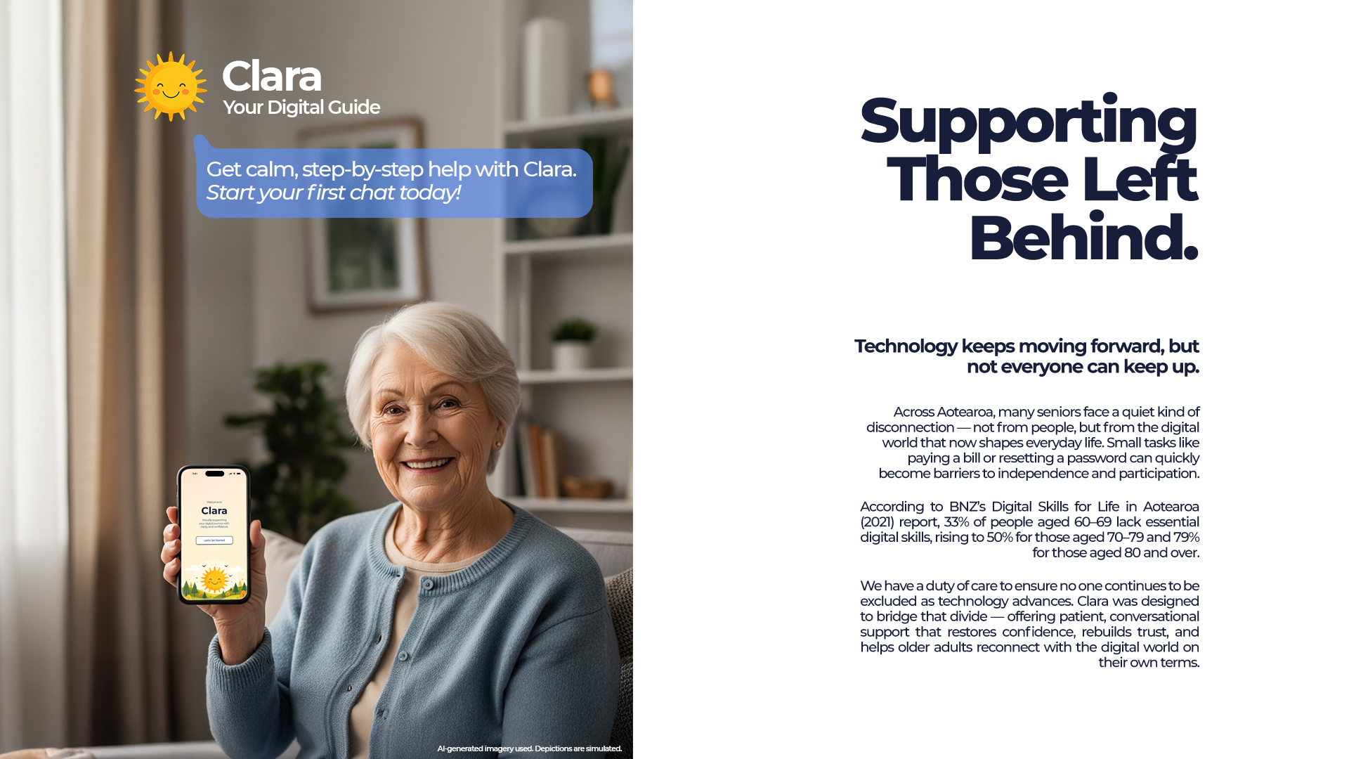 Grounded in Human-Centred Design, Critical Design, and Research through Design, Clara is shaped by values of manaakitanga and social equity. It asks how technology can uphold dignity, safety, and belonging for those overlooked by mainstream design. The work argues that progress should be judged not by efficiency alone, but by how confidently people can participate.