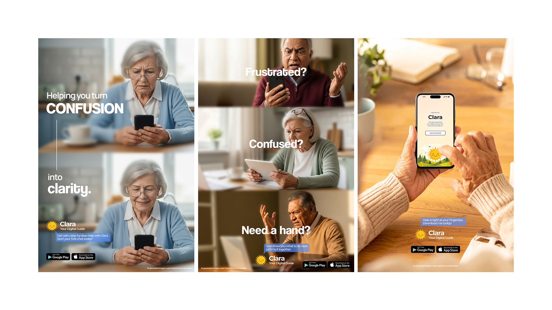 To build out the wider world of Clara, a video advertisement and poster campaign visualise the emotional reality of technological frustration and the reassurance Clara aims to provide. These activations extend the project beyond the prototype, framing Clara as a broader statement about empathy, inclusion, and the right to feel confident when navigating everyday technology.