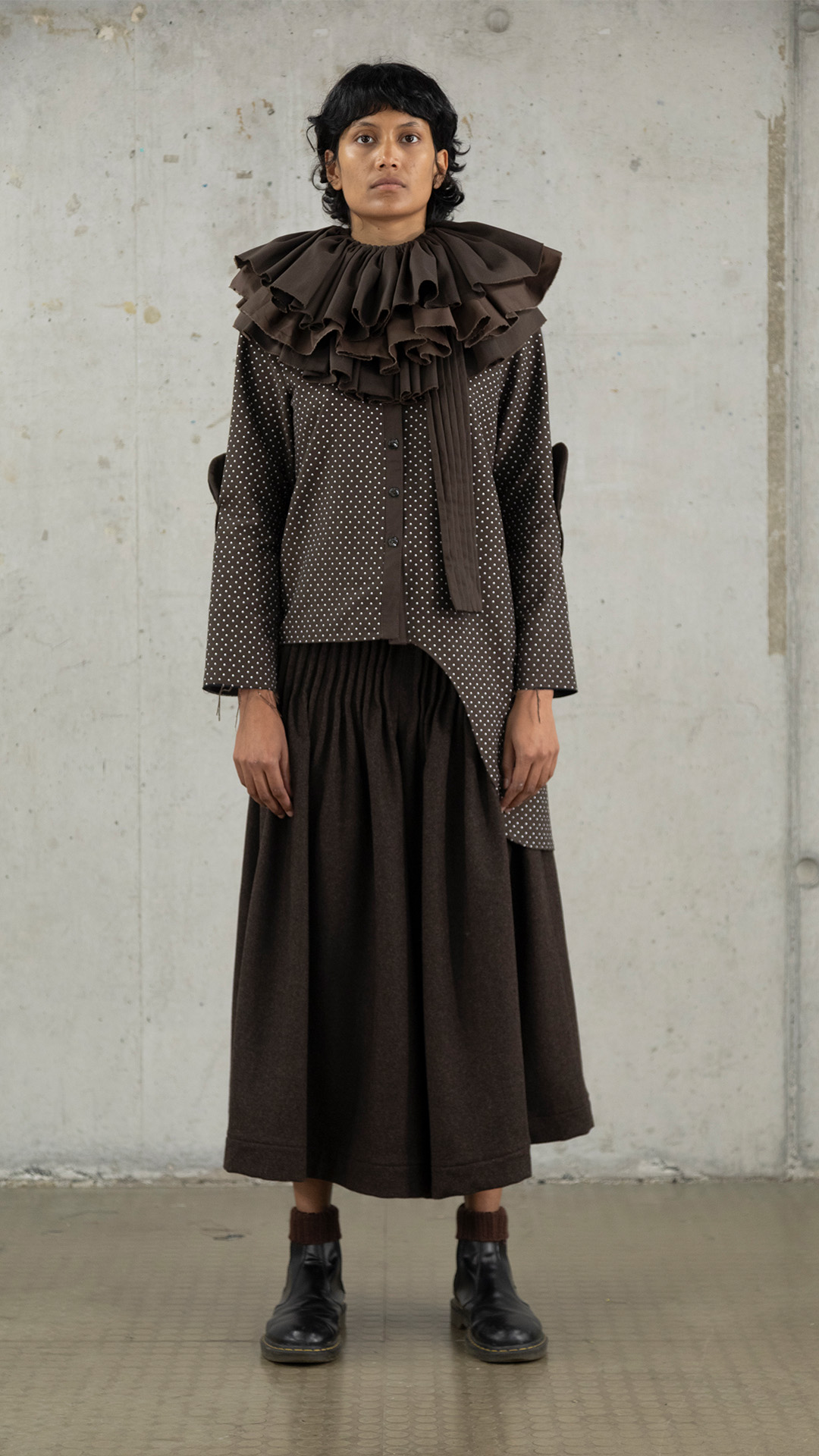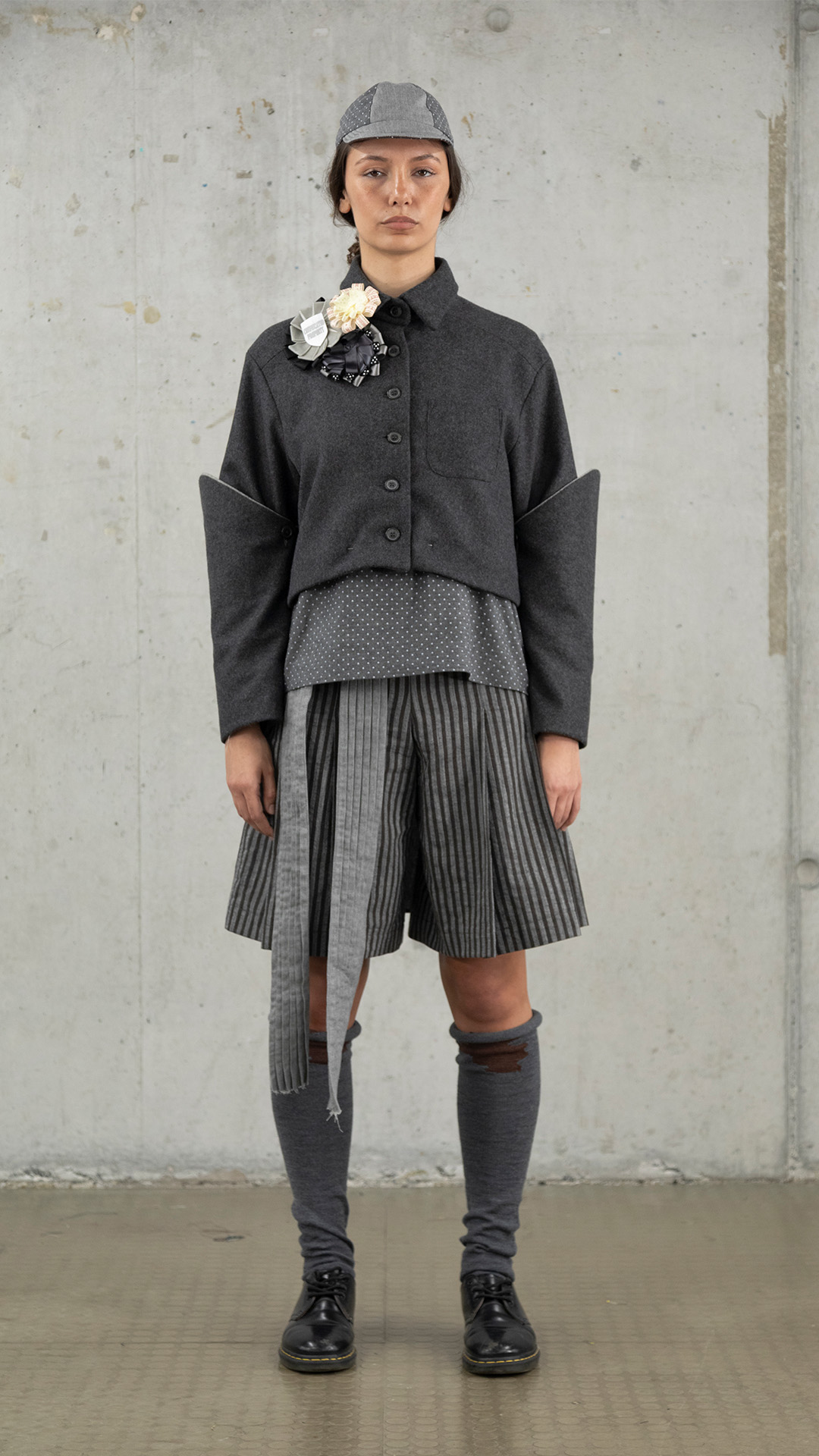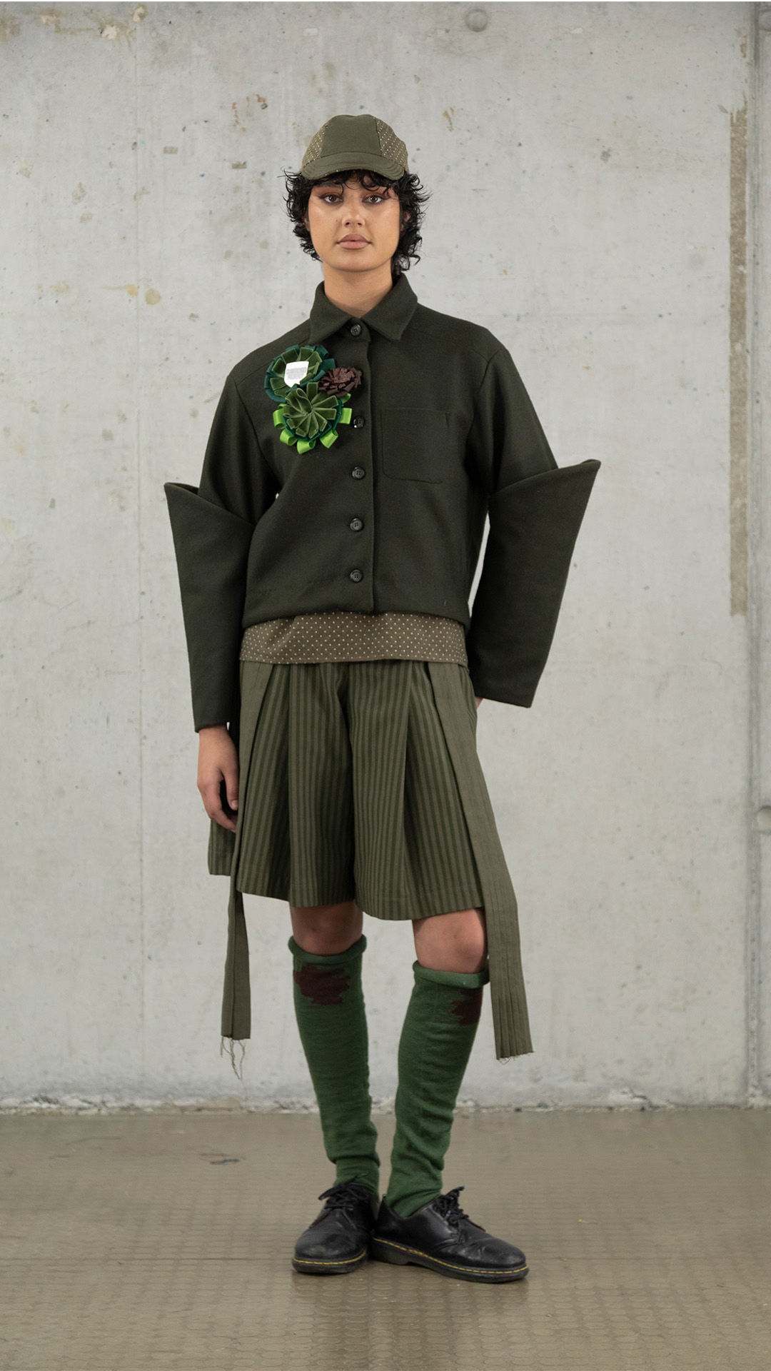 The resulting garments merge historical and cultural references with experimental craftsmanship to critique authority, conformity, and colonial influence. Confiscated Property positions fashion as a form of protest, communicating humour, resistance, and reflection through materiality and form and contributes to broader conversations around fashion as a critical, socially engaged, and culturally responsive practice.