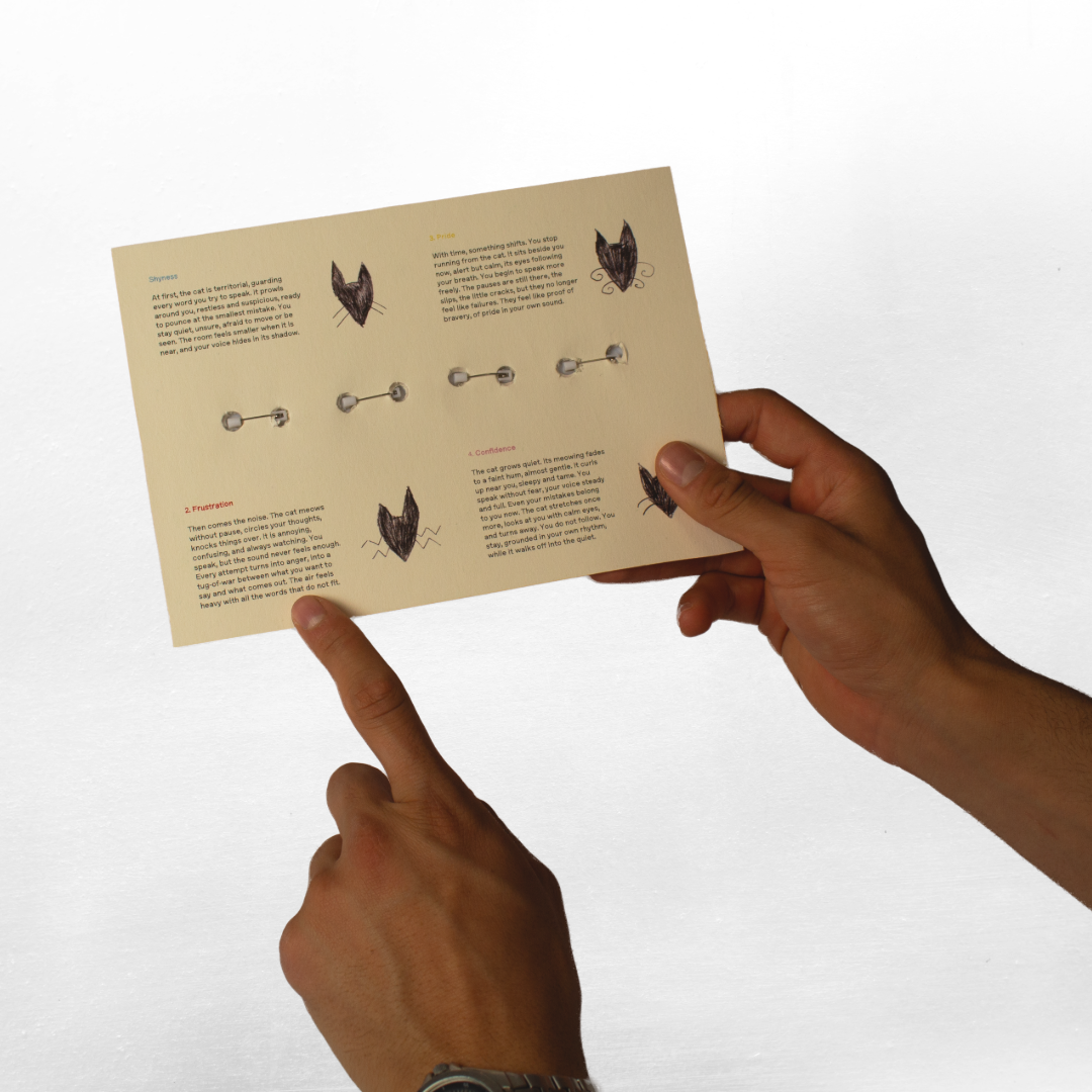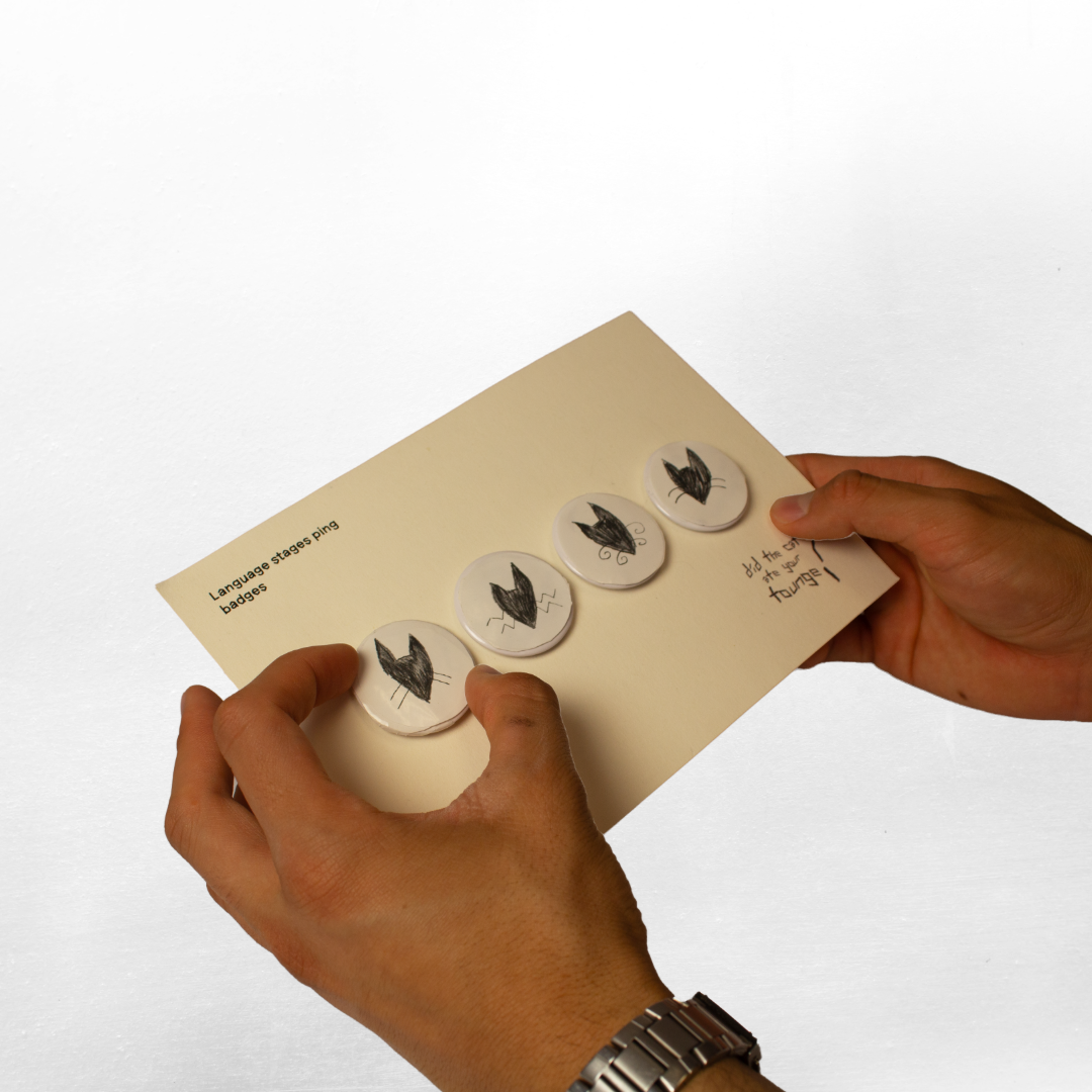 This project explores how design can visualise the emotional layers of language learning, such as uncertainty, pride, and adaptation, through storytelling and allegory. It is inspired by my own experiences as a migrant and non native speaker, reframing language not as a limitation but as a source of identity. The cat is used as an allegorical figure that reflects curiosity, independence, and vulnerability, representing the emotional journey of learning and communicating in a new language. Using illustration, typography, and material experimentation, the project combines printed and animated media to express what words often cannot. Techniques such as hand-drawn textures, scanning, and screen printing help preserve authenticity and imperfection. The four pin badges extend the project into a physical form, representing different stages of learning and self-expression. Overall, the work highlights how design can evoke empathy by making invisible emotions visible.
