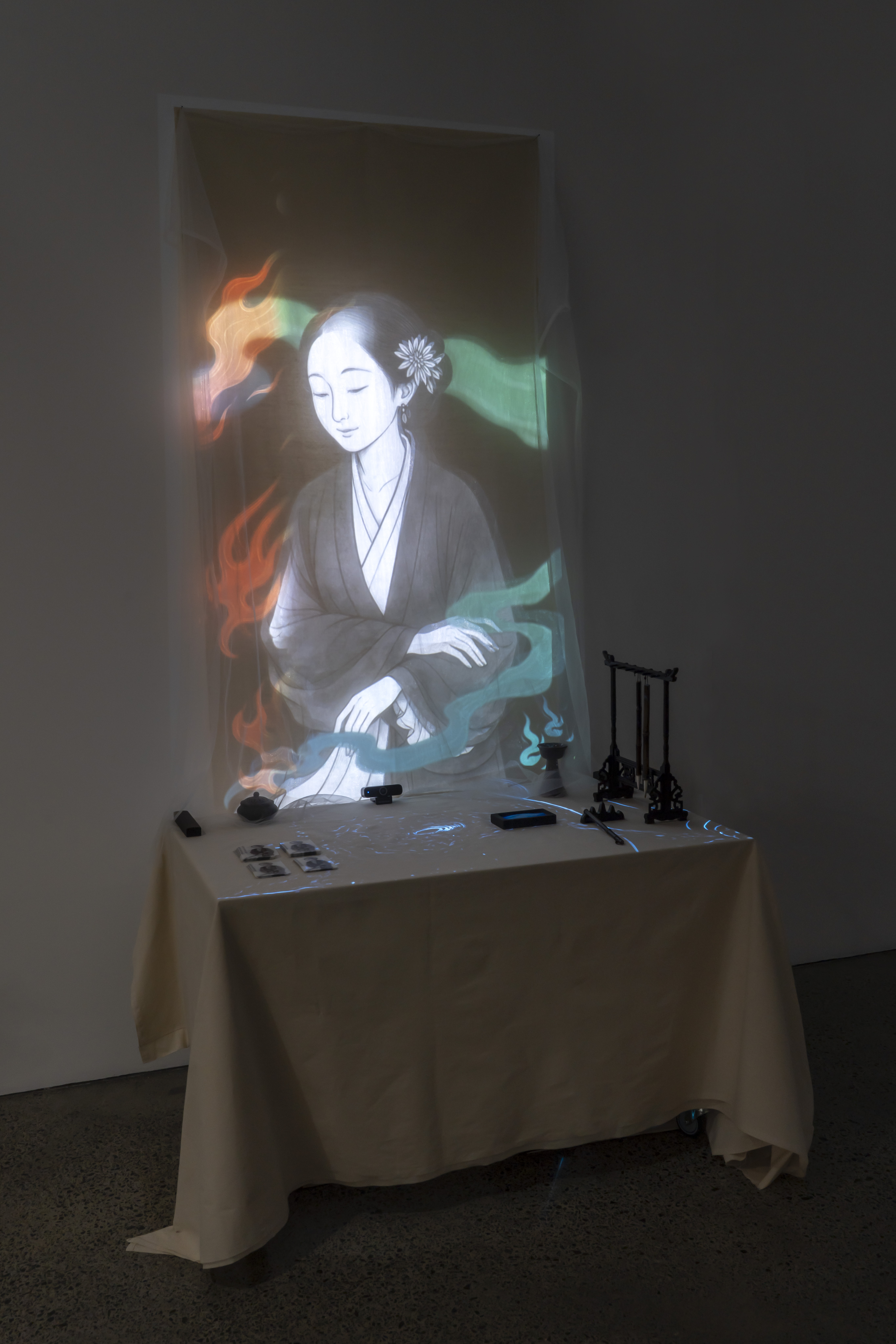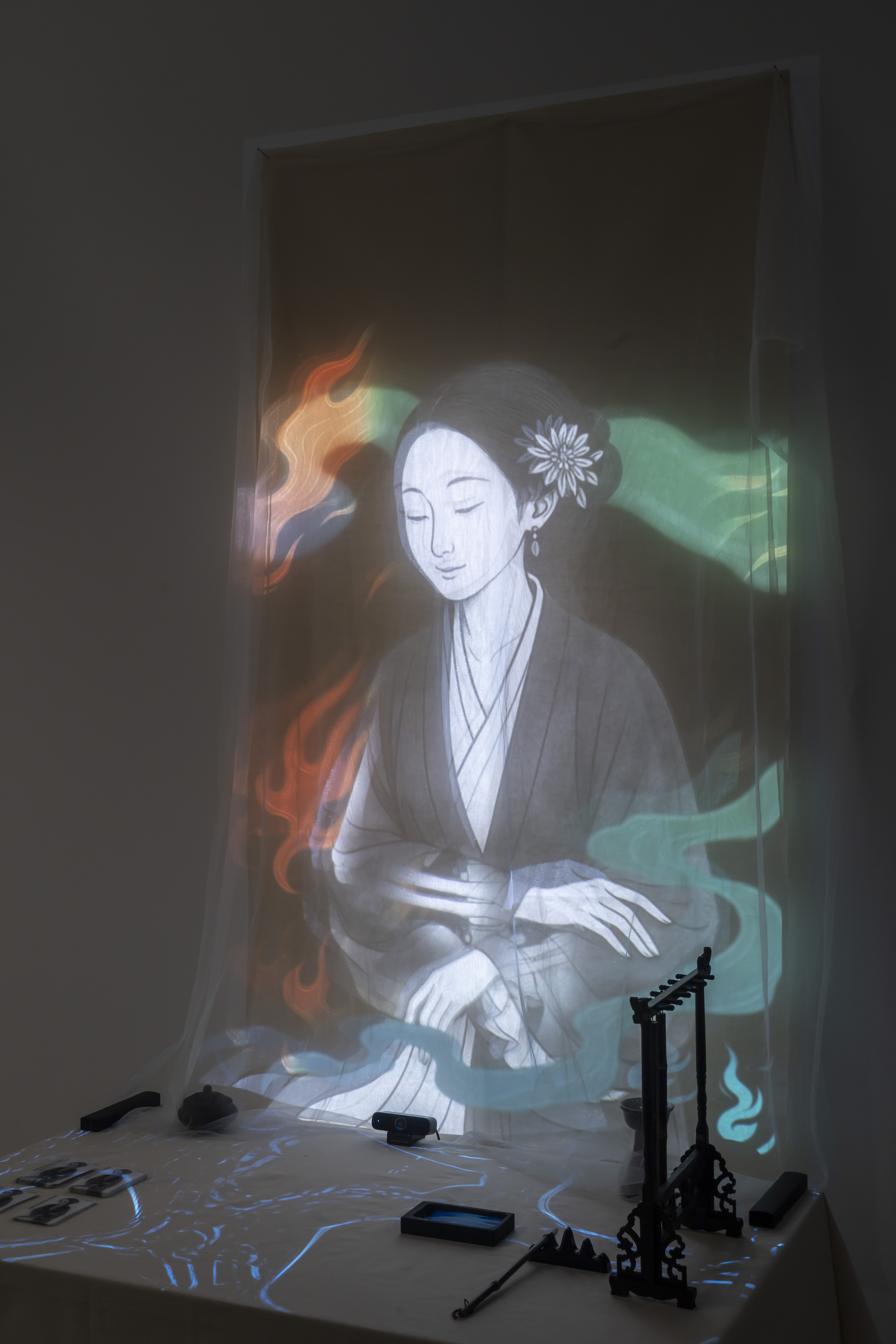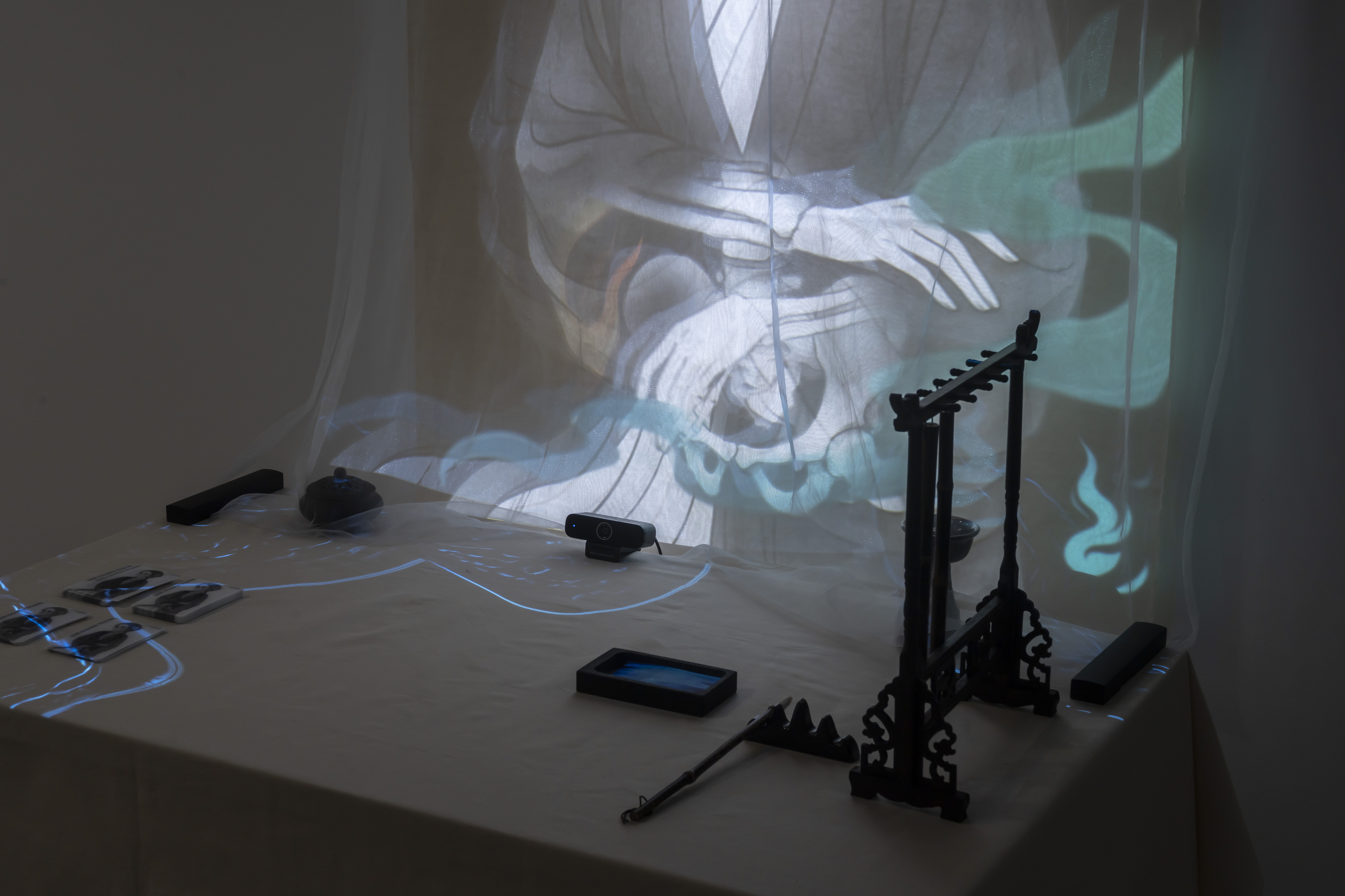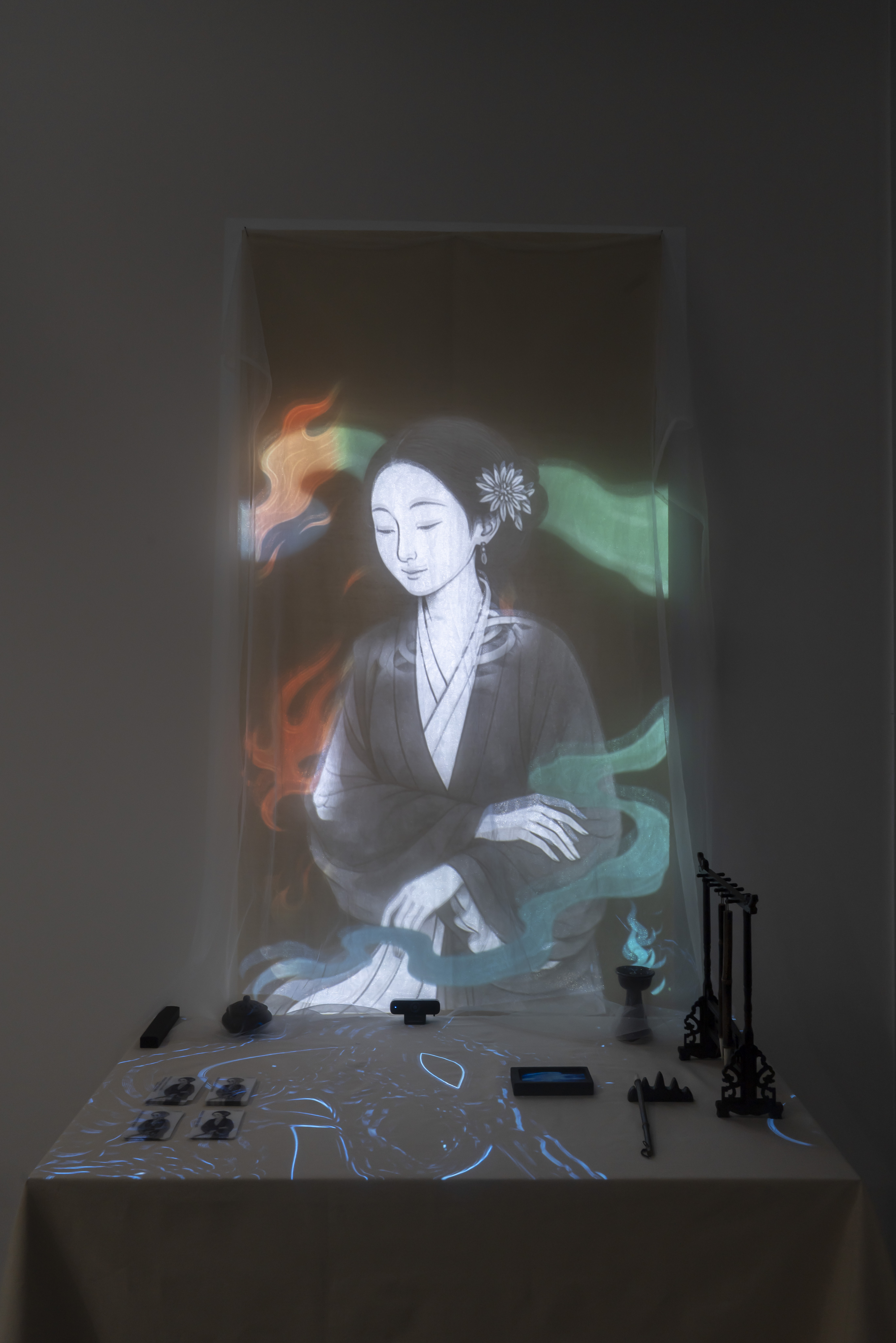 The installation is set in a fictional study room, imagined as a liminal space between the visible and invisible. Within this space, projected imagery, material surfaces, and interactive components form a layered sensory archive. As visuals shift and the spatial atmosphere responds, the work reveals tensions between surface appearances and inner realities. The ghost appears not merely as a source of fear but as a manifestation of repressed desire and emotional displacement. Through bodily and perceptual engagement, viewers are drawn into a journey that oscillates between calm and unease, illusion and reality. The project reflects on design’s potential to give form to the intangible dimensions of cultural and emotional experience.