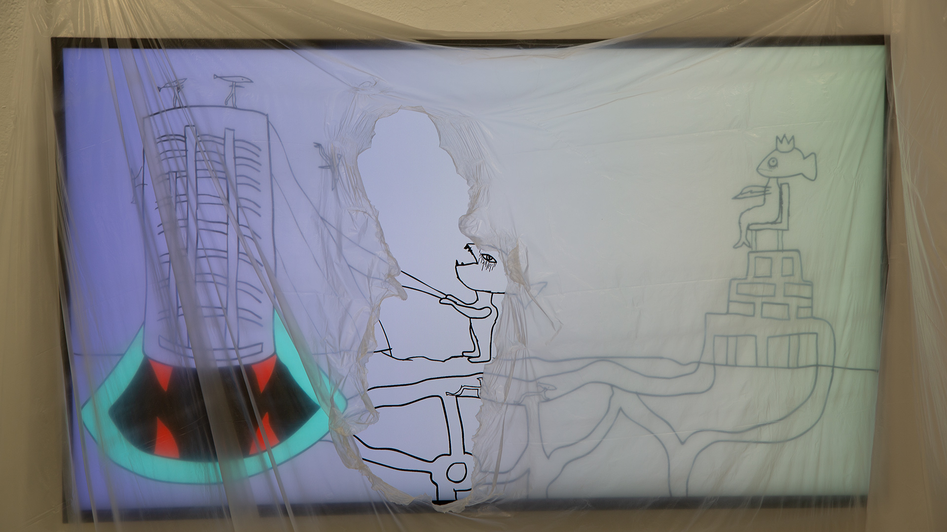 Disappointment in Utopia comprises a two-channel HD colour video, which includes two videos of footage recorded within the Auckland CBD and hand-drawn animated moving images that emphasise loose lines and hyperrealism. The installation features additional components such as a sculpture made from plastic drop sheet.