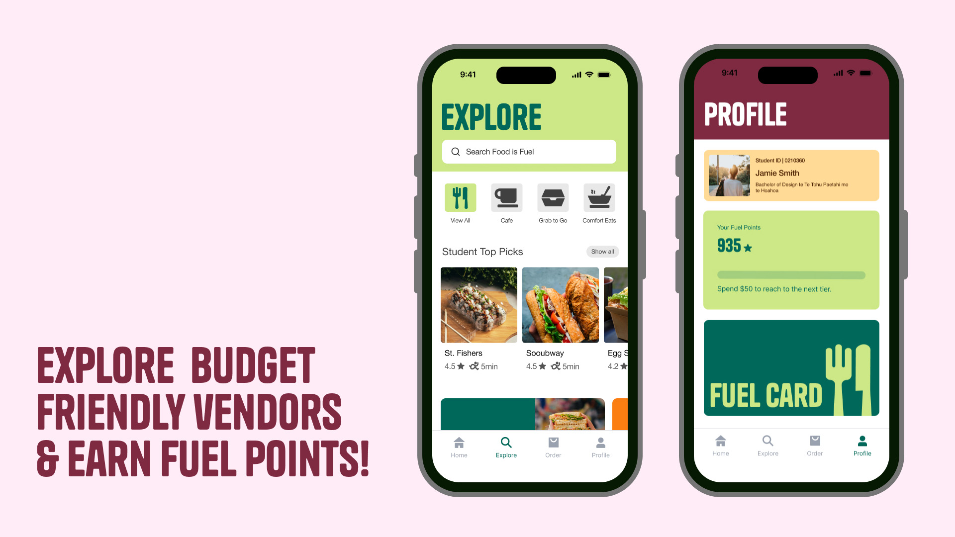 Using a human-centred design approach, this project prioritises AUT students’ perspectives throughout the design process, ensuring solutions directly address their needs and challenges. Food is Fuel is a pick-up meal platform that connects busy students with affordable, nutritious meals from local food vendors, helping students stay energised and focused on what matters most.