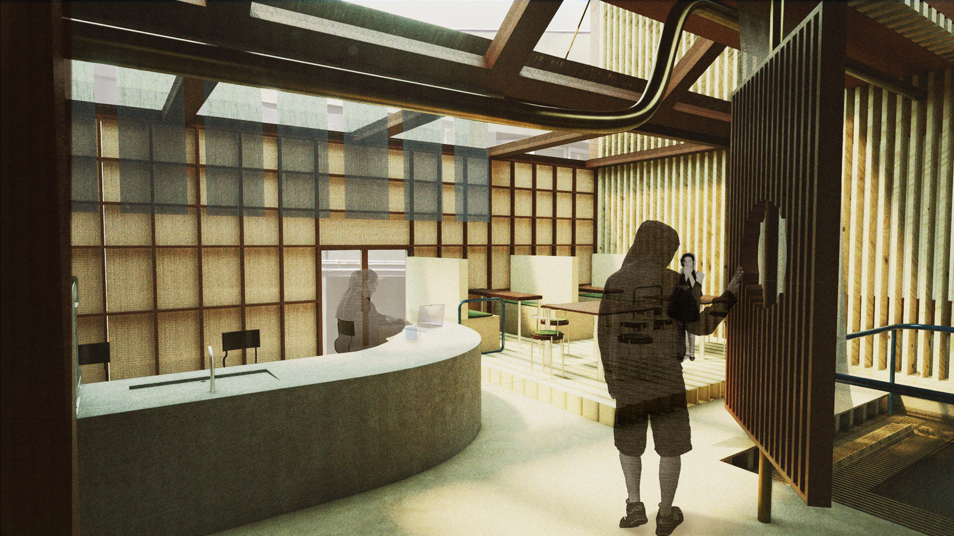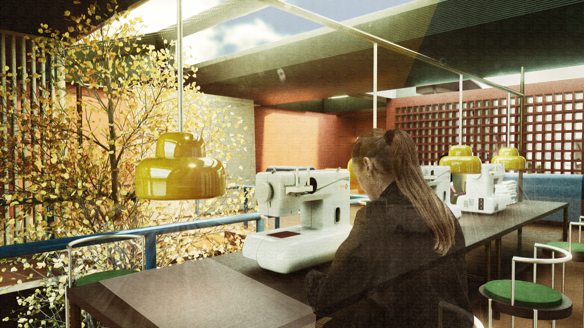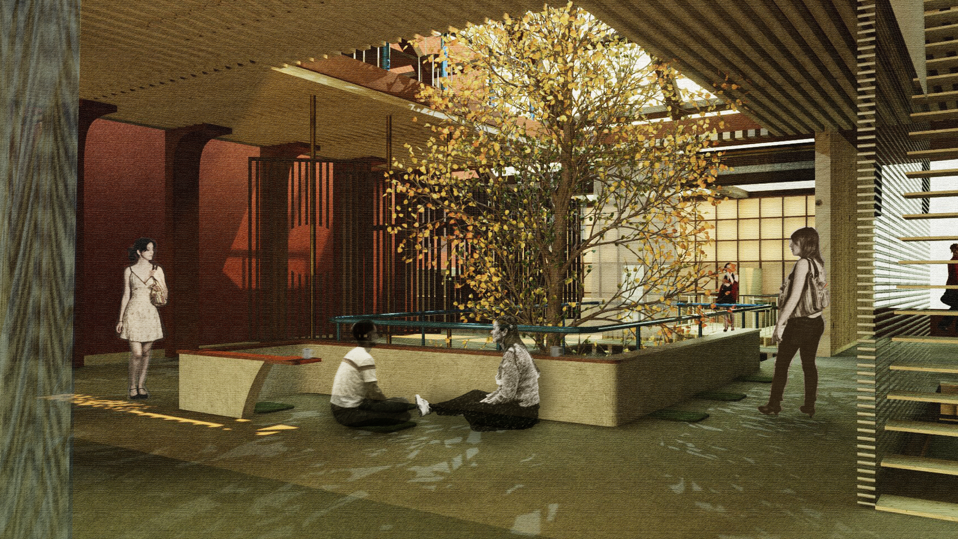 To create a feminine space is to define feminism; And to define feminism is to impose an ideology. What is it to be feminine? Is it to portray elegance like fabric in the wind, or can it be piercing? Like needles puncturing your skin; a punch in the gut. At the heart of the building lies a courtyard, open to the sky, where a single tree grows upward through the light of the skylight. Its branches filter the sun, casting shifting shadows that drift across floors and walls, guiding movement inwards and outwards