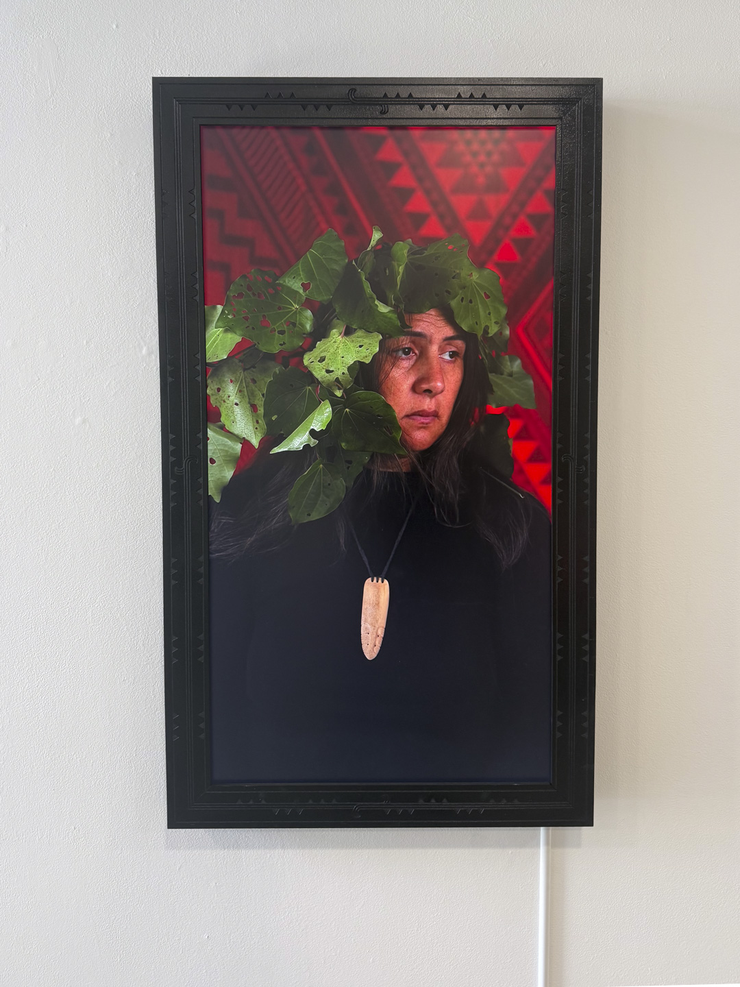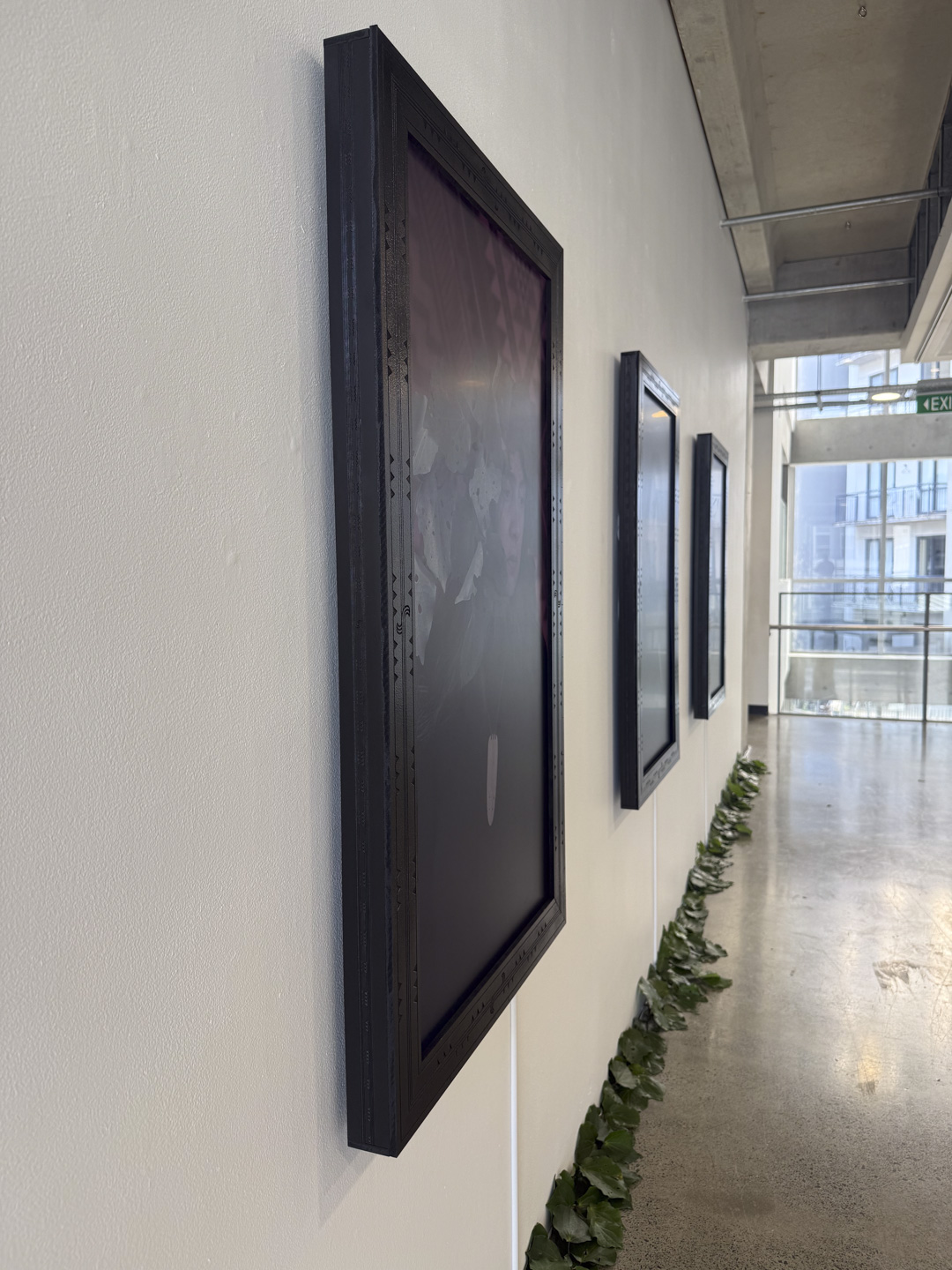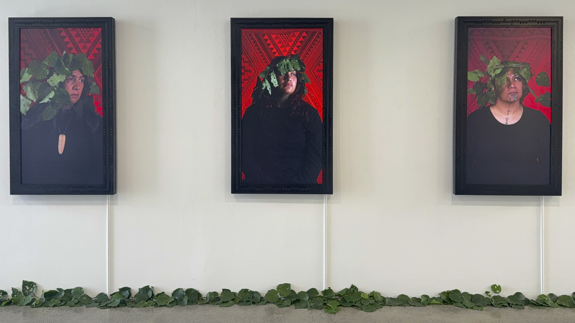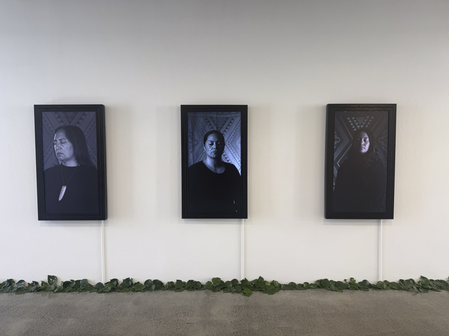 Through three moving-image portraits of wahine close to me - my partner, sister, and niece - I explore gestures that speak softly yet powerfully to presence. Filmed at 100 frames per second, fleeting gestures expand into moments that feel suspended, inviting a deeper encounter with presence. The portraits rise in scale, echoing photo walls on marae, with carved frames recalling whakairo and the depth of our relationships. Like the photos of our tūpuna on marae walls, these portraits hold the presence of those closest to me, grounding identity in whakapapa and place.