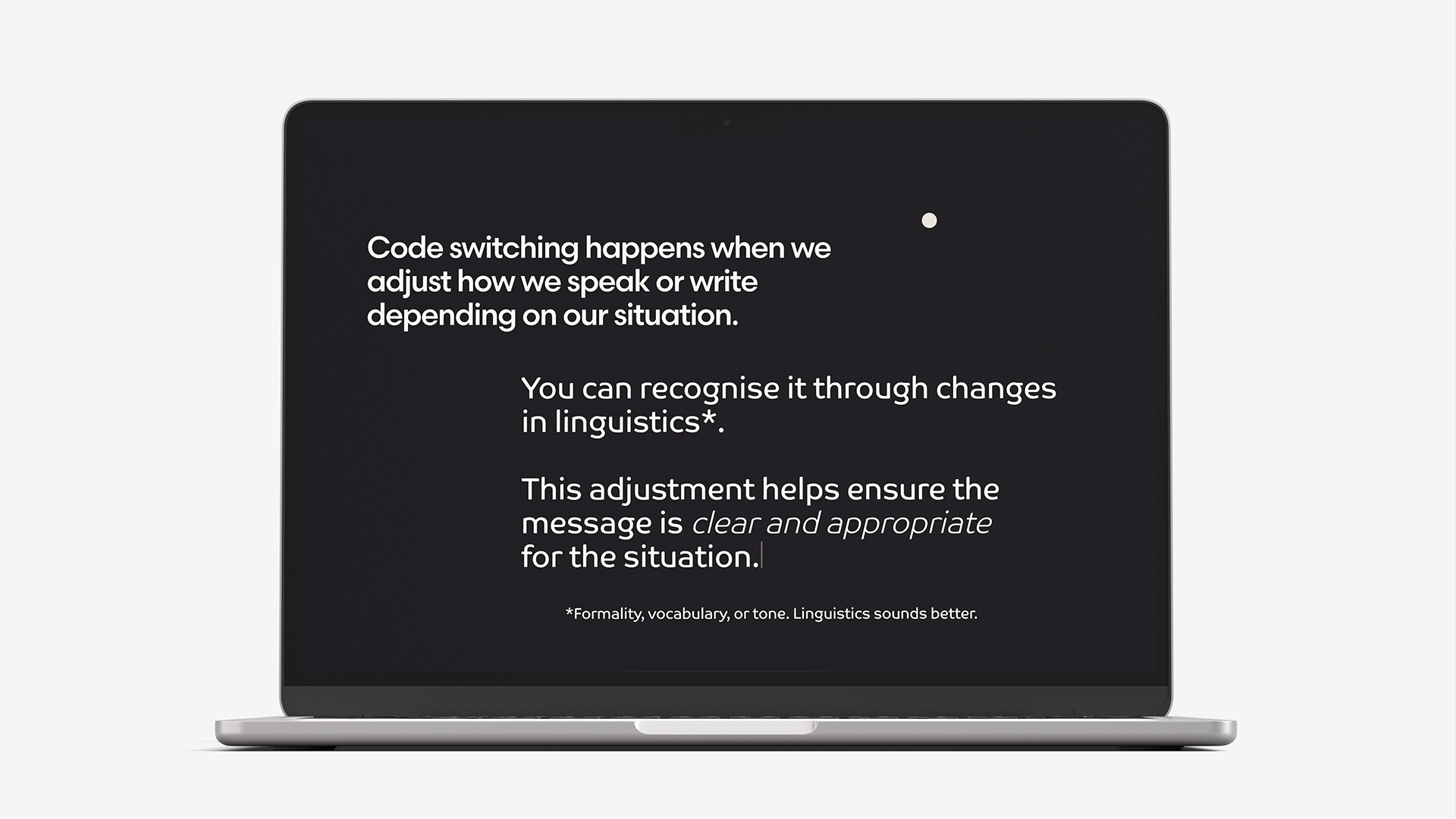While code switching is a valuable adaptive skill, it is often misunderstood or reduced to stereotypes, leaving a gap in public awareness of its nuance and cultural weight. The research question asks: How can kinetic typography disseminated across a range of digital communication platforms raise awareness and better express the tone, vocabulary, and para-linguistic qualities of code switching to an audience of Gen Z?