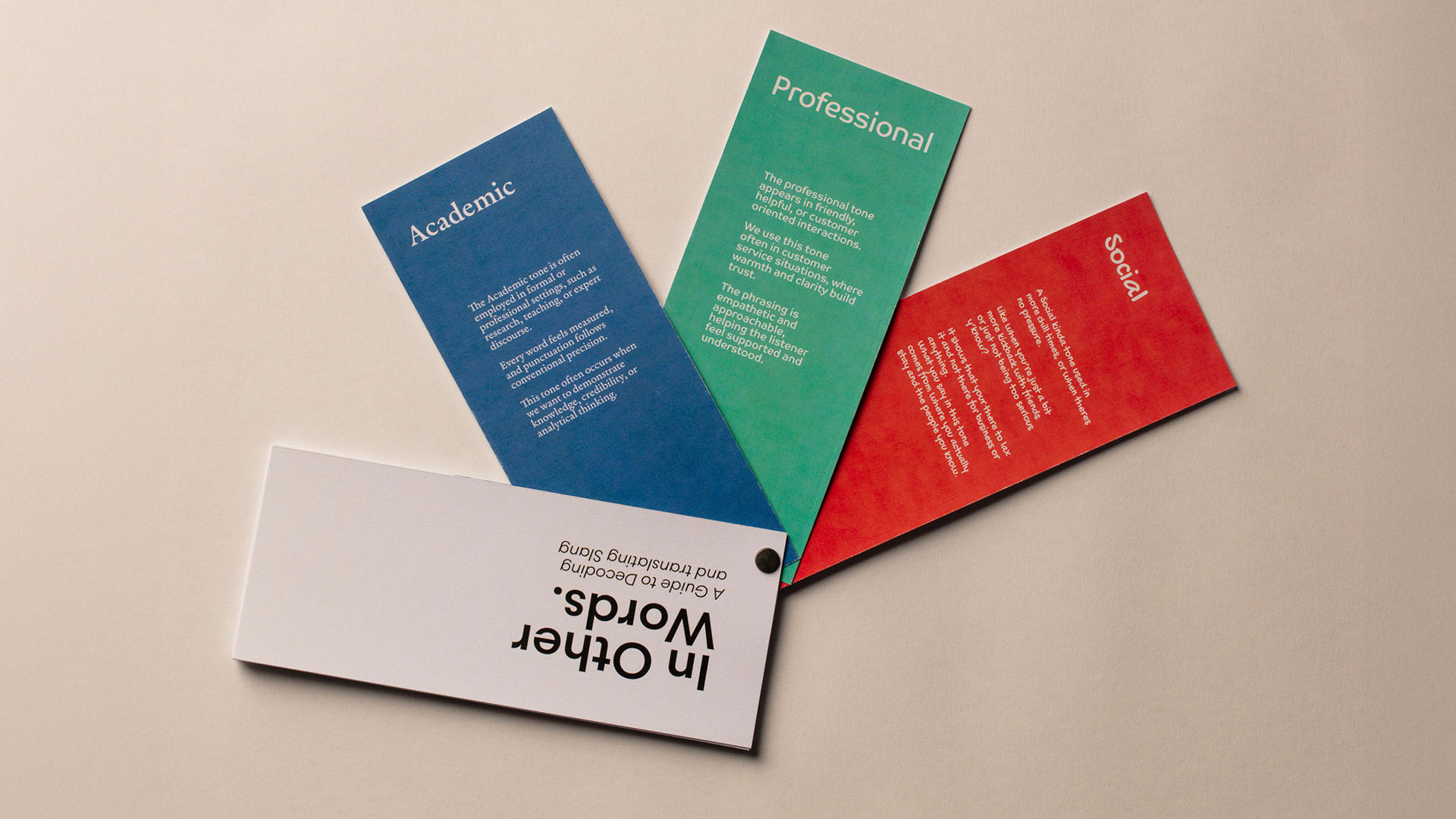 A design-led methodology combines critical discourse analysis, visual experimentation, and iterative prototyping. Contextually, the project draws on Para-linguistics to highlight how language is representative of the social contexts as well as identity. The contribution lies in demonstrating how design can be used as intervention tool through storytelling.