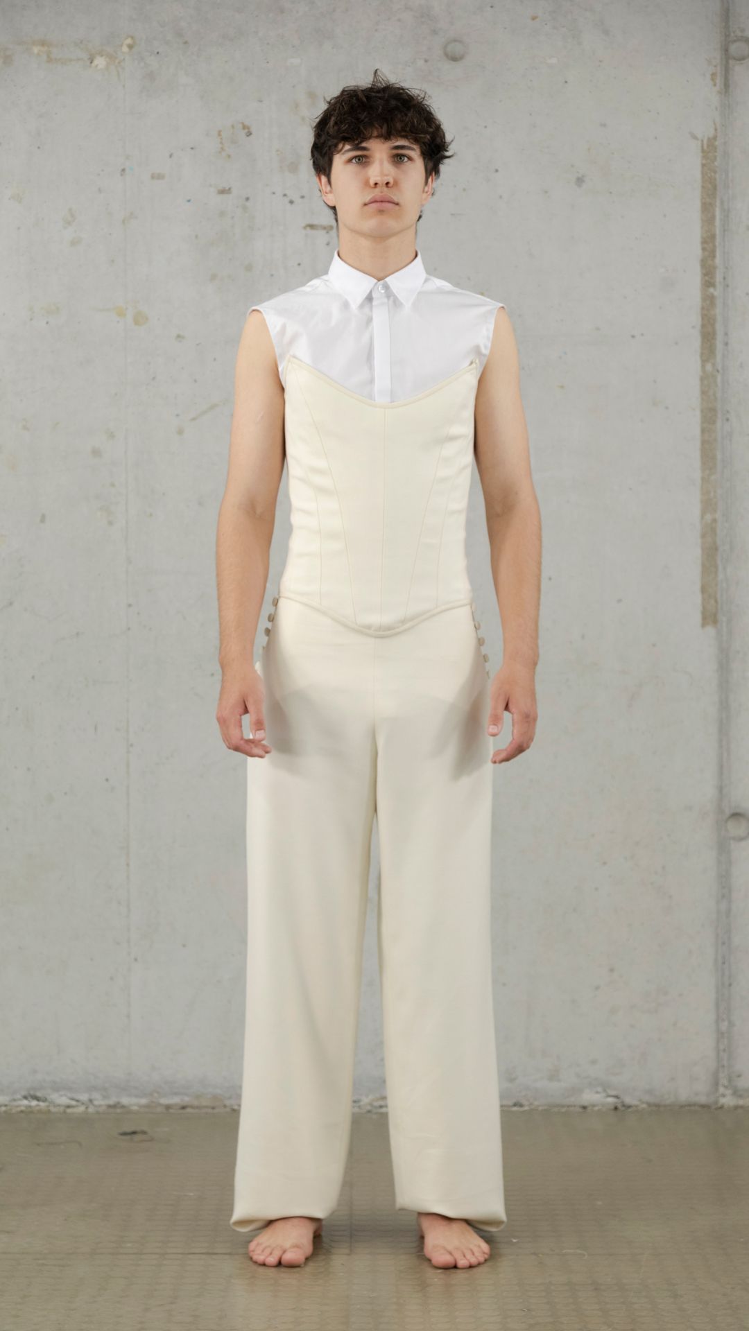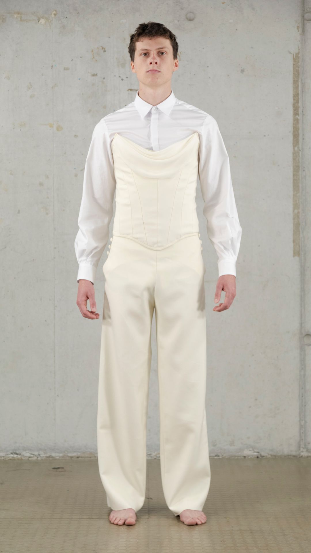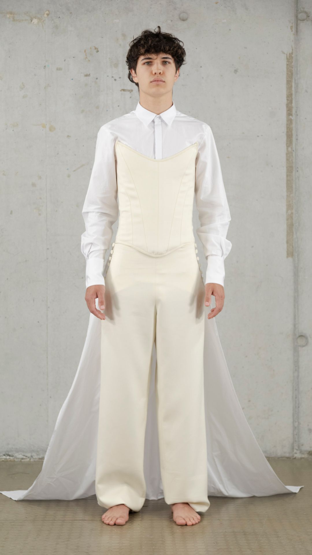 My collection examines the heteronormative standards within society using men's bridal wear. The design process involved personal introspection about my own views on the masculine and feminine as a queer person raised with religious ideologies.