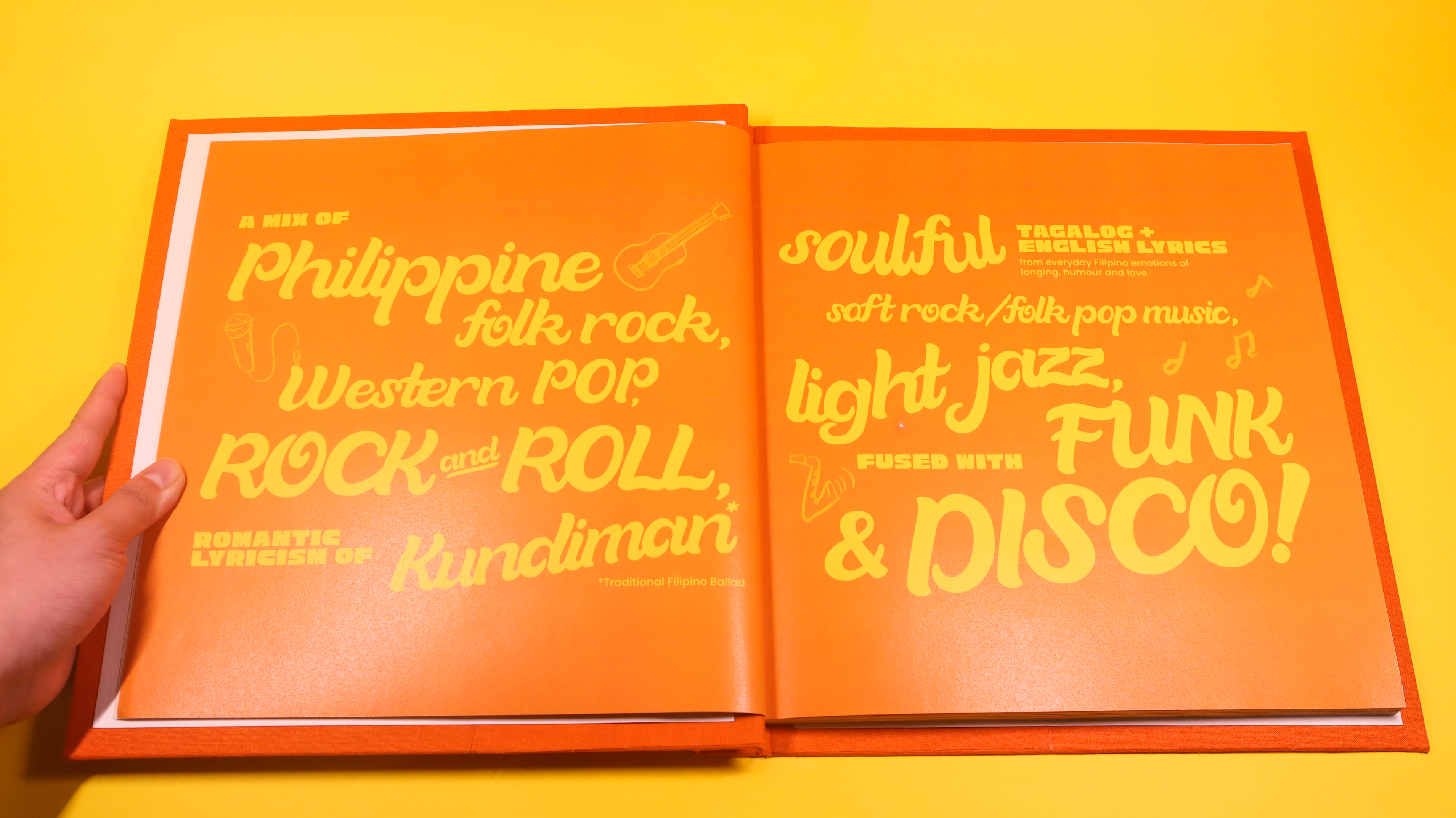 Through a practice-led and autoethnographic approach, I translate the warmth, playfulness, and optimism of Manila Sound into a contemporary display typeface and reflective publication. The process involved studying the genre’s album covers, song lyrics, and visual motifs to translate sound into rhythm, shape and colour within the letterforms.