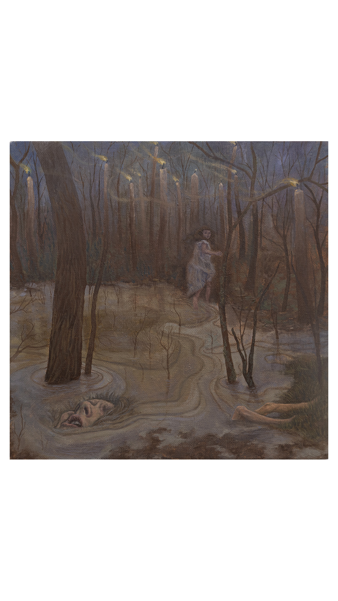 From my own dreams, symbols are integrated into these scenes as evocative imagery and allegories of coming-of-age; an aggregation of maggots, a feasted-upon lamb, a forest of candles. The conceptual reverberates through materiality and process—oil paint is used fluidly to stain the canvas, embedding it with a damp essence of bruising and blooming that reflects the permeable and fluxional nature of dreams. Dabbing paint away to leave residual traces, and dry-brushing to gradually layer the surface, reflects the nature of coming-of-age itself; as the works accumulate marks and encounters, so do I.