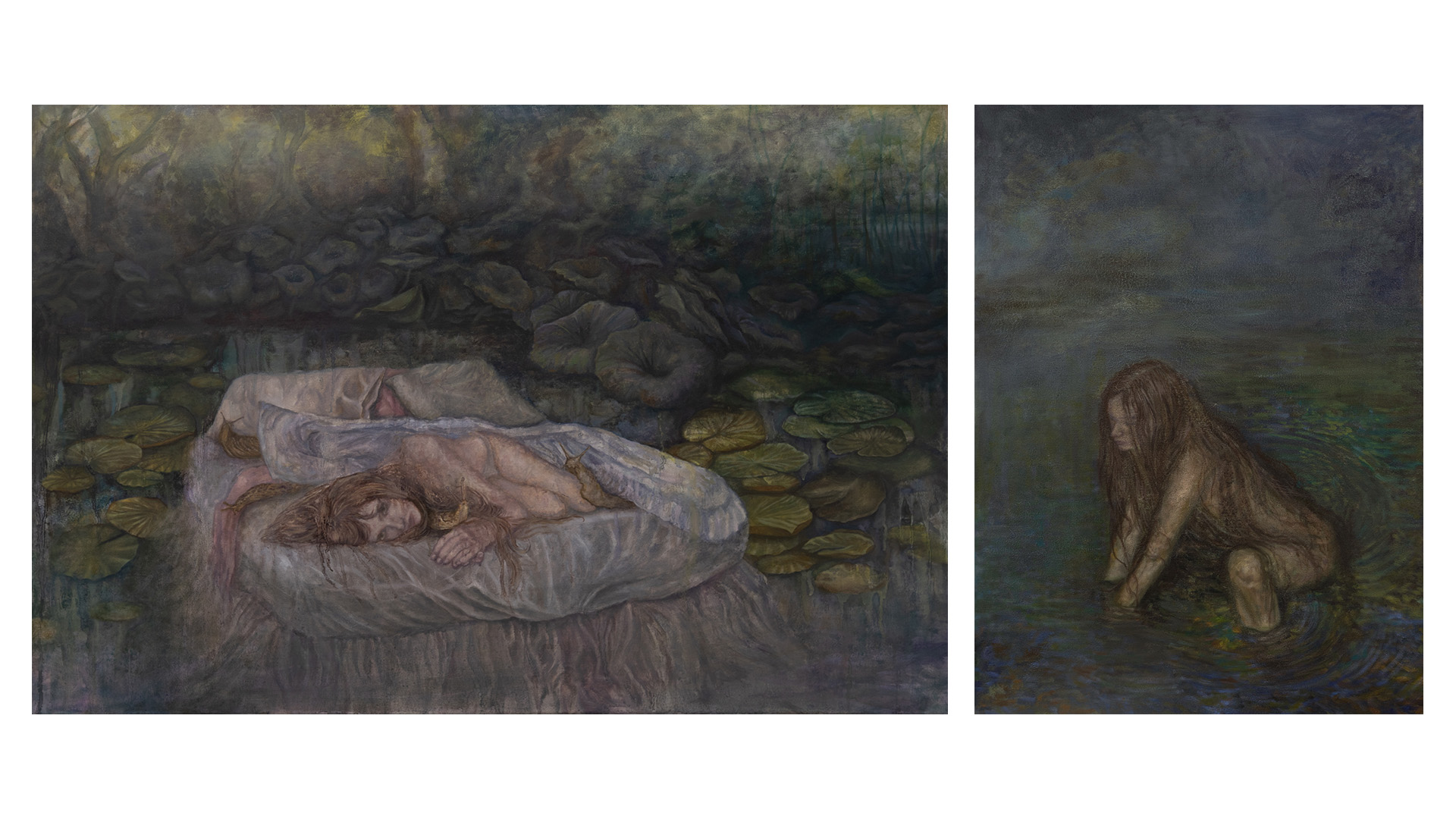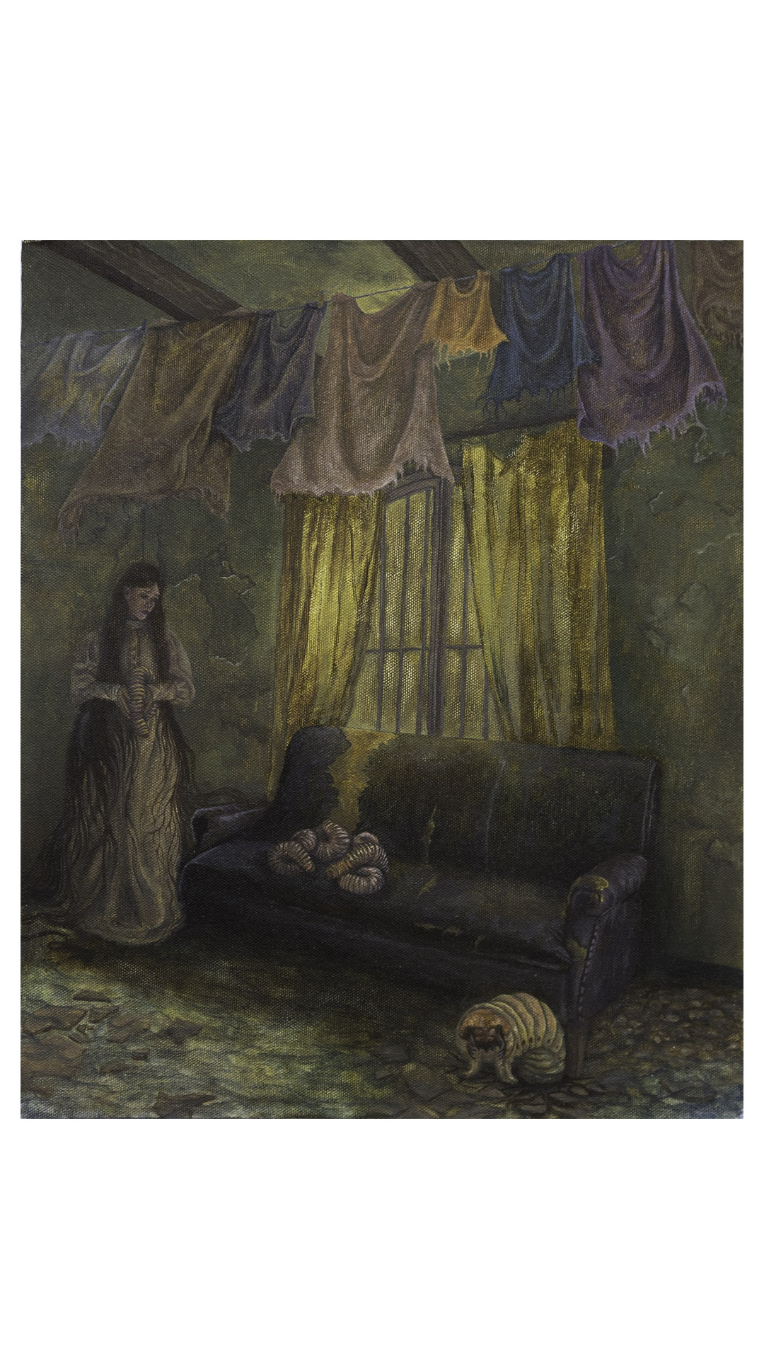 Midst comprises painted dreamscapes, foregrounded by inherent liminality. In these surrealistic realms, female figures dwell in spaces of dilapidation, interiority, ambiguity, and becoming. These atmospheric scenes of concurrent motion and stagnancy, intrigue and revulsion, dereliction and fecundity, unease and comfort, decay and growth—recurring states of ‘in-between’—speak to the liminality of the transitional stage of late adolescence, echoed through the intangible and symbolic world of dreams.