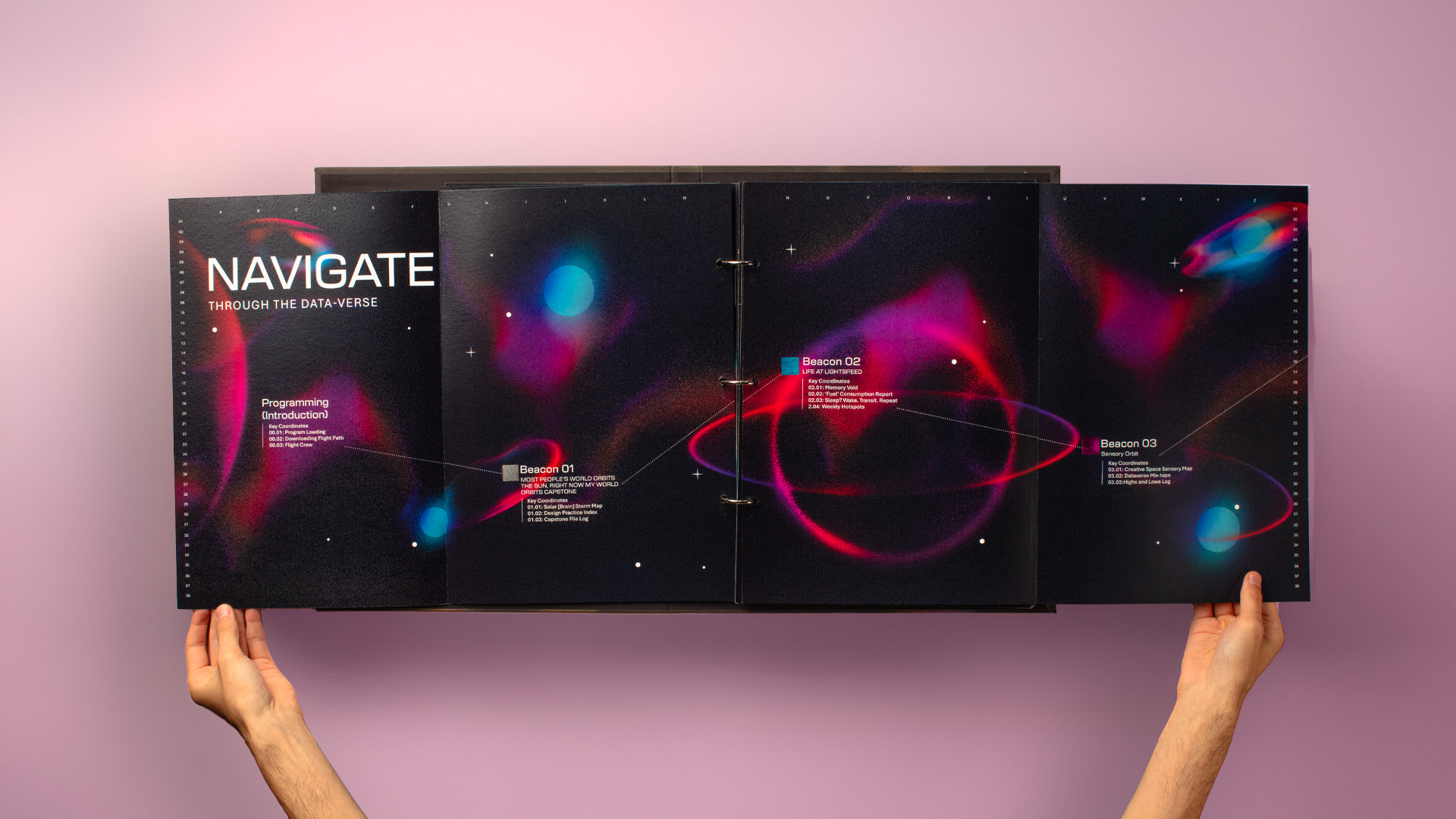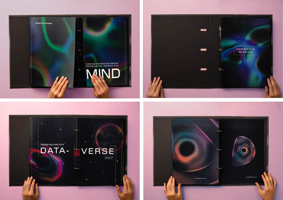 Instead of approaching data as something purely factual or analytical, I’ve used it autobiographically, as a way to visualise and reflect on the details of my everyday life. The work exists as a collection: a publication, poster series, animation, and print collection. Together, they form an exhibition of my “dataverse”, a fluid, light-filled world that imagines my thoughts and experiences as a space voyage through the mind.