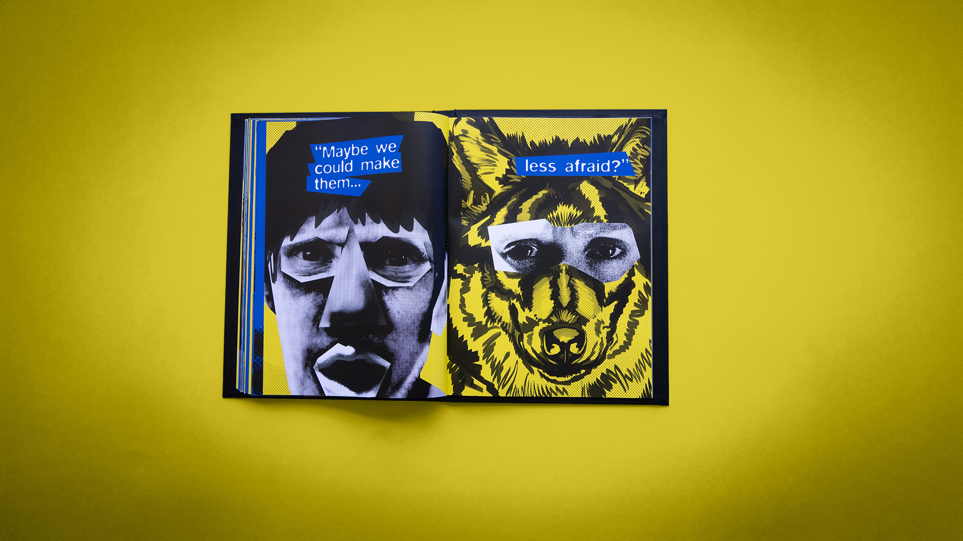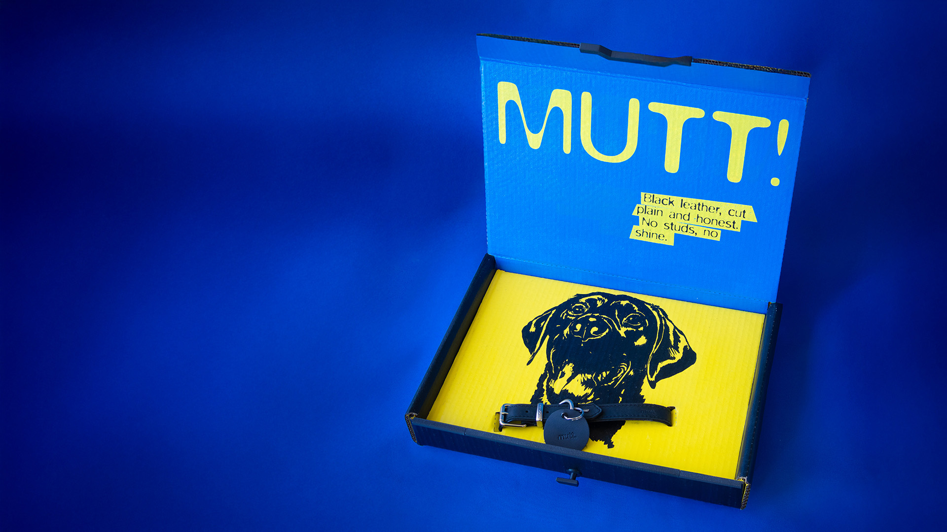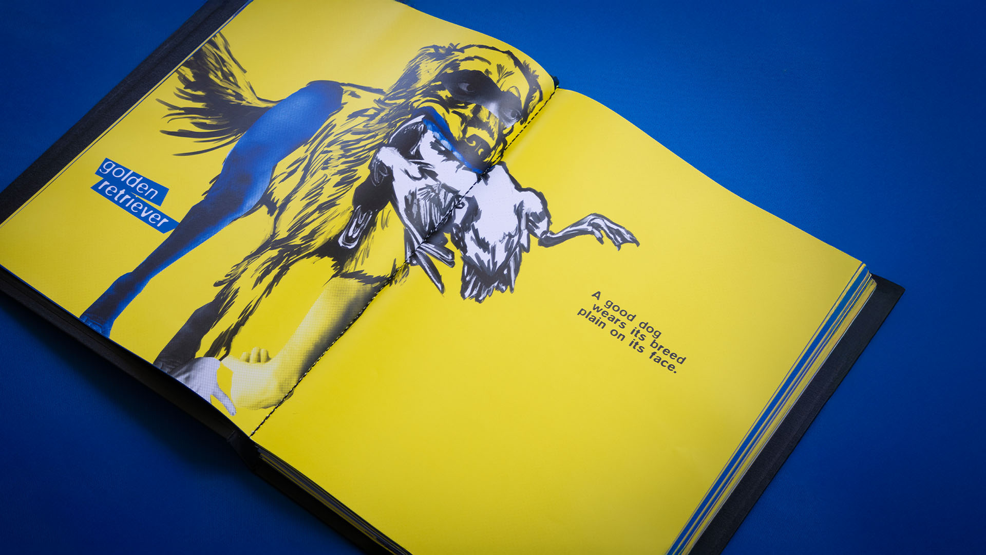 My design responded through a large-format illustrated storybook told in reverse chronology, an oversized collar box, and two looping animations. Key techniques included a limited colour palette and blurred type based on canine vision, fragmented Dada and Art Brut inspired illustration, and cant-like syntax.
