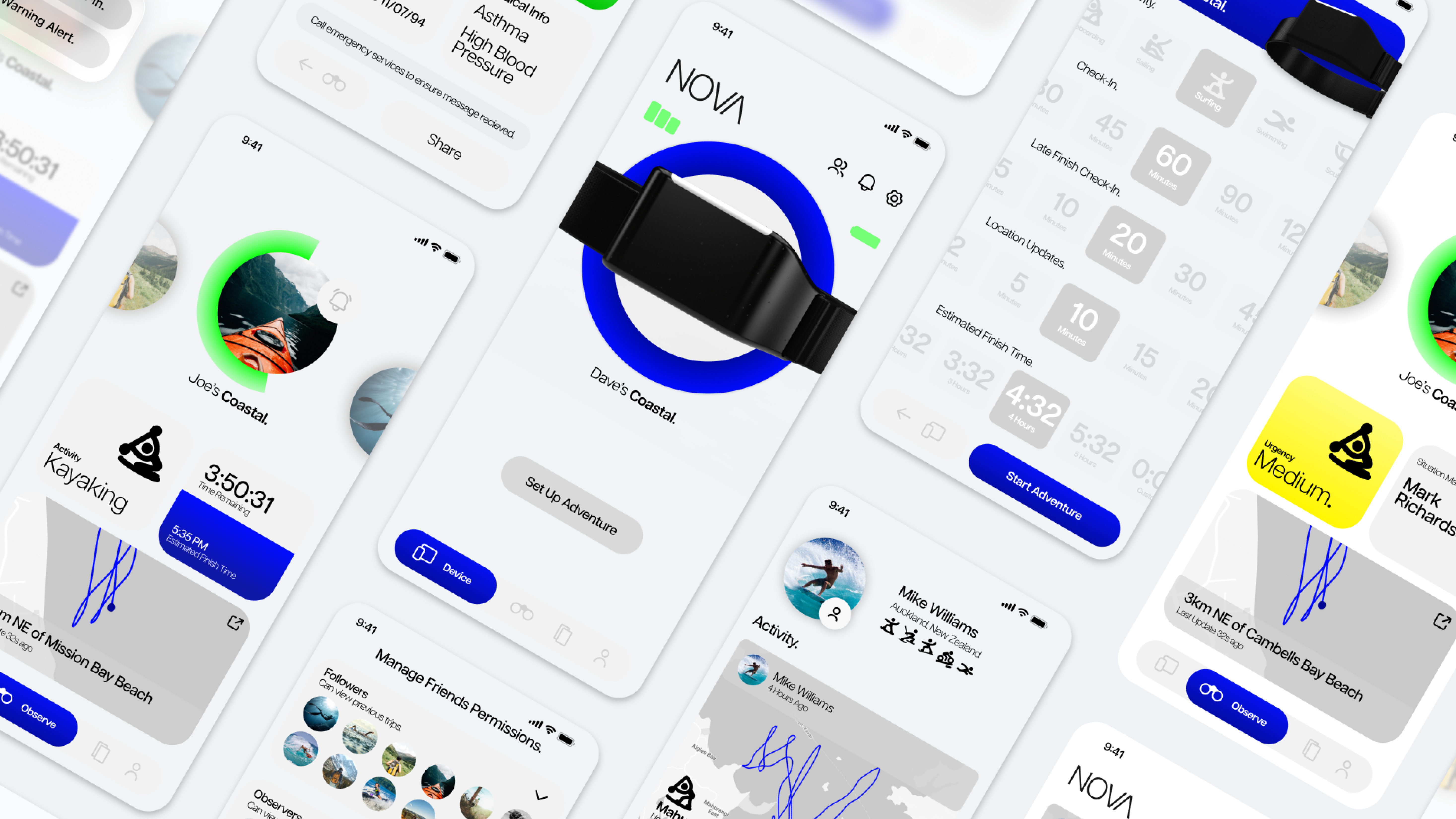 The NOVA Coastal is a personal communication and location device designed to enhance safety for coastal adventurers within 8 km of shore. It reimagines traditional beacons by introducing live tracking, regular check-ins, and distress alerts that connect adventurers, loved ones, and emergency services through a unified platform.