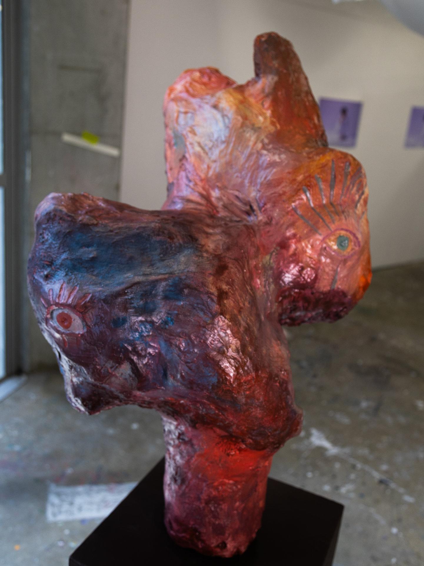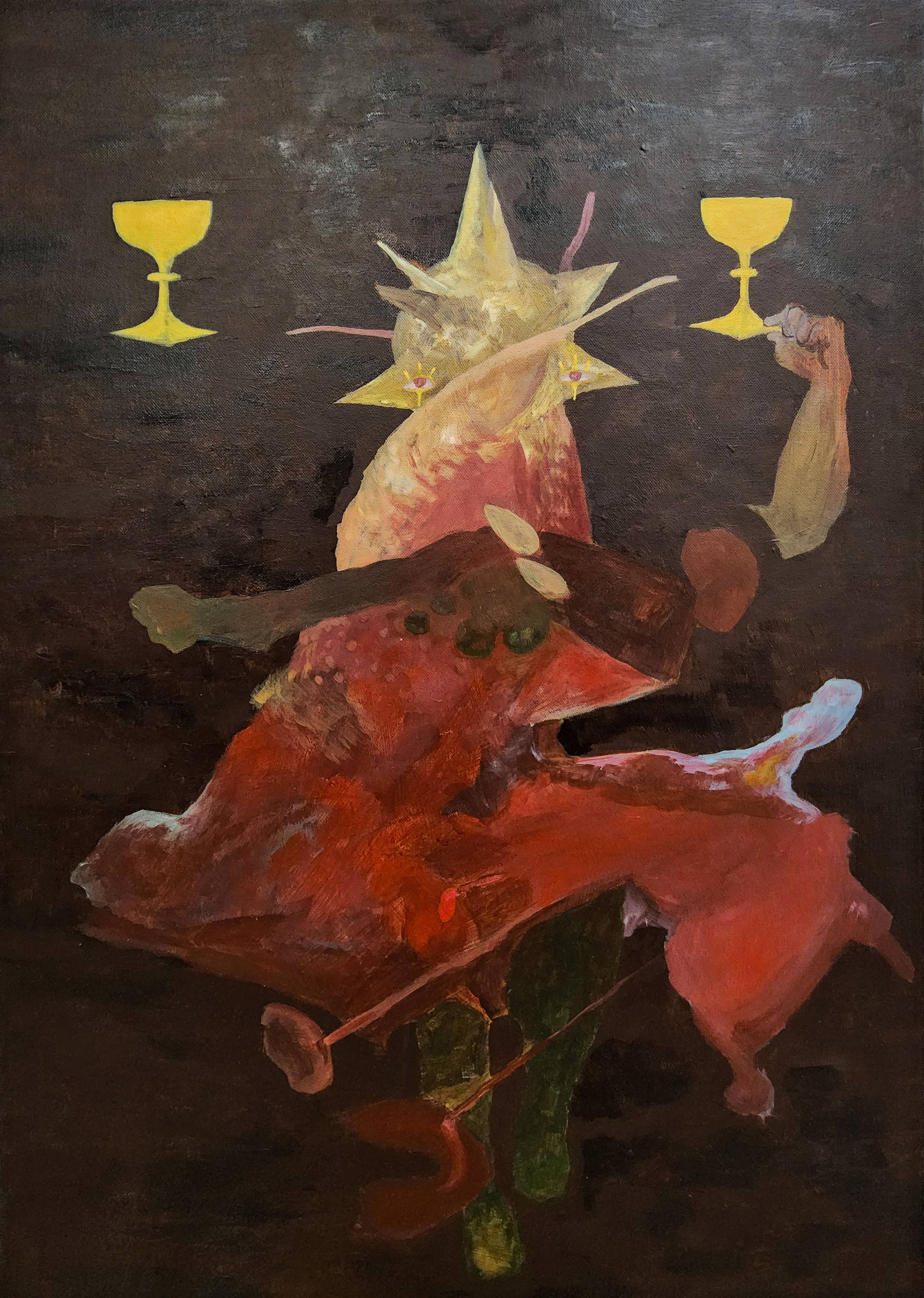 My project utilizes tarot reading to explore the performativity of persona by investigating the identities of my family and friends, leading to confession of queerness. Cautioning against my family's opposing moral attitudes, I suppress my queer identity behind a heterosexual mask that prevents intimate connection with them and distorts my perception of who they are. Conversely, my interactions with friends require less censorship, allowing my authentic self to exist. These create a duality in my self expression which I encapsulate in my plaster sculpture. Longing to express my true self within my family's perception, prompted the investigation into my loved ones’ personas, using oil and acrylic paint I search for agreeable signs through fluctuating identities.