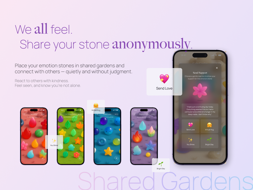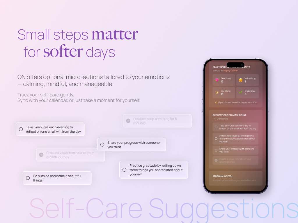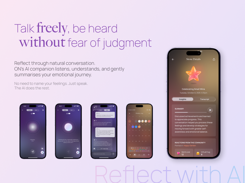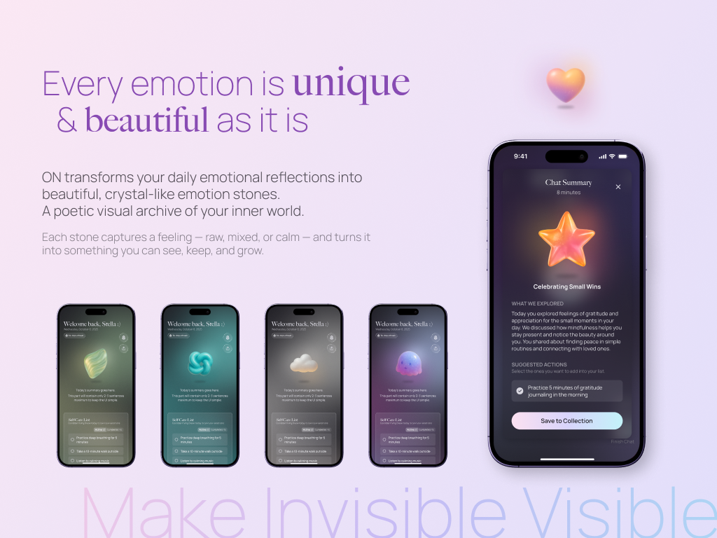 The idea came from my own experiences growing up in a culture where emotional suppression was common to protect myself from being seen “weak”. I wanted to create a space that felt gentle, visual, and emotionally safe. My final design, ON (meaning “warmth (溫)” and “calmness / stability (穩)” in Korean with Chinese characters), is an app where users talk with an AI companion rather than “logging” their mood, and their emotions are transformed into “Emotion Stones” that can be saved or/and anonymously planted in “Shared Gardens” to share other users.