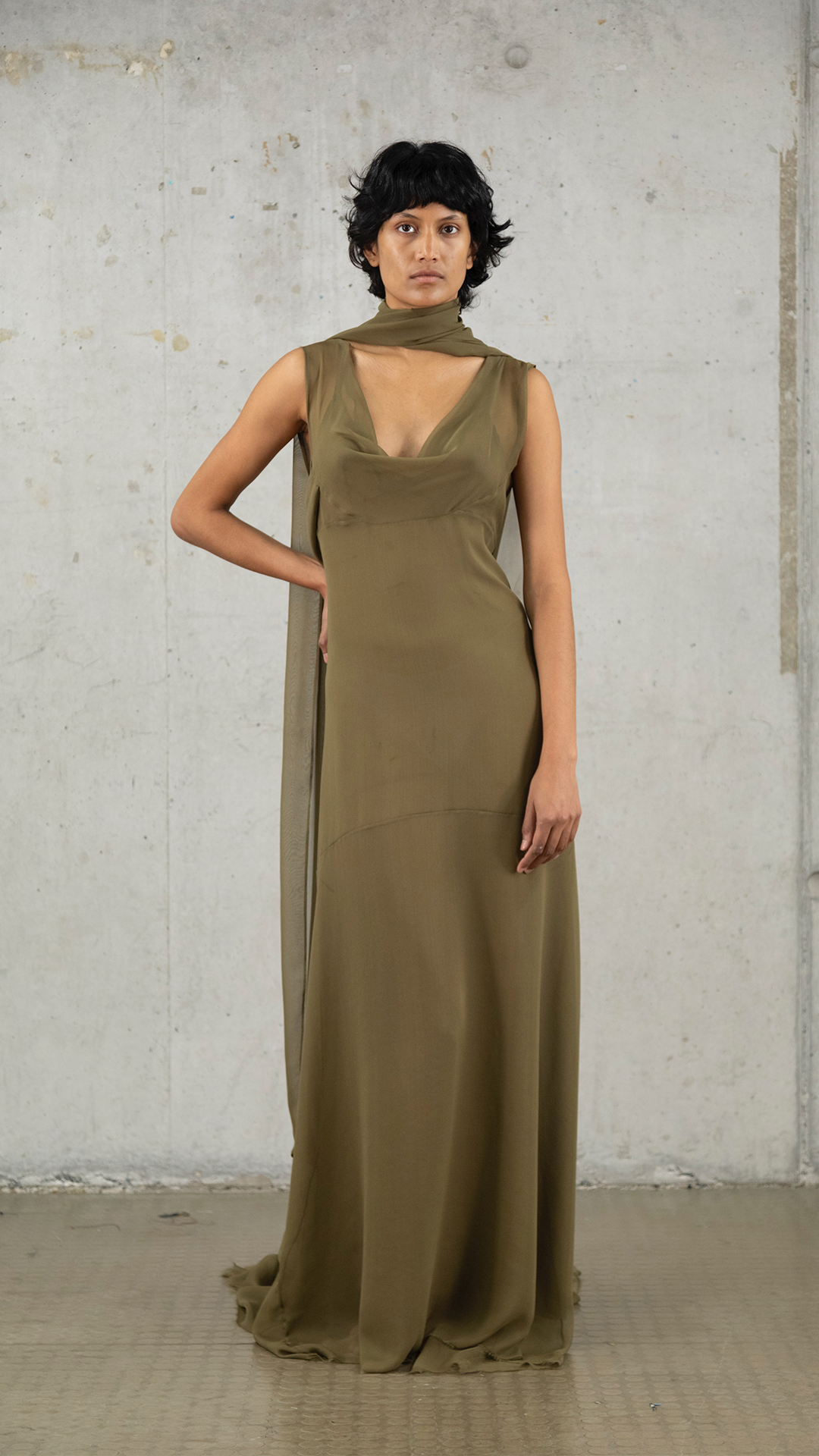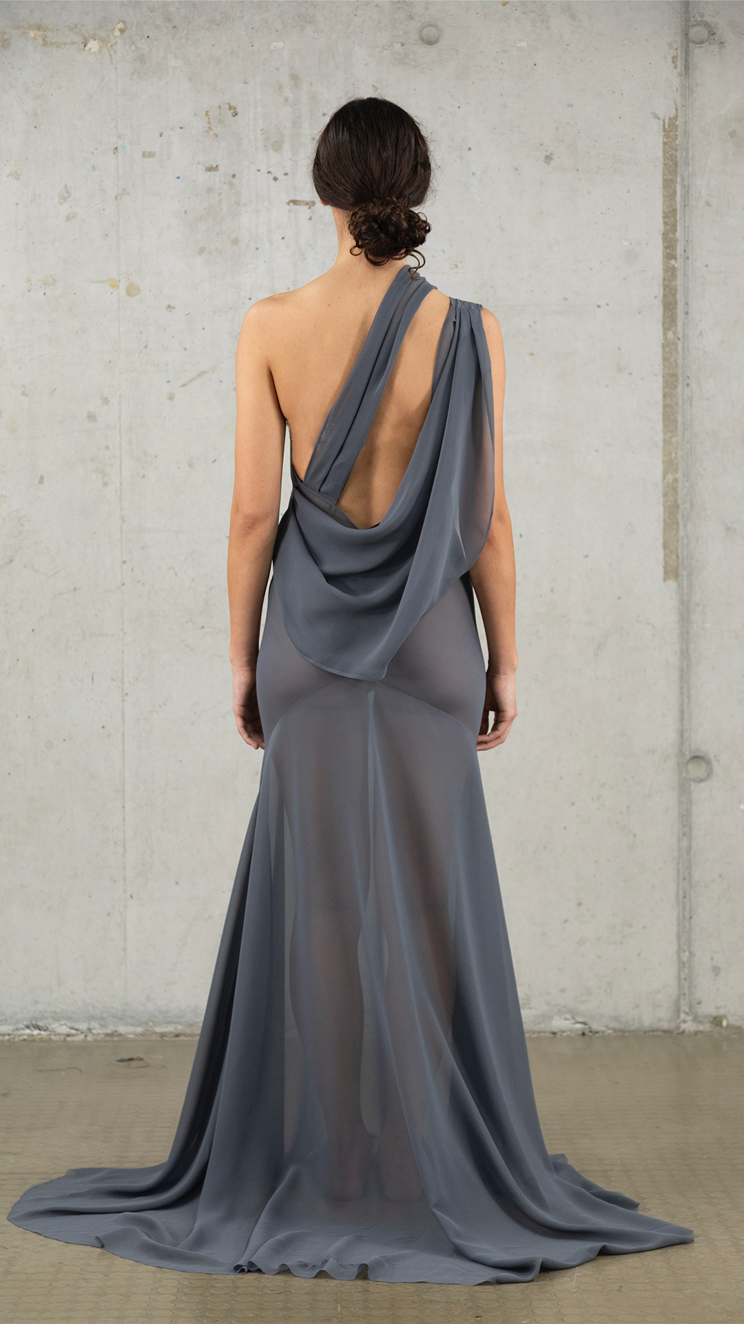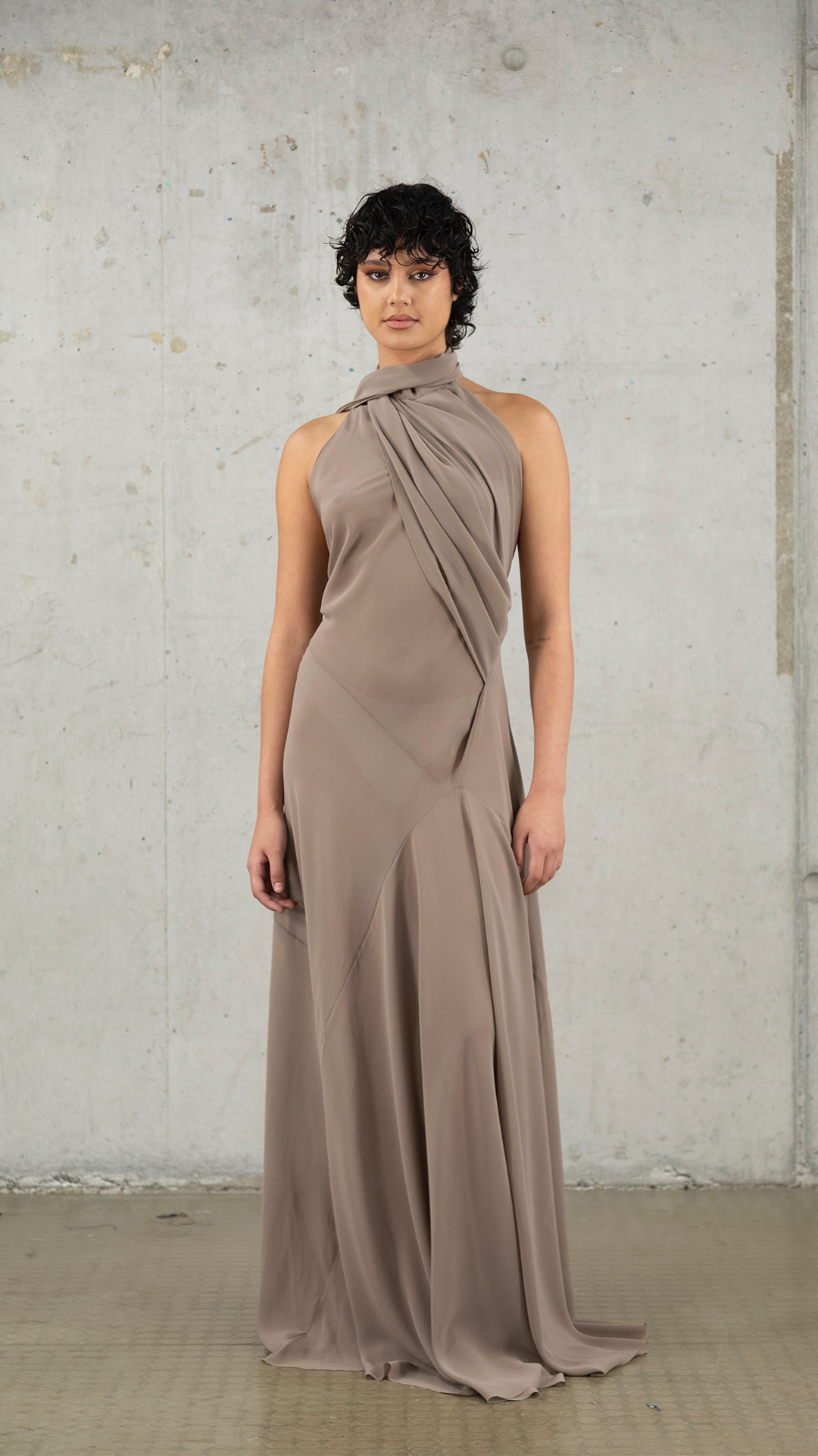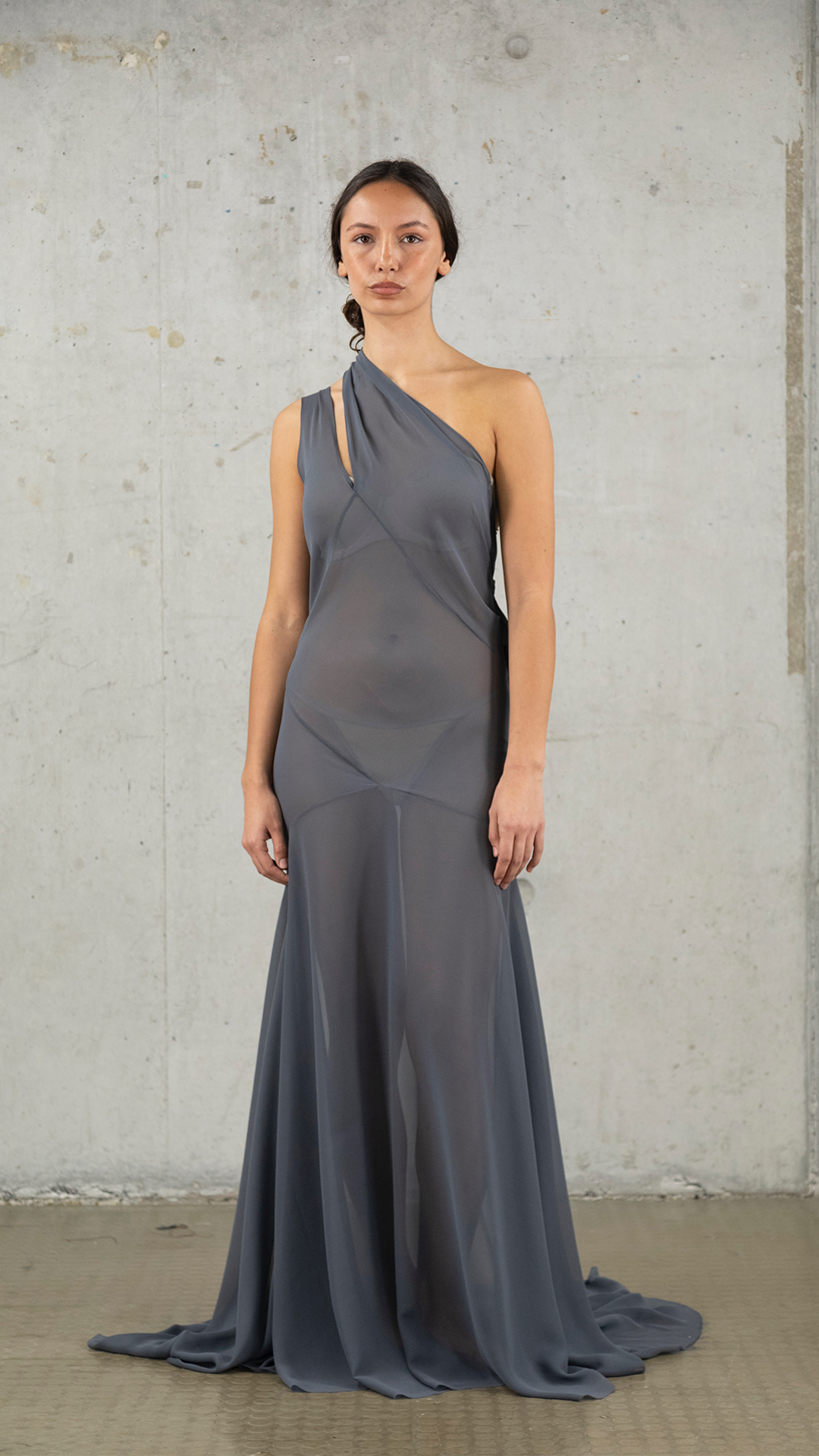 The main idea driving my design was to express shifting identity and emotional resilience through clothing. Draping and bias-cutting were key techniques, allowing designs to emerge organically through interaction with the body. I used silk georgette for its fluidity and lightness, enhancing movement and sensitivity to gesture.