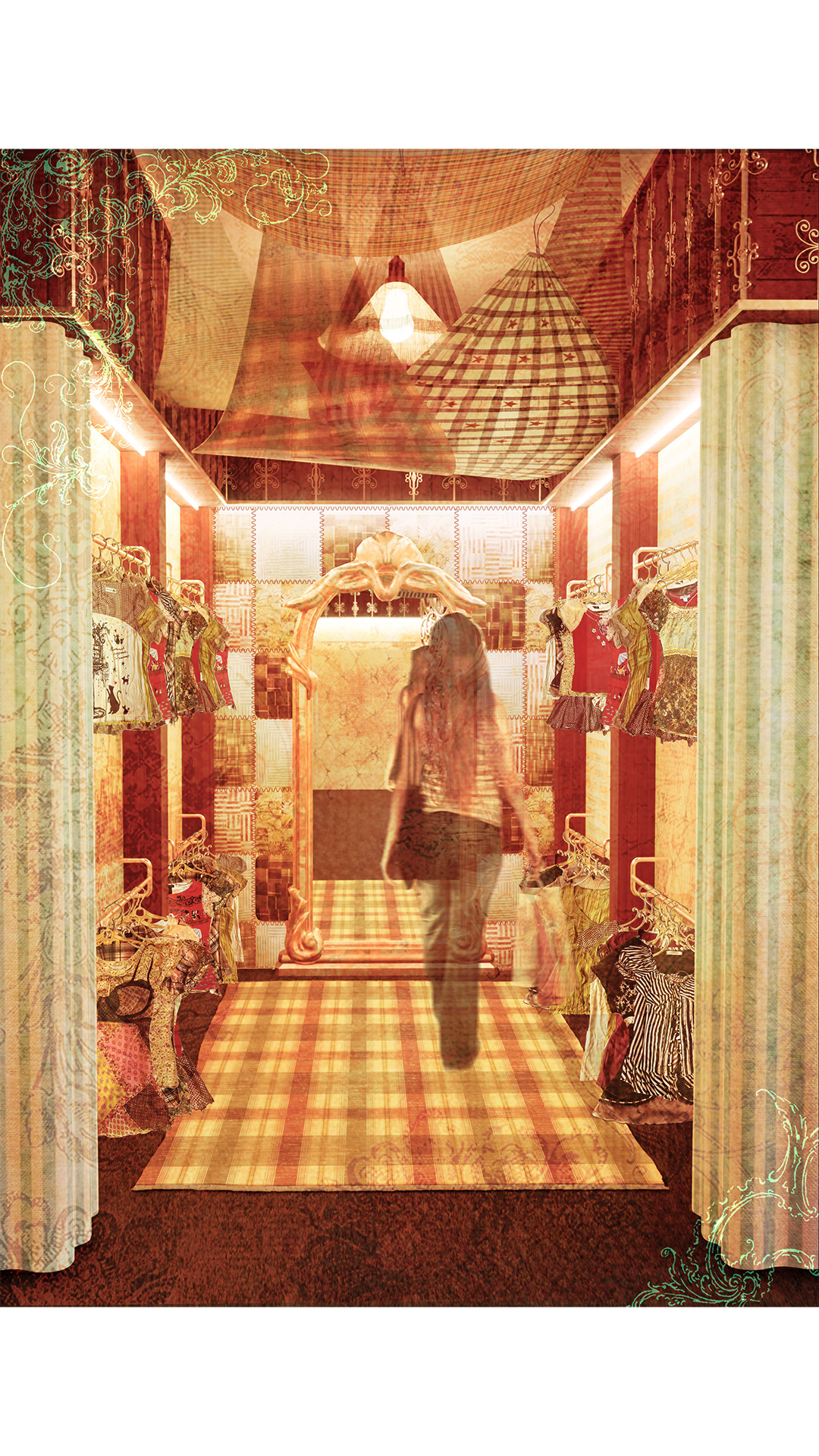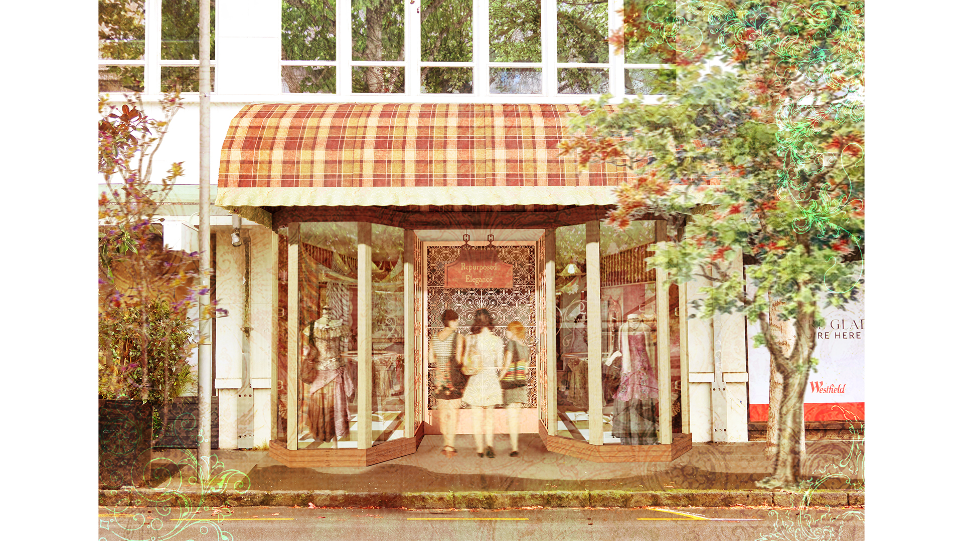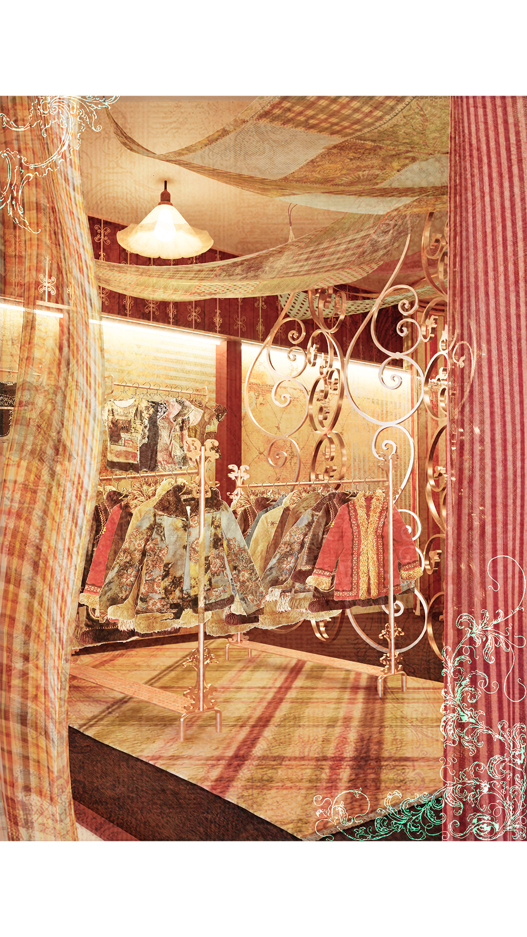 My design, ‘Repurposed Elegance’, is a second-hand clothing store located on Nuffield Street in Newmarket. This project aims to design a niche alternative store to oppose fast fashion within the community. The concept behind this space is about giving clothing and materials a second chance, showing that beauty and value don’t have to come from something new. I wanted this design to challenge the fast fashion mindset, the idea that something loses its worth simply because it’s been used. Every material in the store, from the copper scrolls on the windows, the distressed wallpaper to the patchwork fabric drapes inside, tells a story of transformation. They remind us that age, wear, and imperfection aren’t flaws, but rather marks of life and character. The combination of warm tones, vintage textures, and fabric details creates a sense of comfort and familiarity, aligning with the store’s sustainable and community-focused purpose. By reusing, repurposing, and celebrating imperfection, this space challenges the throwaway culture of fast fashion and offers an alternative that feels personal and authentic. Through the vintage design elements and repurposed fabrics, it encourages people to think differently about what “new” really means.