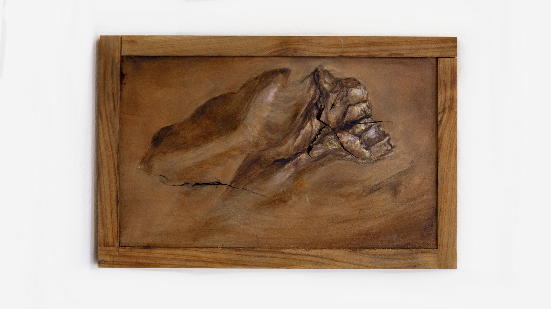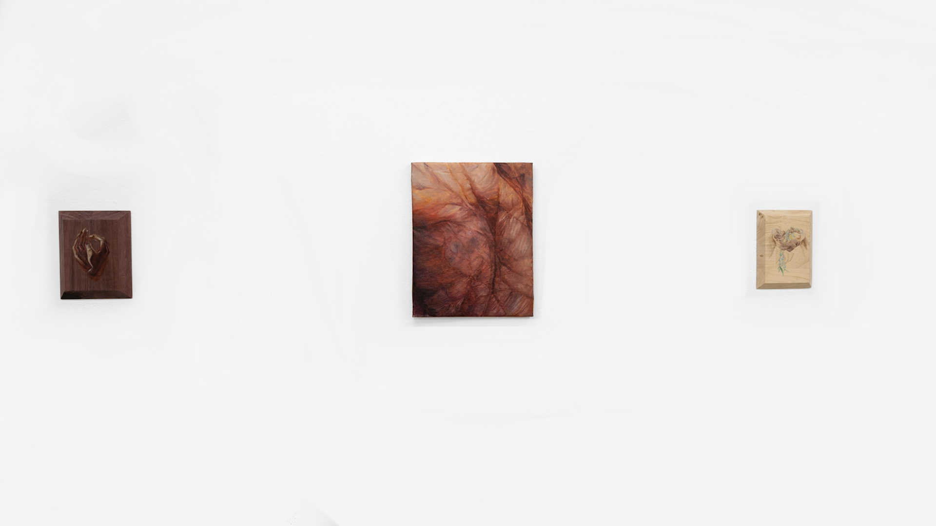This complex relationship is examined across different modes of making: painting on textured rich canvases and minimal wood substrates, using grounding browns and glowing iridiscence, and considering scale in relation to one’s body.