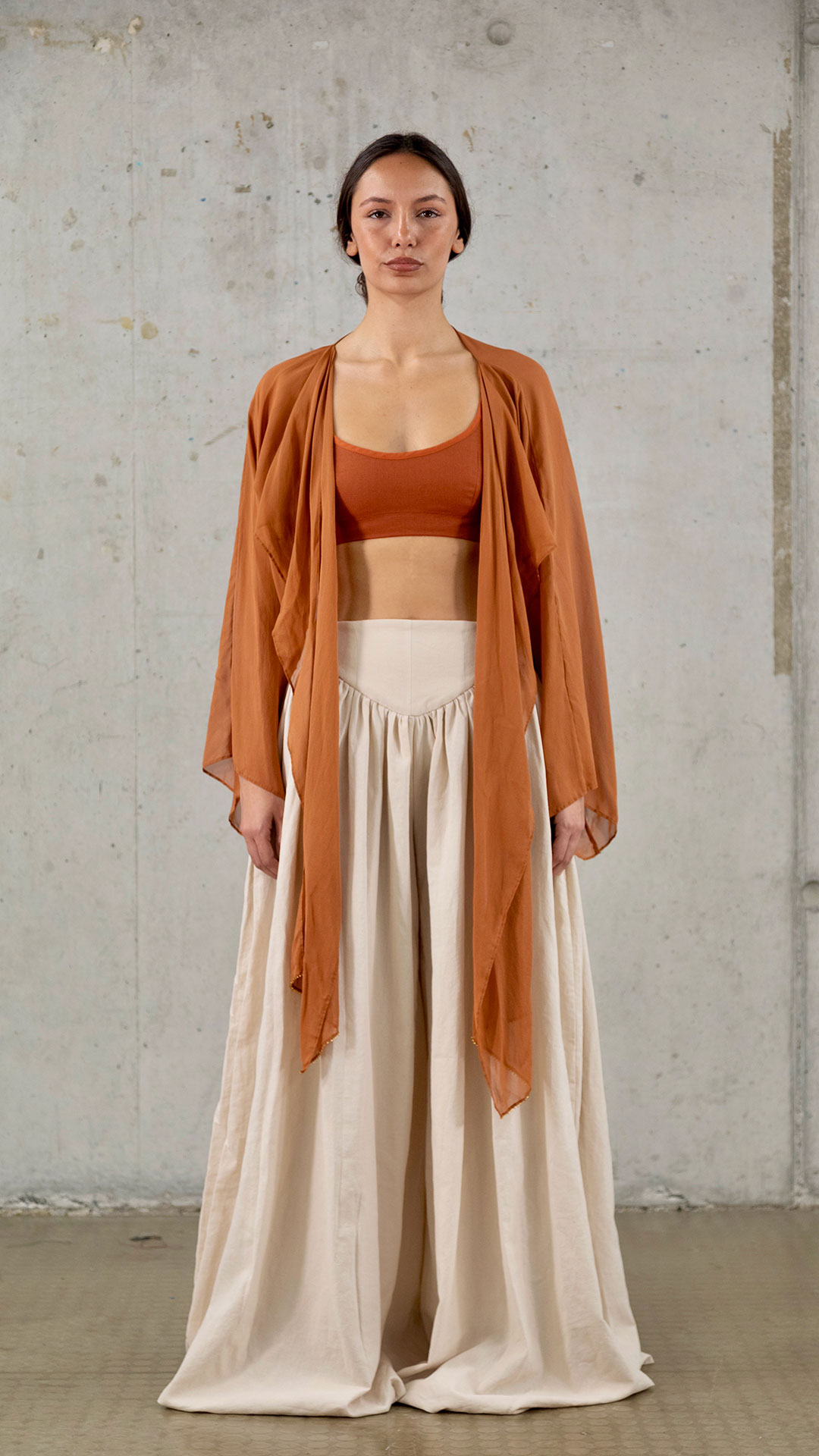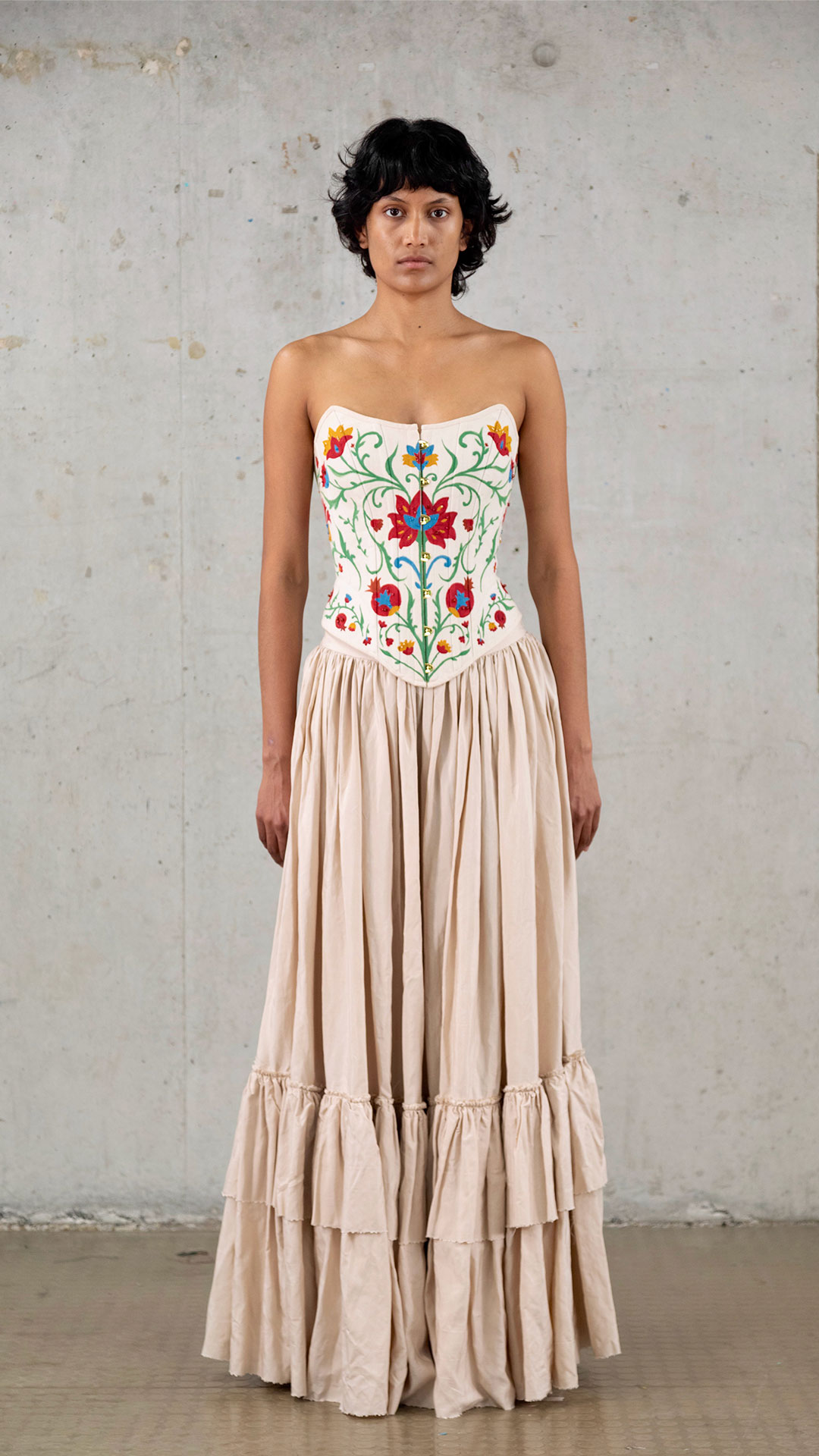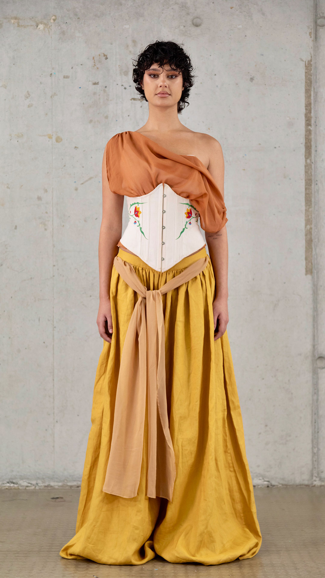 Silk & Sand explores the connection between craft, culture, and fashion, taking inspiration from the Silk Road and the travellers like Marco Polo. My work explores the art of corsetry, focusing on developing and refining my craftsmanship while mastering structure and exploring softness and form. Inspired by the free-spirited nature of those who once journeyed across the Silk Road, I used handcrafts such as hand painting, beading, and draping to create layered, textural garments that balance structure and softness. Rooted in slow fashion and couture practice, this collection celebrates the artistry of making and the value of thoughtful, handcrafted design.