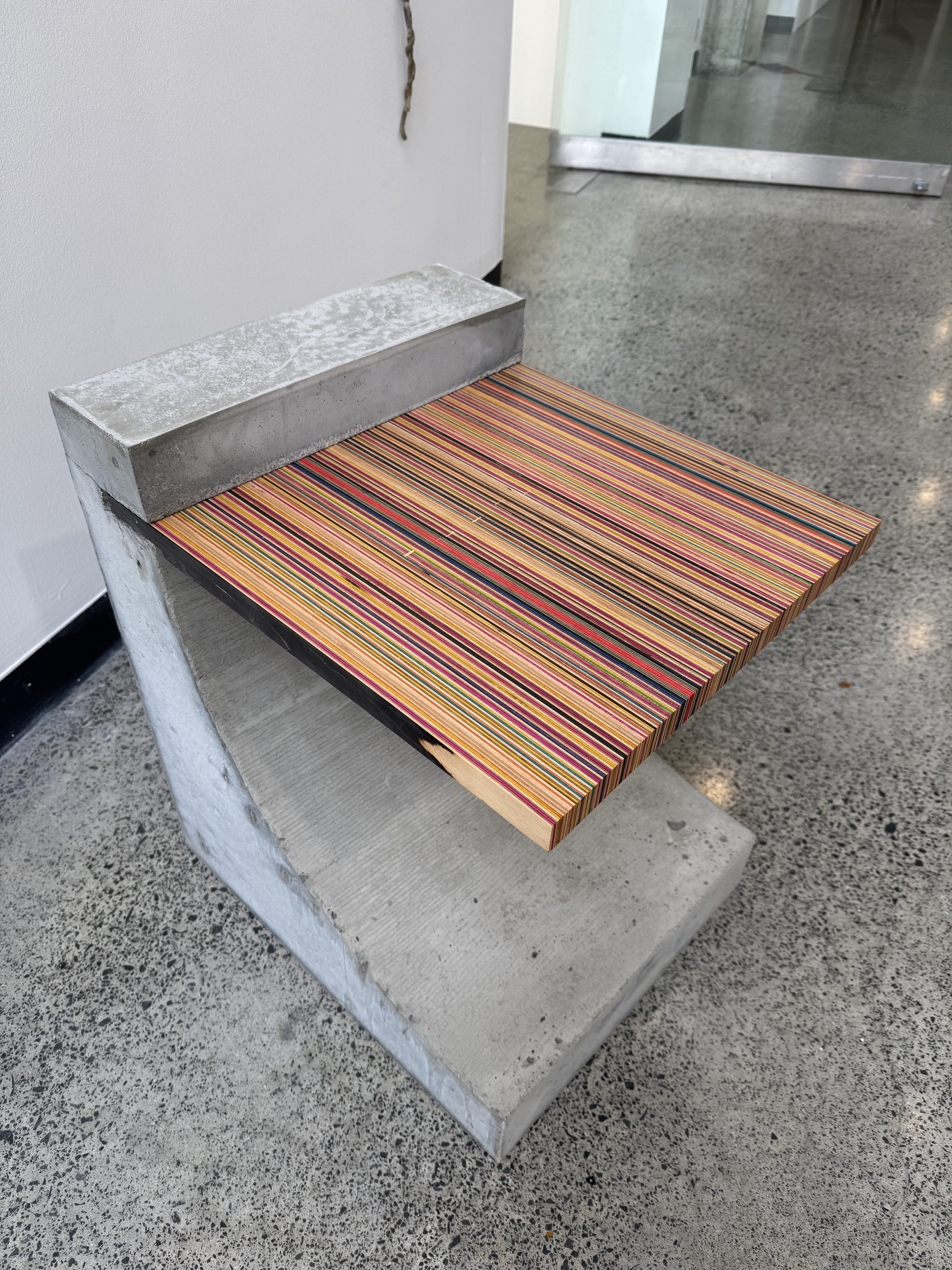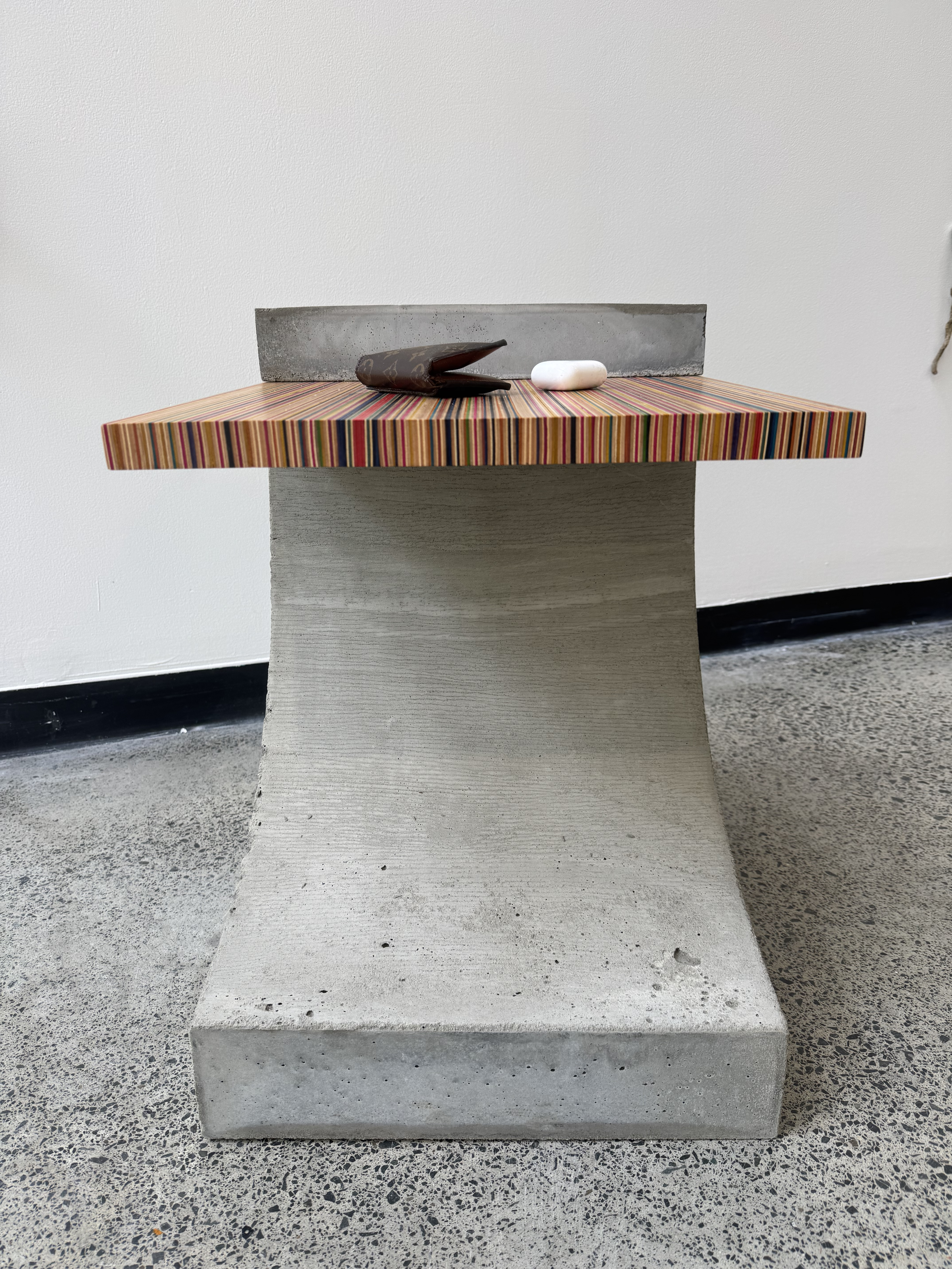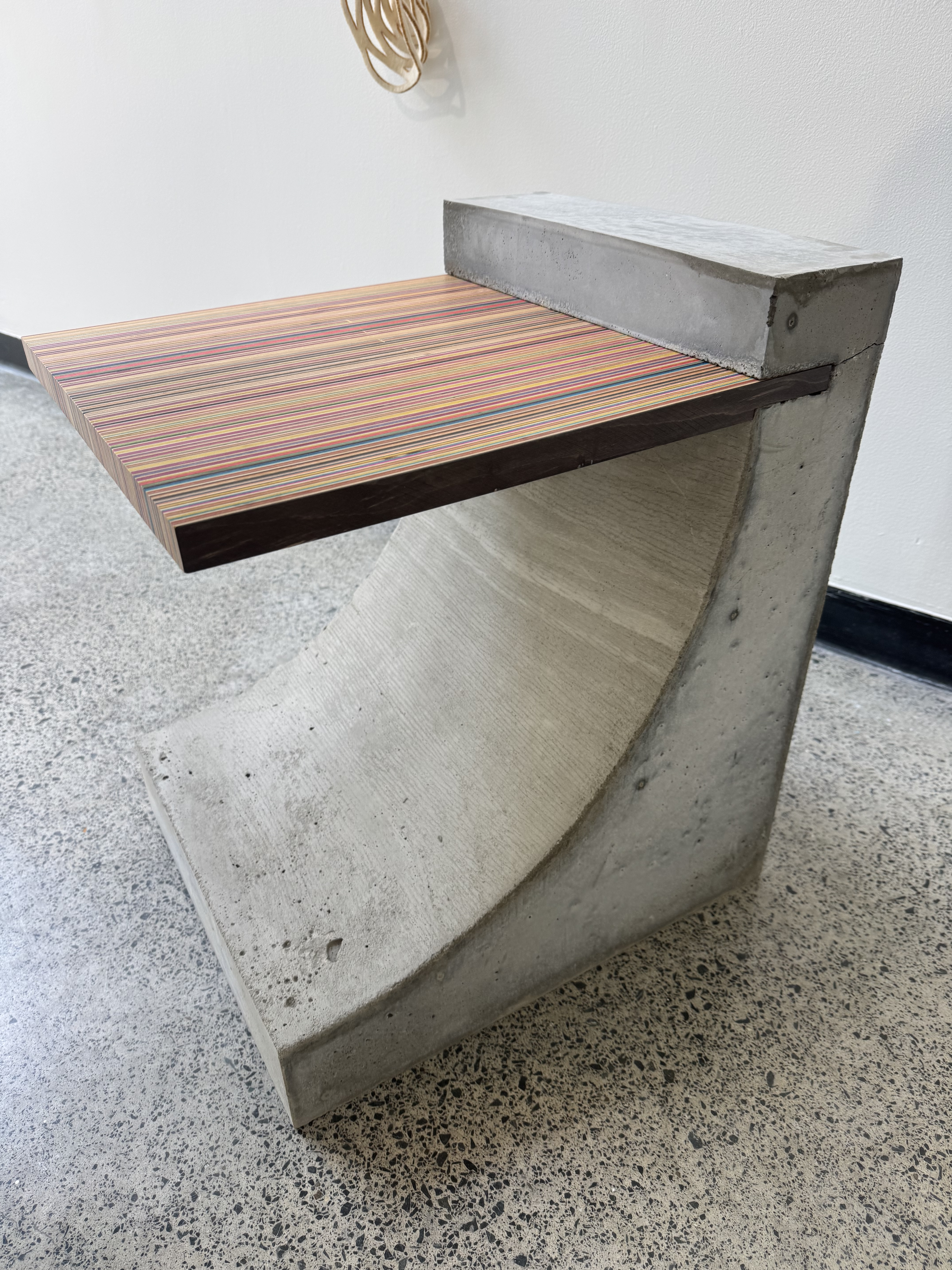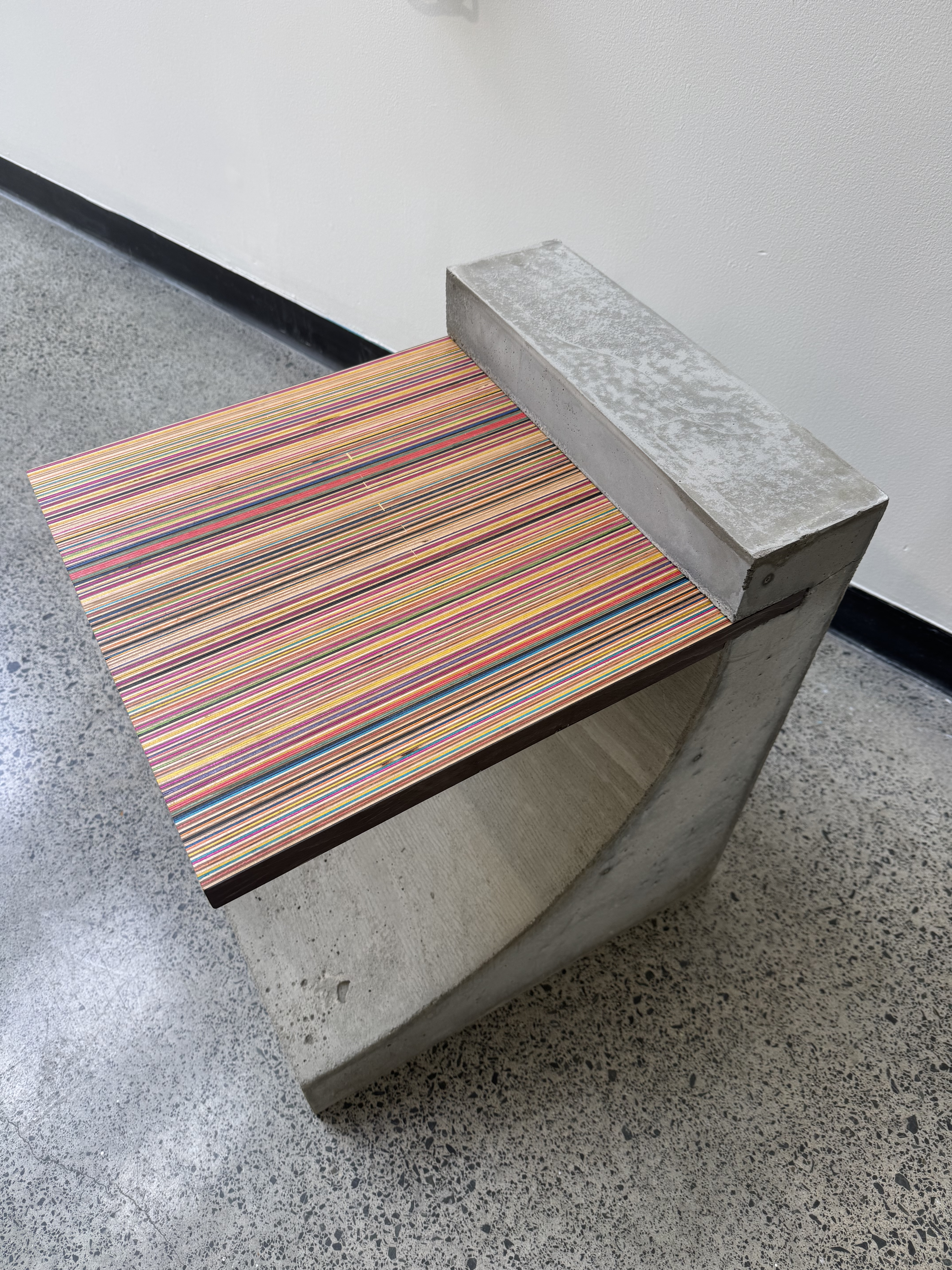 My project explored how recycled skateboard decks and concrete could be combined to create a bedside table that captures the character of skatepark design. The brief asked me to design a functional, everyday object that communicates cultural identity while addressing sustainability. My main idea was to transform discarded skateboards—objects rich with history and texture—into a material that expresses the creativity and resilience of skate culture.