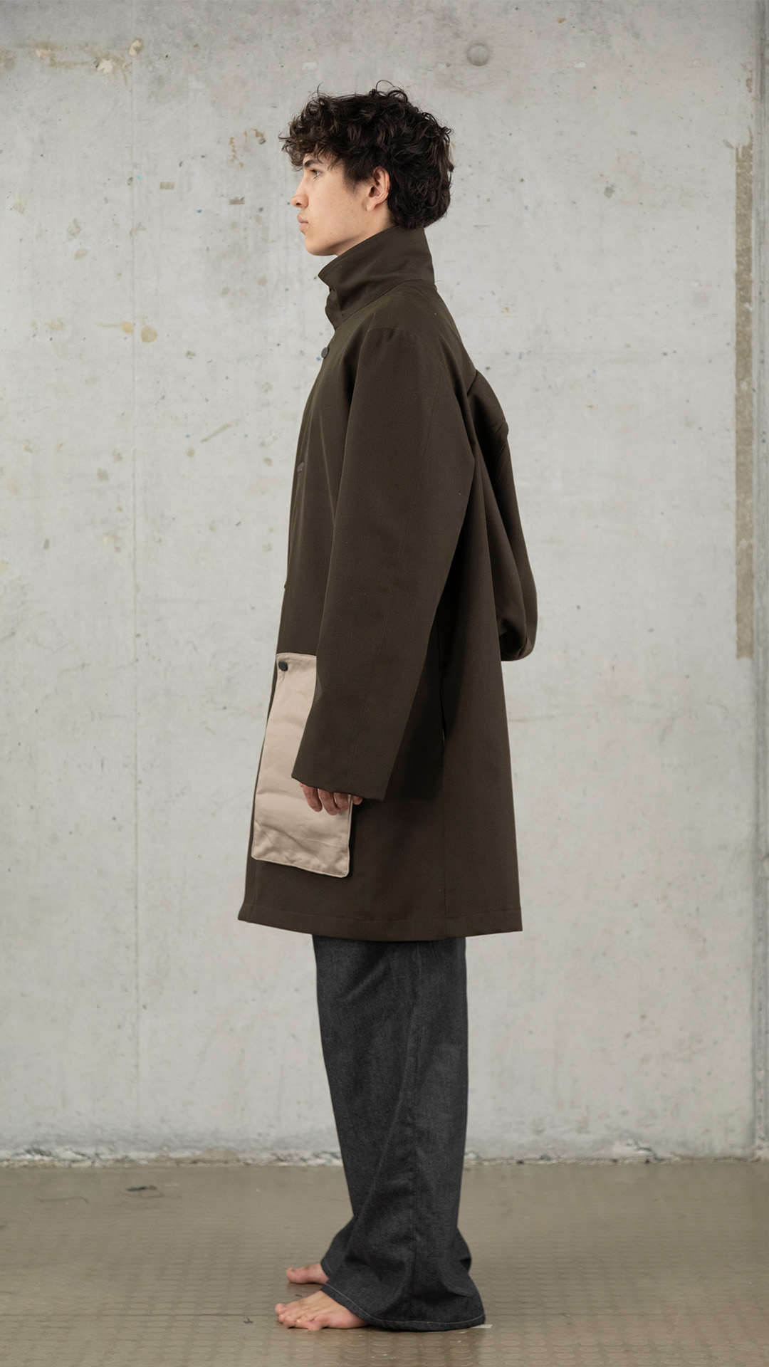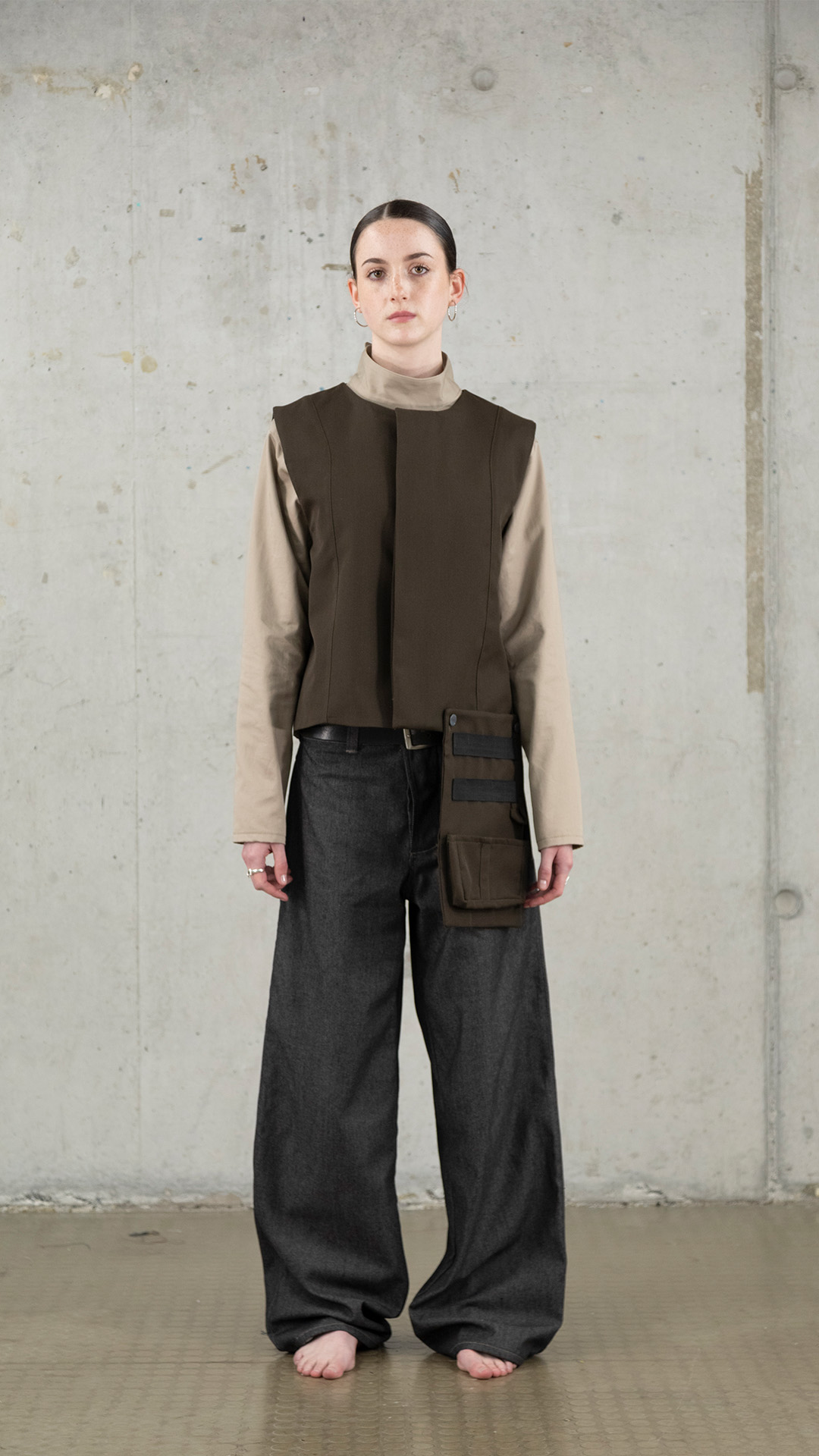 As a society, we are more disconnected than ever. This project proposes super-modern garments as tools for human reconnection and digital mindfulness. Through modular design, my work reclaims presence while fighting fashion over-consumption, offering wearable systems to resist technological distraction and regain meaningful, grounded interactions. Reconnect is driven by my sustainable, problem-solving mindset. Drawing on historical garments, I solve modern problems through a speculative lens that responds to our increasingly transitional world. I use experimental pattern-making ideas in order to construct the garments with human connection in mind, openings at the serve as a visual cue for someone to help or interact with the wearer. This work advocates concious consumption, by providing adaptable fashion systems that carry personal narrative. By promoting intentional wearing, I hope to draw a connection between garment and wearer to prevent premature disposal and to protect our whenua.