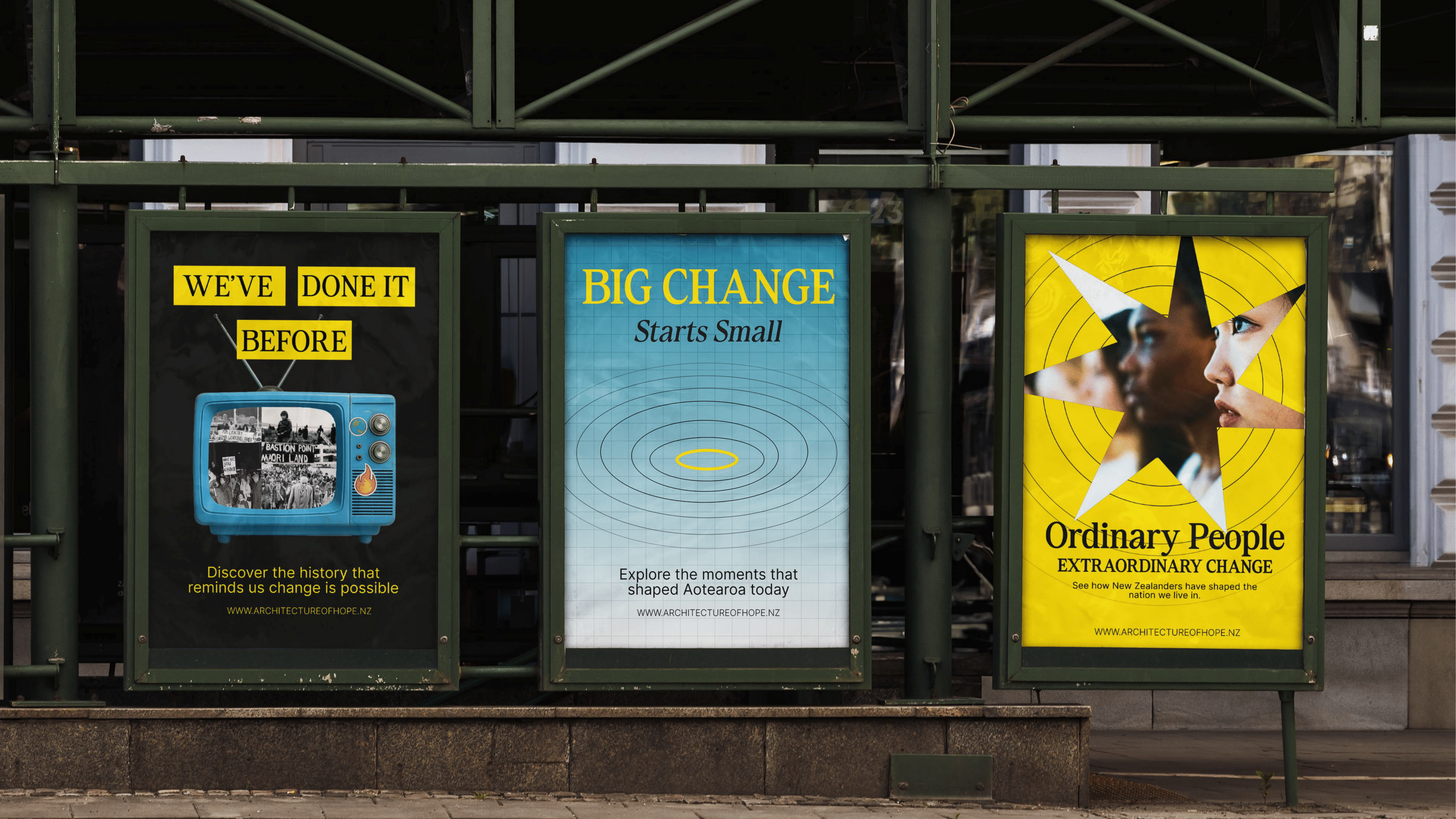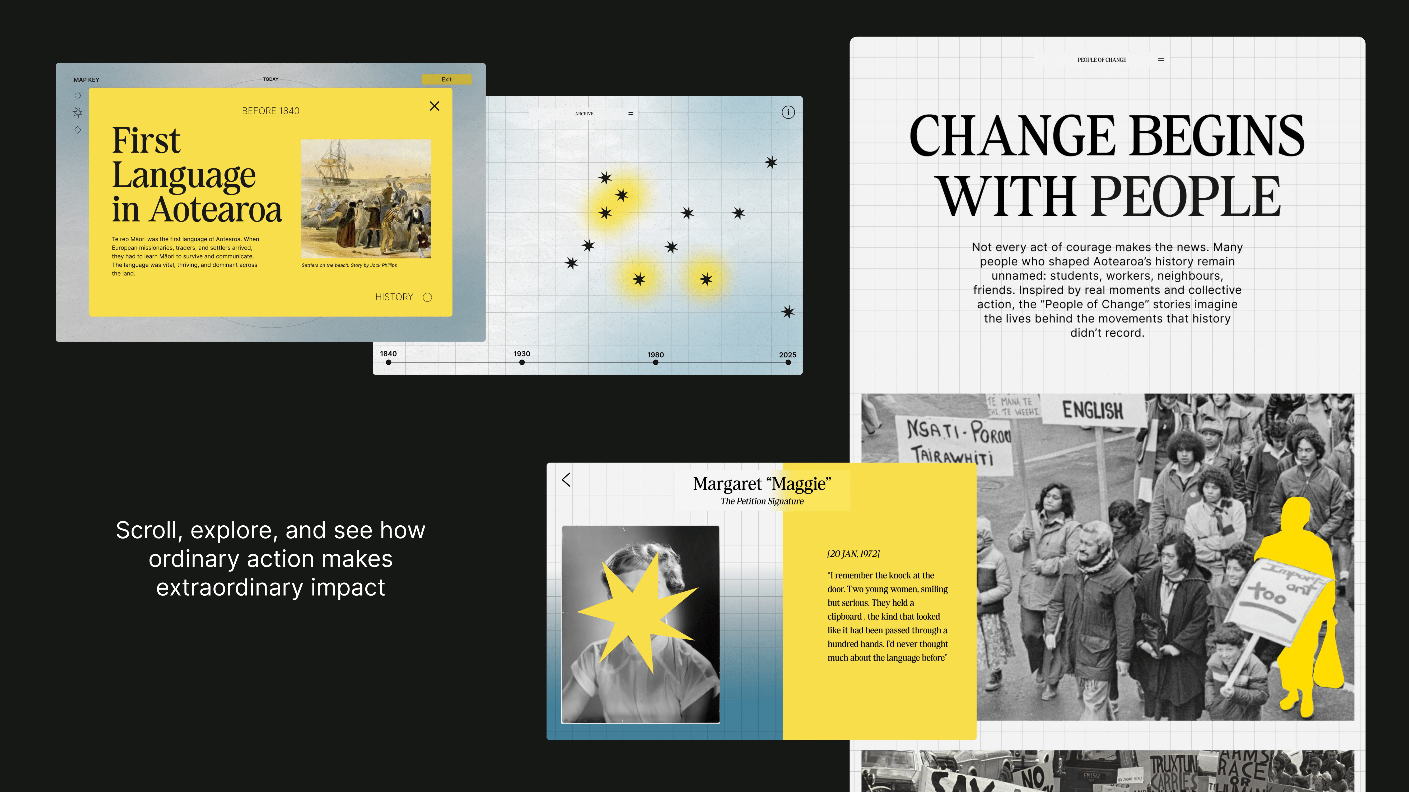 The Architecture of Hope is an interactive digital archive mapping moments of collective action across Aotearoa’s history. Using the metaphor of a ripple, it visualises how small actions like signing a petition, marching, or voting, can grow into larger movements and change. Key features include a visual map that lets users explore how events connect over time, an interactive ripple timeline and speculative storytelling inspired by archival photographs.