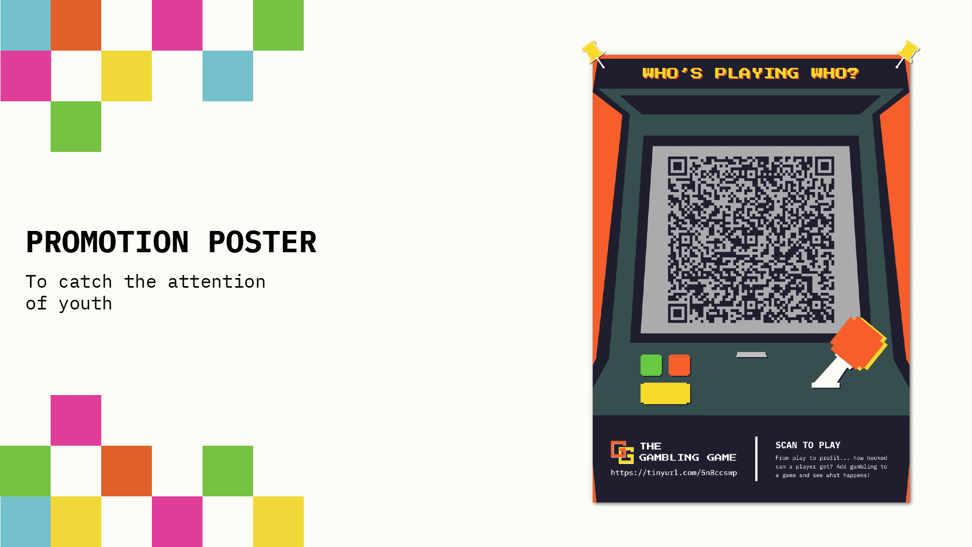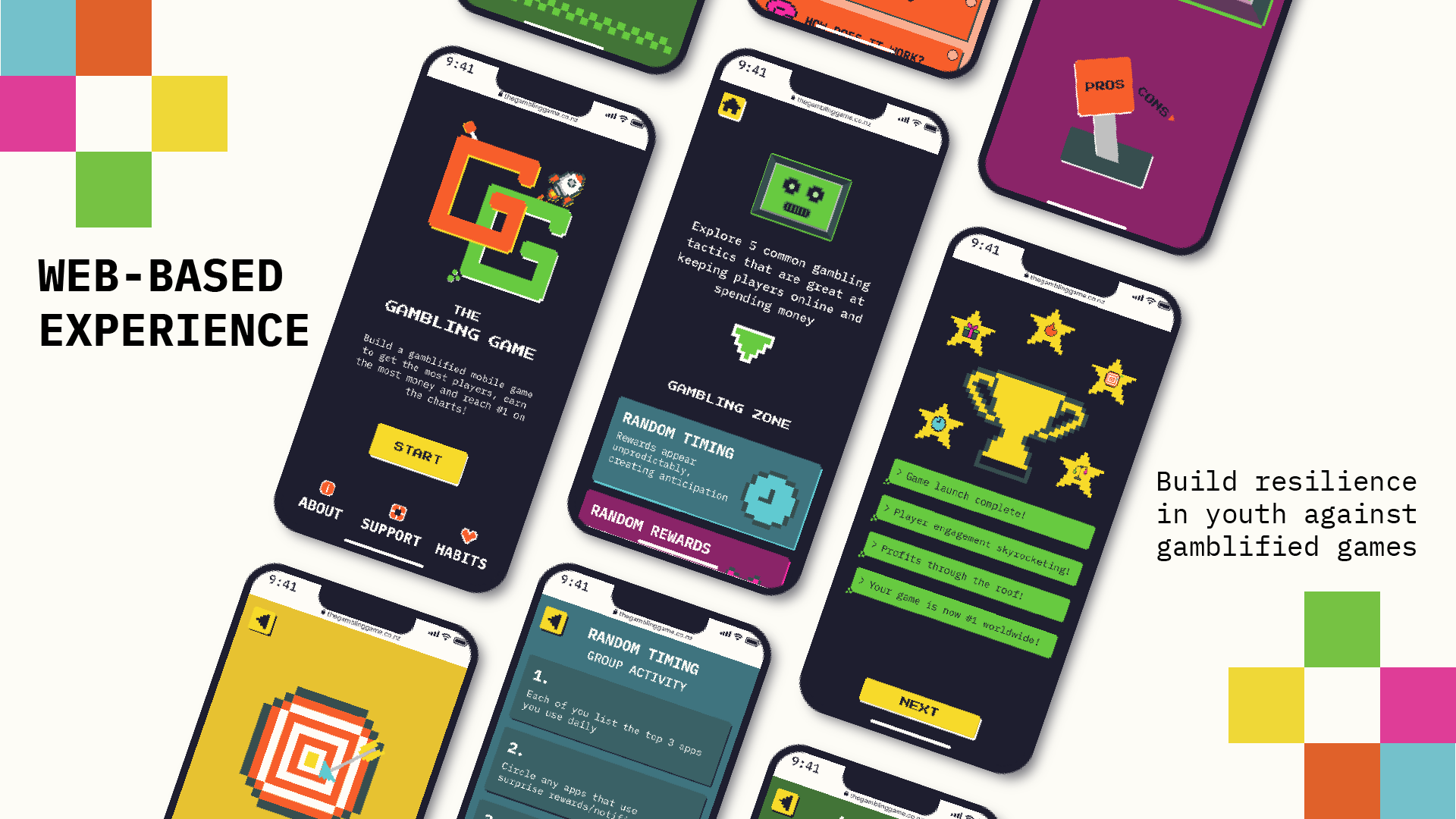 The Gambling Game is a web-based simulation that teaches through role reversal. Players work with the “Game Screen” to design addictive features and observe their effects on a fictional player’s wellbeing. This playful yet critical experience applies inoculation theory and scenario-based learning to make awareness interactive rather than instructional.