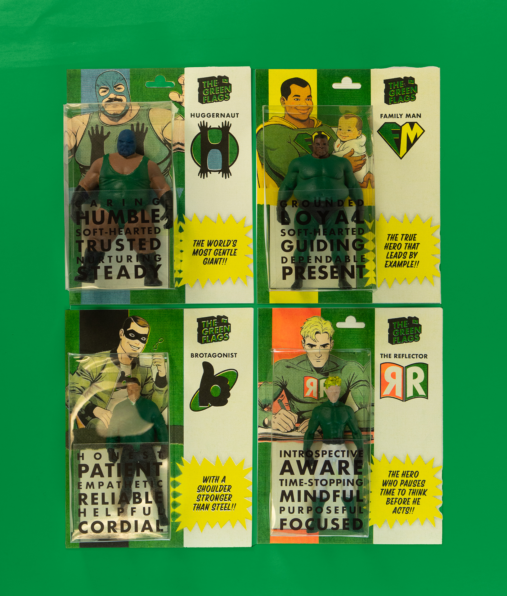 Using a toy-based campaign as its central idea, the project parodies traditional “action hero” culture to question how society shapes ideas of masculinity. Through practice-led research, it draws on perspectives from mental health professionals, statistical data, and men from around the world to form a framework for “healthy masculinity.” This framework informs a series of design outputs developed through an ongoing process of experimentation and reflection.