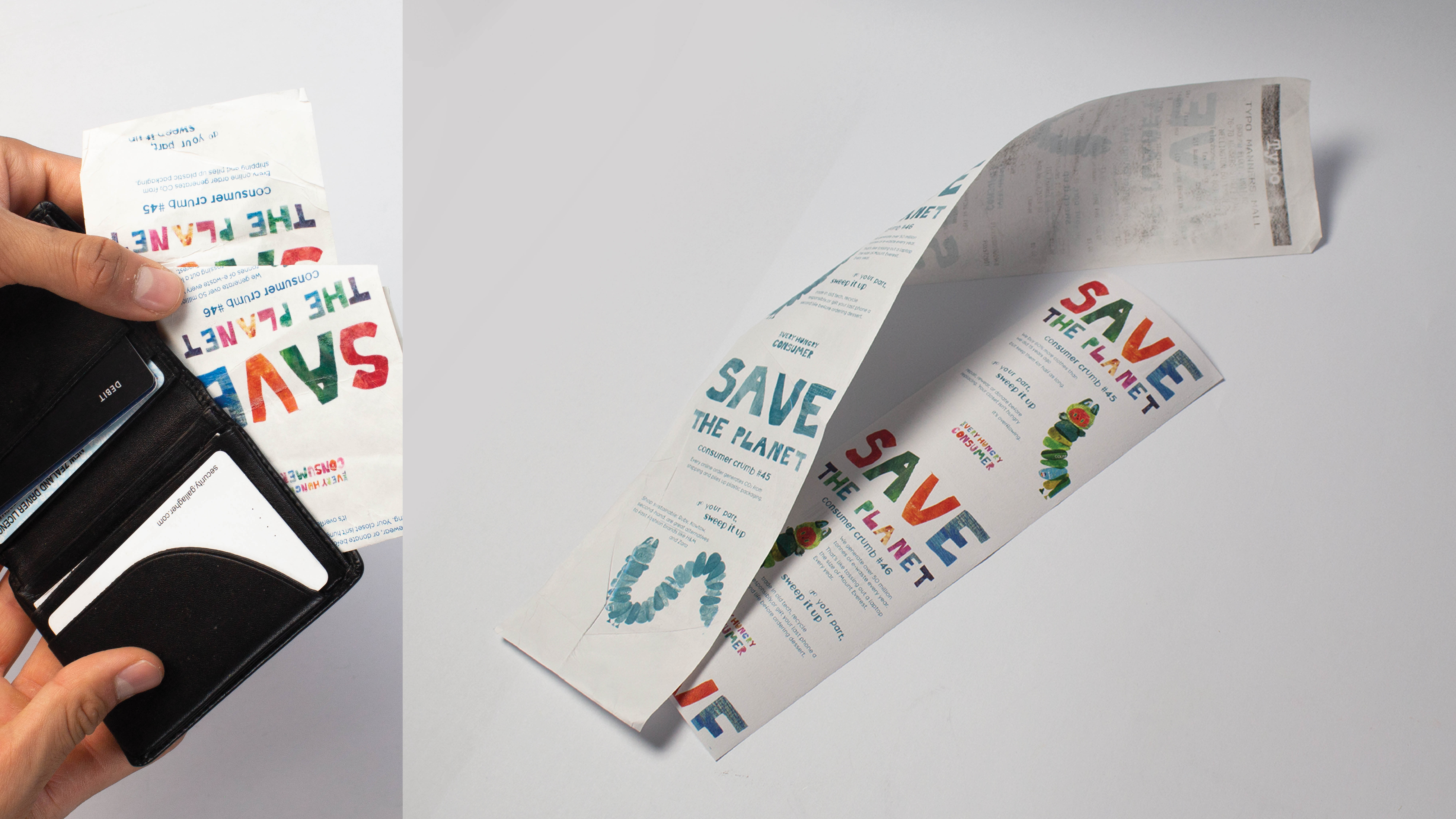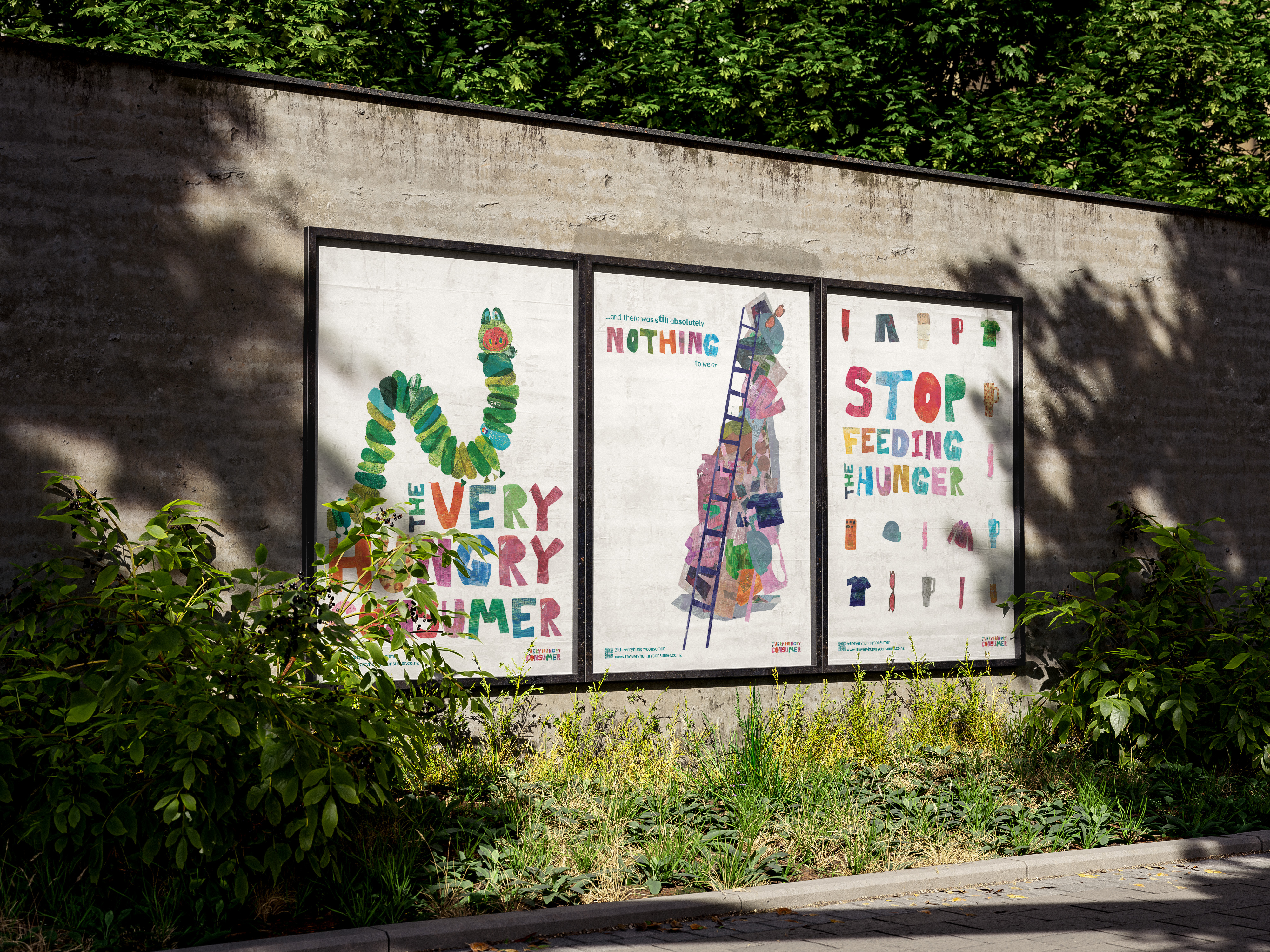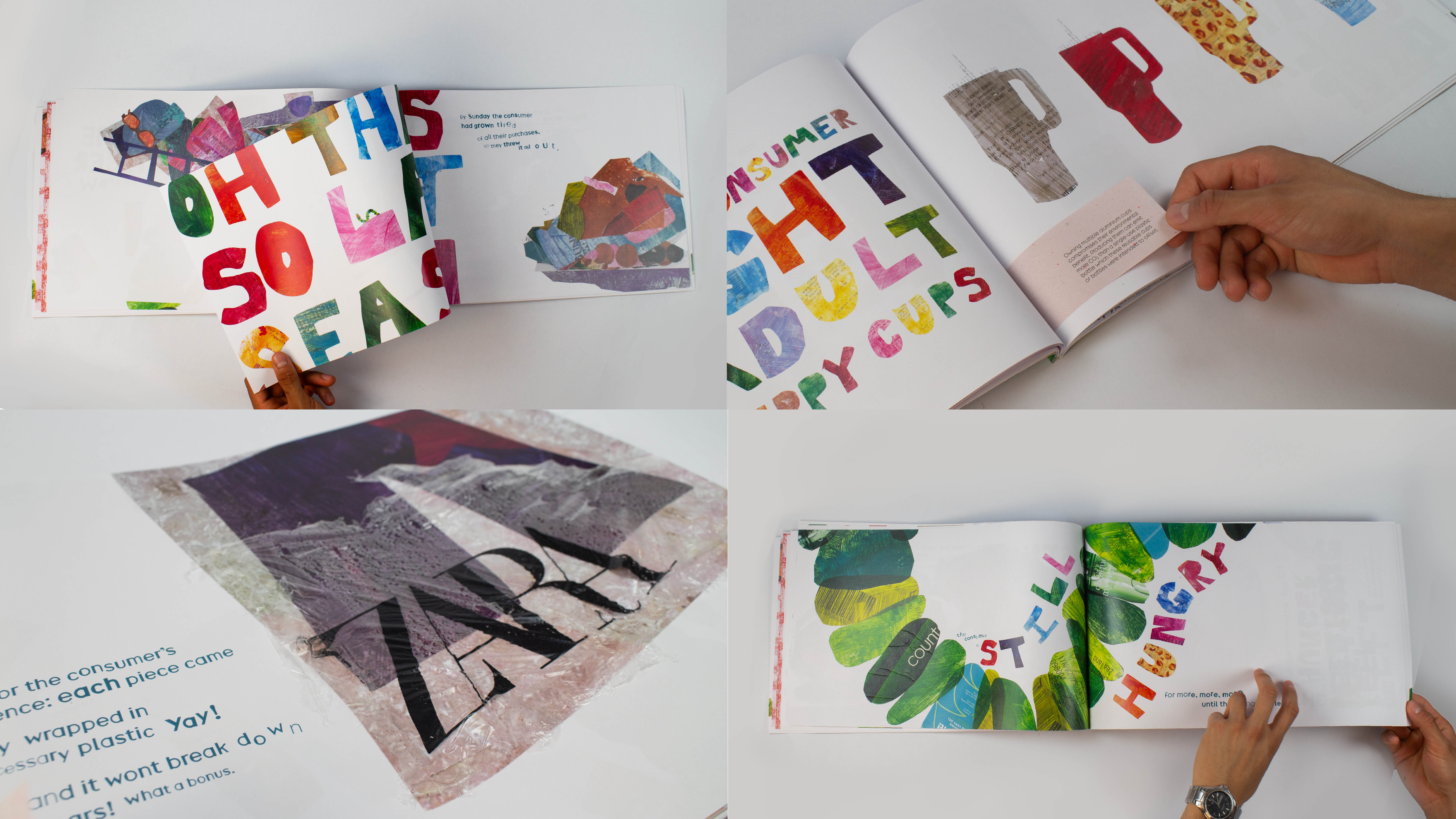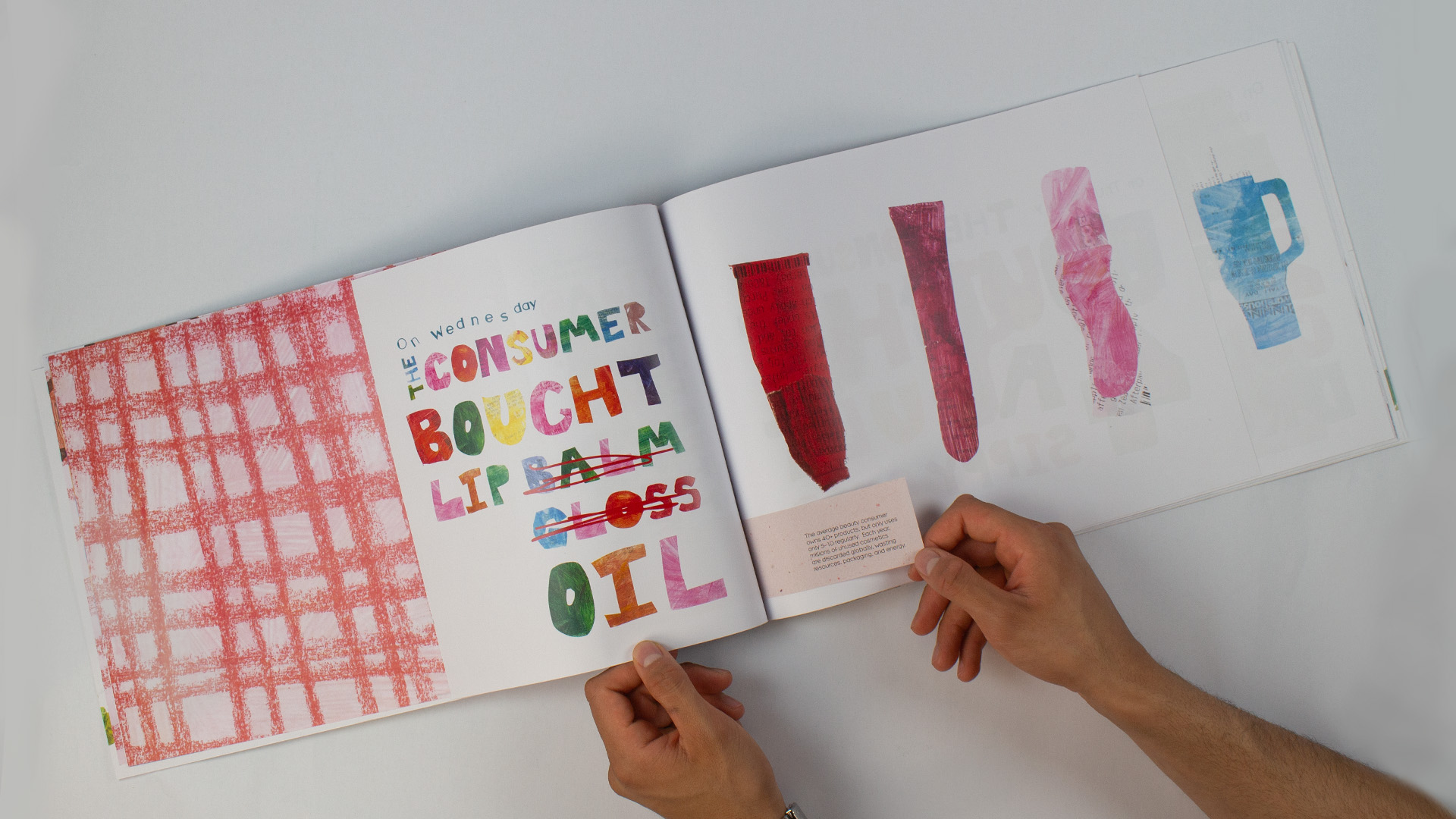 This project addresses topics of consumer culture and sustainability. I’ve readapted the popular children’s storybook ‘The Very Hungry Caterpillar’ by Eric Carle, employing Narrative Persuasion, utilising techniques of readaptation and parody, to bring attention to and critique normalised consumer behaviours in society, and ultimately encourage a shift surrounding consumer habits.