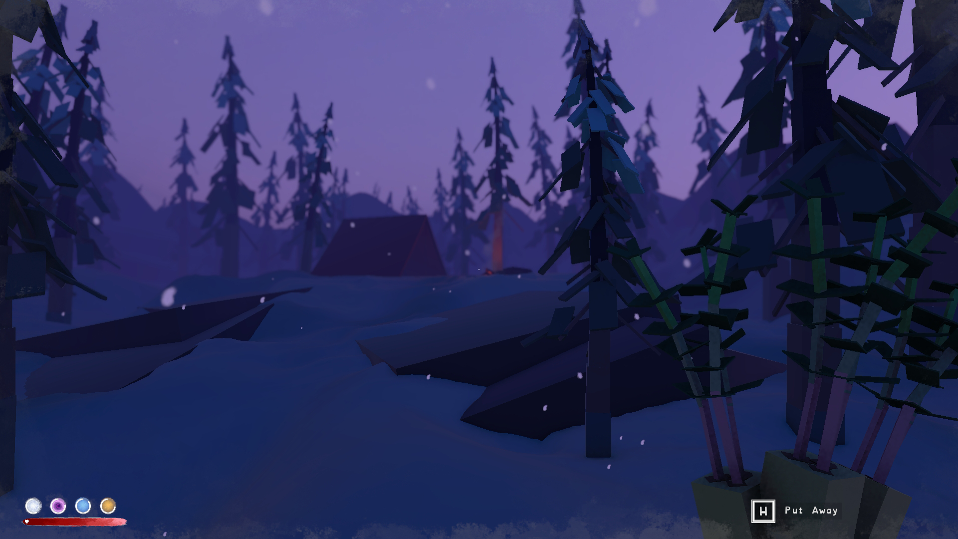 The Lonely Mountain, a winter survival game, designed to provide solace and comfort to players seeking a solitary, reflective gaming experience. This project was developed around the research question “How can I design a survival game that uses mechanics to create a sense of isolation that feels comforting rather than ‘eerie’?”.