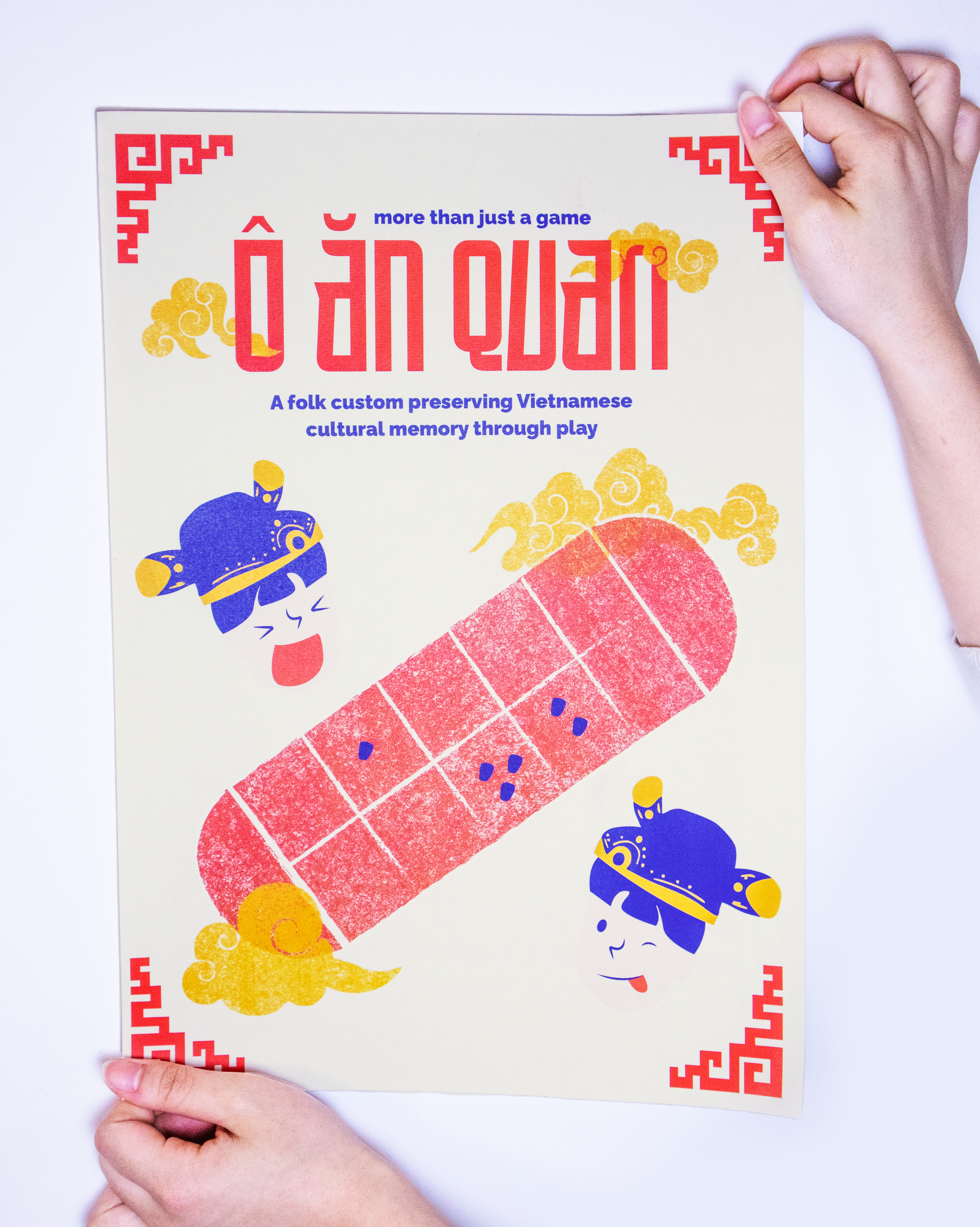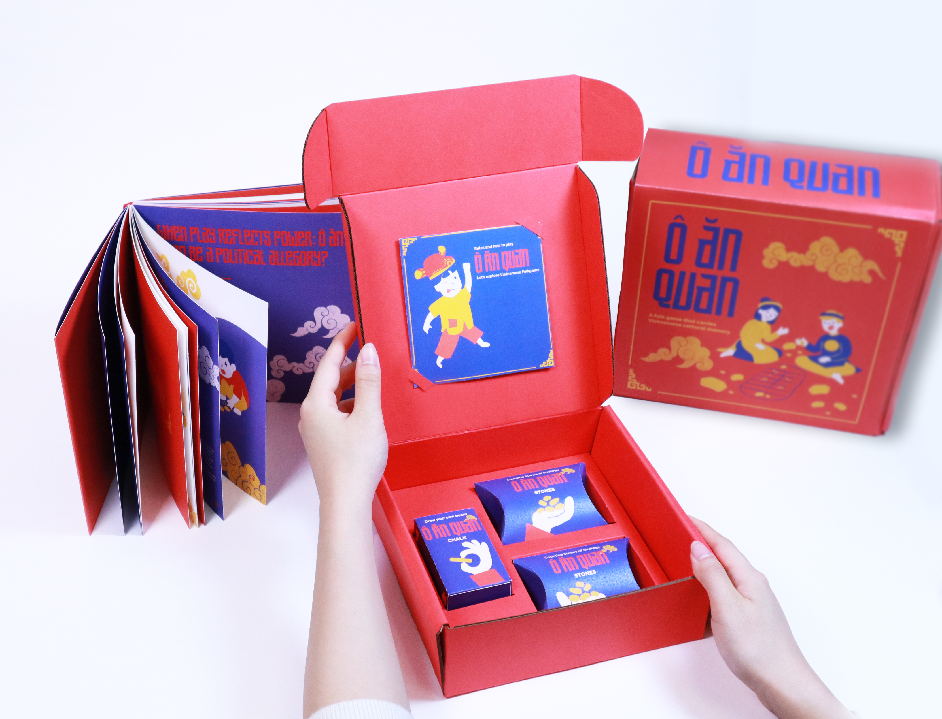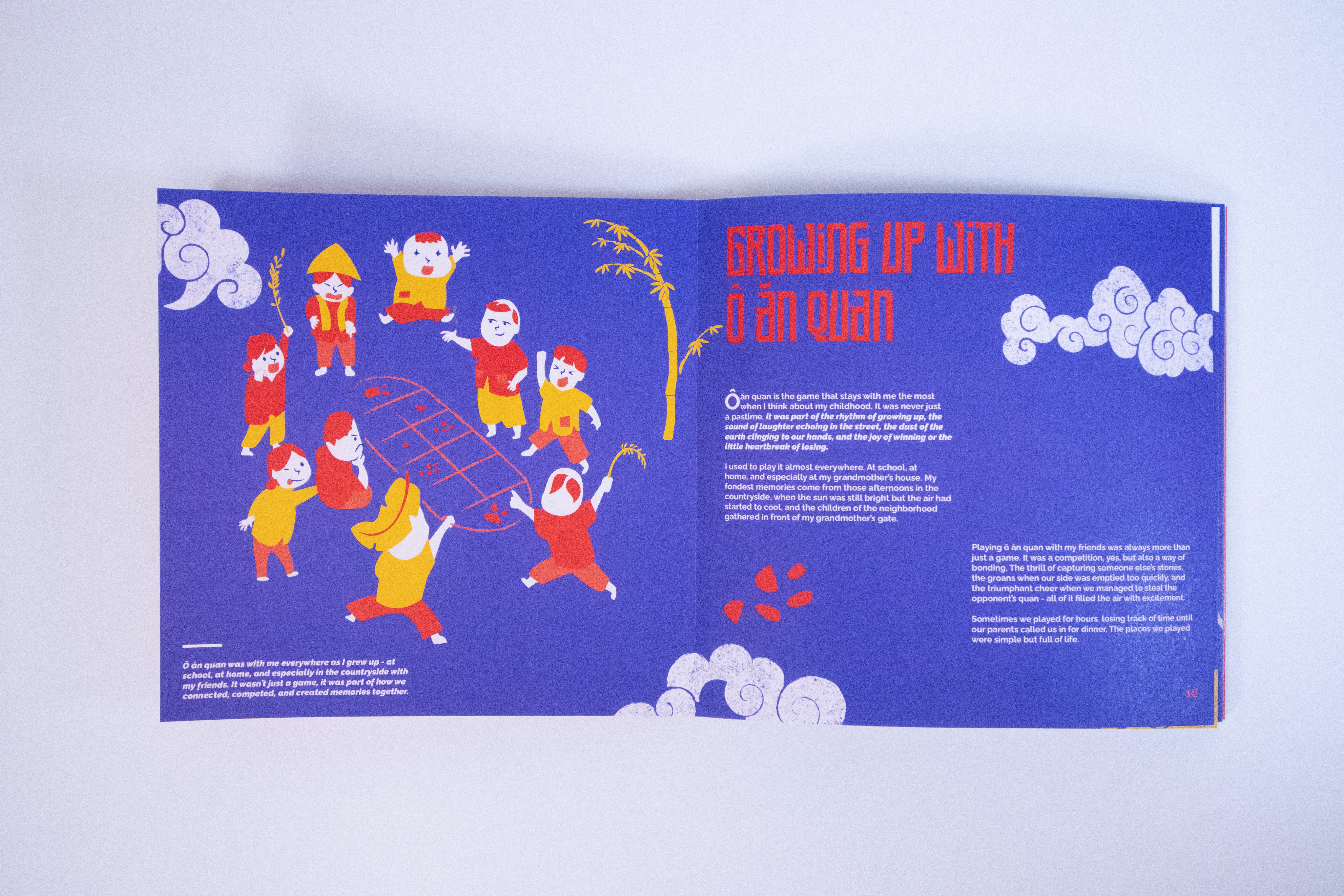 My project looks at how design can help keep Vietnamese folk culture alive and give it a new look through the traditional game O an quan. I wanted to find a way to make this game meaningful and fun for younger people again, as it slowly fades from everyday life. I want to reconnect people with cultural traditions by making O an quan into something fun, educational, and long-lasting. I use cultural research, fun drawings, and eco-friendly design to give this old but fading part of Vietnamese heritage a modern twist. The result is an illustrated book and packaging that honours traditional values while introducing the game to new people in Aotearoa.
