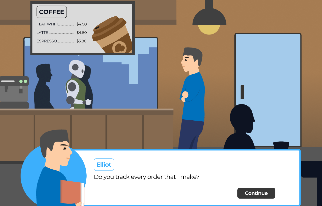 What drove my design was my interest and the question of where authorship sits when influenced by unseen algorithms. I used speculative world-building, storyboarding, interface design, and branching dialogue to try and make AI’s presence felt rather than shown. Small animated sequences and visual cues were used to create atmosphere and guide interaction.