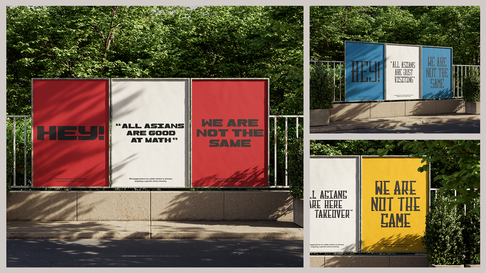 Microaggressions have become an overlooked issue, especially towards the Asian community, with many people unaware of the lasting impact that a simple phrase can leave. This project will focus on using typeface design to deliver the awareness messaging through a typography-led physical and digital campaign. Focusing on utilising the origins of Asian discrimination and stereotyping like propaganda as a reference, the typeface will serve as a reminder not to let history repeat itself. While this project will never be a cure to this problem, it will extend the conversation started by other existing projects and campaigns.